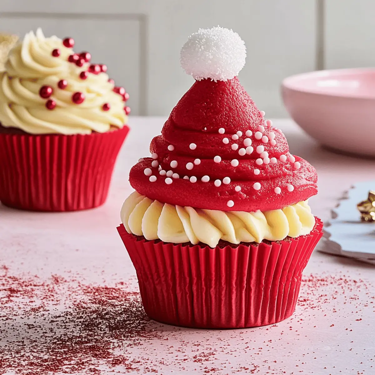 As I unwrapped my holiday decorations last year, a box filled with old Christmas memories spilled open—ornaments, lights, and treasures from gatherings past. Inspired by that nostalgic moment, I decided it was time to create a festive treat that would delight loved ones: Santa Hat and Bauble Cupcakes. Perfect for holiday gatherings, these delightful cupcakes are not only a feast for the eyes but also a treat for the taste buds! With rich, moist chocolate cupcakes topped with fluffy cream cheese icing, they’re surprisingly simple to make. Plus, they bring the joy of holiday spirit to your table while allowing you to showcase your culinary creativity. What festive twist will you add to your own cupcake creations this season? Why Are These Cupcakes a Must-Make? Festive Appeal: These Santa Hat and Bauble Cupcakes are sure to steal the show at any holiday gathering, bringing smiles and cheer to your table. Creative Designs: With adorable designs, they offer a unique way to showcase your baking skills while tapping into the holiday spirit. Easy to Make: Even if you’re not a baking pro, this recipe is designed for success, allowing anyone to create these charming treats effortlessly. Flavorful Indulgence: The rich chocolate flavor paired with creamy cream cheese icing makes each bite a delightful experience—perfect for those bored with fast food. Versatile Options: Want a different twist? Feel free to experiment with flavors or decorations! You could even try similar treats like Ranch Macaroni Cheese for savory fun or decadent White Cake Wow for a sweet alternative. Santa Hat and Bauble Cupcake Ingredients For the Cupcakes Unsalted Butter (250g) – Adds richness and moisture; can be replaced with margarine for a non-dairy version. White Chocolate (150g) – Enhances sweetness and provides a creamy taste; substitute with milk chocolate for flavor variation. Caster Sugar (2 cups) – Sweetens the cupcakes and aids in browning; brown sugar can be used for a deeper flavor. Milk (1 cup) – Provides moisture to the batter; use non-dairy milk for a lactose-free option. Plain Flour (1.5 cups) – Forms the structure of the cupcake; gluten-free flour mix can be used for a gluten-free version. Self-Raising Flour (0.5 cups) – Adds leavening for fluffiness; replace with all-purpose flour and baking powder if unavailable. Table Salt (1/4 tsp) – Enhances flavor; no substitution needed. Vanilla Extract (2 tsp) – Adds flavor depth; almond extract is a great alternative for a different taste. Eggs (2, at room temperature) – Binds the ingredients and adds moisture; substitute with flax eggs for a vegan option. For the Icing Cream Cheese (500g) – Base ingredient for the icing, providing tanginess; substitute with mascarpone for a different flavor. Icing Sugar (3 cups) – Sweetens and thickens the icing; powdered sugar can be substituted if necessary. Red Food Coloring Gel – Used for coloring icing; any gel-based food coloring will work—avoid liquid ones to maintain icing consistency. For Decorating White Chocolate (30g, melted) – Used primarily for decorating; can be omitted if desired. Mixed Gold and Silver Sprinkles (2 cups) – Adds festive flair; any other colored sprinkles can be substituted. Mixed Red, Pink, and White Sprinkles (2 cups) – Used for decorating bauble cupcakes; replace with any seasonal-themed sprinkles if preferred. These Santa Hat and Bauble Cupcakes are sure to bring festive joy to your holiday gatherings! Step‑by‑Step Instructions for Santa Hat and Bauble Cupcakes Step 1: Preheat and Prepare Begin by preheating your oven to 160°C (140°C for fan-forced). Line your muffin pans with cupcake liners, ensuring they fit snugly. This step is crucial as it prepares the environment for baking these delightful Santa Hat and Bauble Cupcakes evenly, ensuring they rise beautifully without sticking to the pan. Step 2: Melt the Base Ingredients In a medium saucepan, melt together the unsalted butter, white chocolate, caster sugar, and milk over low heat. Stir gently until everything is completely melted and well-combined, about 5–7 minutes. Once melted, remove the mixture from the heat and allow it to cool slightly, preparing it for the next steps in creating your festive cupcakes. Step 3: Combine Dry Ingredients In a large mixing bowl, combine the plain flour, self-raising flour, and table salt. Mix thoroughly to ensure the baking powder is evenly distributed. This step is essential for achieving the perfect texture in your cupcakes, so whisk until the ingredients are well-blended, ready to meet the delicious melted mixture for our Santa Hat and Bauble Cupcakes. Step 4: Mix Wet and Dry Ingredients Pour the cooled butter and chocolate mixture into the bowl with your dry ingredients, adding the vanilla extract and eggs (at room temperature). Use a whisk to gently blend everything until just combined, taking care not to overmix. You want a smooth batter that is light and airy, which will bake into fluffy cupcakes. Step 5: Bake the Cupcakes Divide the batter evenly into the prepared muffin pans, filling each liner approximately two-thirds full. Place them in the preheated oven and bake for 30–35 minutes, or until a skewer inserted into the center comes out clean. Once baked, allow them to cool in the pans for 10 minutes before transferring them to a wire rack to cool completely. Step 6: Prepare the Cream Cheese Icing In a mixing bowl, beat the cream cheese and remaining unsalted butter until fluffy, around 3–5 minutes. Gradually add the icing sugar, continuing to mix until smooth and creamy. Reserve half of the icing for decorating later and mix in the red food coloring gel into the other half to create a vibrant red for the Santa hats. Step 7: Pipe the Santa Hats Using a piping bag fitted with a star tip, pipe the red icing in a swirling motion on half of the cooled cupcakes, creating a delightful Santa hat shape. Once piped, decorate the tops with white icing stars 