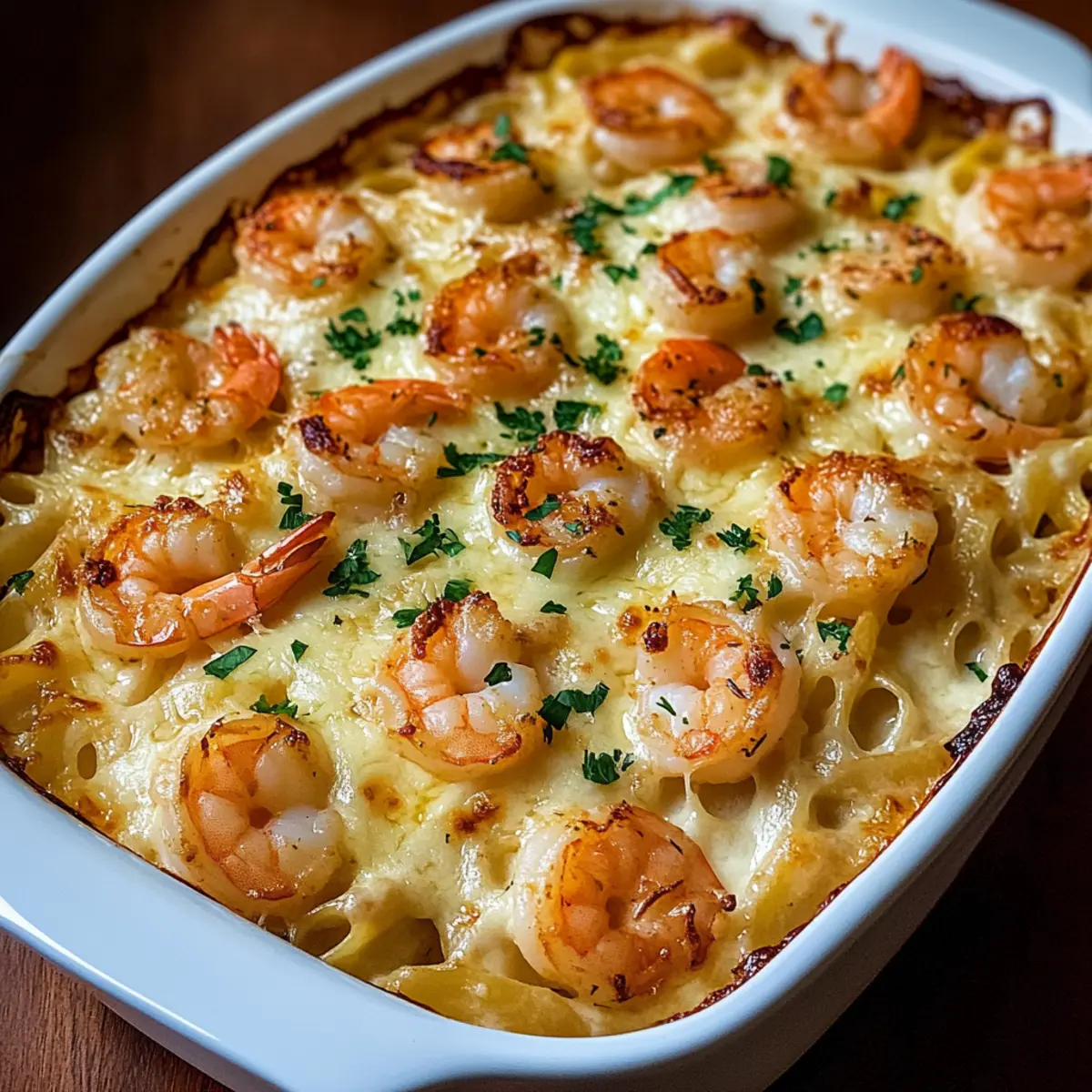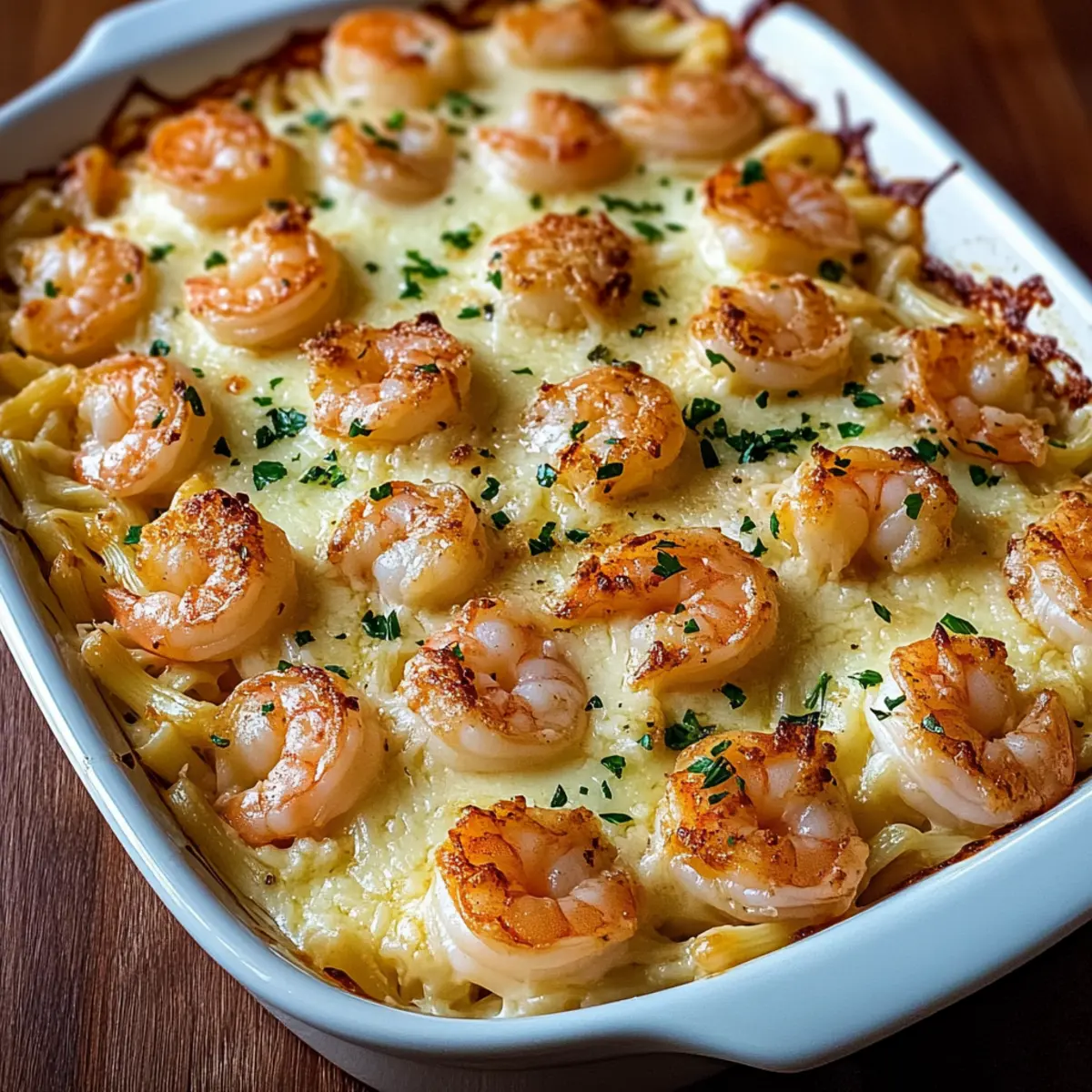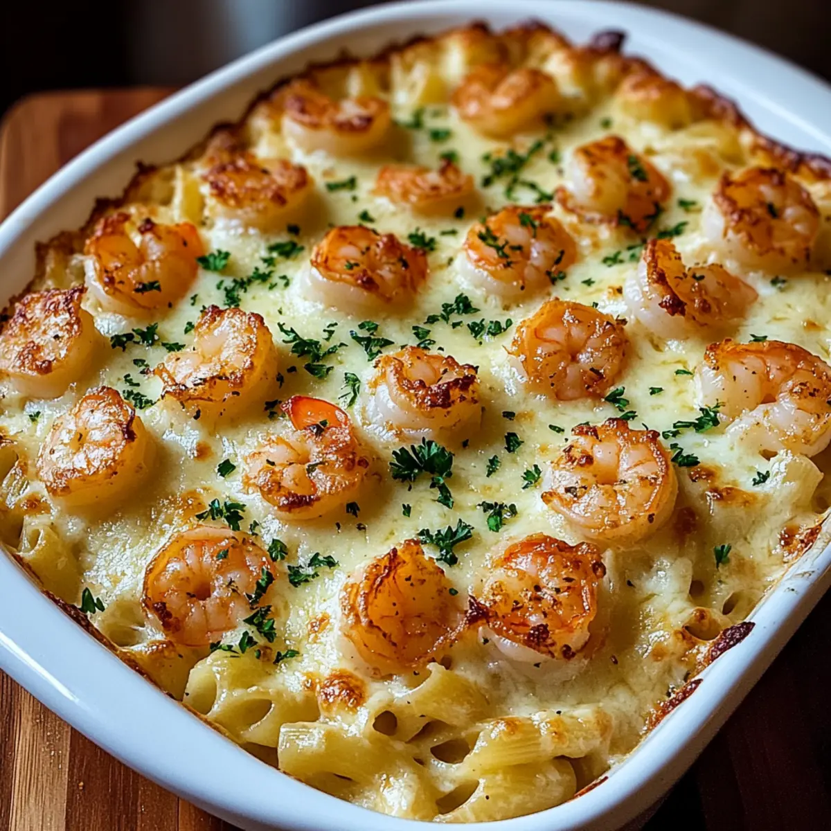 The scent of garlic wafting through the air immediately transports me to cozy evenings spent in my kitchen, surrounded by loved ones. That’s exactly the vibe you’ll get with my Shrimp Scampi Pasta Bake, a dish that combines the indulgent flavors of shrimp scampi with the heartwarming comfort of baked pasta. In just one dish, you’ll find juicy shrimp nestled in a creamy garlic-butter sauce, made irresistible by gooey mozzarella and sharp Parmesan. This family-friendly recipe is not only a perfect weeknight dinner solution, but it also makes for an impressive showstopper at gatherings. Better yet, it’s make-ahead and freezer-friendly, so you can whip it out when the craving strikes! Ready to dig into some comfort on a plate? Why is Shrimp Scampi Pasta Bake Amazing? Family-Friendly Delight: This dish is a guaranteed hit for kids and adults alike, making weeknight meals easy and enjoyable. Make-Ahead Marvel: Prep it in advance, pop it in the oven later, and you’ve got a hassle-free dinner that impresses! Creamy, Flavorful Sauce: The luscious garlic-butter sauce binds together the shrimp and pasta, creating a comforting experience you won’t forget. Versatile Variations: Customize with your favorite veggies or cheeses, ensuring everyone at your table finds their perfect bite. If you’re in the mood for something equally delicious, check out my Seafood Lasagna Shrimp for another crowd-pleaser! Freezer-Friendly Option: Leftovers can be frozen with ease, offering a convenient solution for busy days. Serve alongside a light salad or crispy garlic bread for the complete experience! Shrimp Scampi Pasta Bake Ingredients Here’s everything you’ll need to create this delicious Shrimp Scampi Pasta Bake! For the Pasta • Pasta – (Linguine or spaghetti works best; penne or gluten-free are great alternatives.) For the Shrimp • Shrimp – (Use large, peeled and deveined shrimp for the best flavor and texture; fresh or thawed frozen is perfect.) For the Sauce • Olive Oil – (3 tablespoons adds flavor; substitute with vegetable oil if preferred.) • Butter – (4 tablespoons, divided for the sauce richness; unsalted is best for seasoning control.) • Garlic – (5 cloves, minced for that essential flavor; fresh garlic yields the best aroma.) • Crushed Red Pepper Flakes – (¼ teaspoon adds a touch of heat; omit for a milder dish.) • Dry White Wine – (½ cup enhances the scampi flavor; chicken broth can be used if avoiding alcohol.) • Lemon Juice – (Juice of 1 lemon, about 2 tablespoons, for brightening the dish; fresh is ideal.) • Lemon Zest – (1 teaspoon intensifies the citrus flavor; use a microplane for a fine zest.) For the Cheese • Parmesan Cheese – (½ cup, grated for depth; fresh is better for melting.) • Mozzarella Cheese – (1 cup, shredded ensures a gooey texture; feel free to swap based on preference.) For the Garnish • Fresh Parsley – (¼ cup, chopped for a pop of color; can substitute with chives or omit completely.) • Salt and Black Pepper – (To taste for seasoning; essential for balancing flavors.) With these fresh ingredients, your Shrimp Scampi Pasta Bake will be a comforting meal that your family will adore! Step‑by‑Step Instructions for Shrimp Scampi Pasta Bake Step 1: Cook Pasta Begin by bringing a large pot of salted water to a rolling boil. Add your linguine or spaghetti and cook until al dente, about 8-10 minutes. Once done, drain the pasta, then drizzle a bit of olive oil to keep it from sticking together. Set aside to cool while you prepare the shrimp and sauce for the Shrimp Scampi Pasta Bake. Step 2: Sauté Shrimp In a large skillet, heat 3 tablespoons of olive oil along with 2 tablespoons of butter over medium heat. Season the large, peeled, and deveined shrimp with salt and black pepper. Sauté the shrimp until they turn pink and opaque, about 1-2 minutes per side. Remove them from the skillet and set aside, allowing residual flavors to build for the sauce. Step 3: Make Garlic Butter Sauce In the same skillet, melt the remaining 2 tablespoons of butter over medium heat. Add minced garlic and optional crushed red pepper flakes, sautéing until fragrant, about 1 minute. Pour in ½ cup of dry white wine (or chicken broth) and the juice of one lemon. Simmer for 2-3 minutes, letting the sauce reduce slightly while stirring gently, until it thickens. Step 4: Combine Pasta & Shrimp Add the cooked pasta directly into the skillet, tossing it in the garlic butter sauce to absorb all the flavors. Stir in half of the shredded mozzarella and grated Parmesan cheese until they melt together, then fold in the sautéed shrimp. Ensure everything is well combined, soaking your Shrimp Scampi Pasta Bake mixture in that rich sauce. Step 5: Bake Preheat your oven to 375°F (190°C) while you prepare your baking dish. Transfer the shrimp and pasta mixture to a greased baking dish. Top it generously with the remaining mozzarella and Parmesan cheese. Bake in the hot oven for about 15 minutes, or until the cheese is melted and bubbling, creating a golden brown crust on top. Step 6: Serve Once baked, remove your Shrimp Scampi Pasta Bake from the oven and let it cool for a few minutes. Garnish with freshly chopped parsley and a squeeze of lemon for added brightness. Serve this delicious dish hot, and watch as your family gathers around for a comforting meal that everyone will adore! What to Serve with Shrimp Scampi Pasta Bake? Set the table for a delightful experience, where every bite of your baked masterpiece can be paired with something scrumptious! Crisp Green Salad: A refreshing mix of greens, tomatoes, and a light vinaigrette enhances the buttery pasta while adding brightness. It makes for a perfect balance of flavors. Garlic Bread: Golden, buttery garlic bread is a fantastic side for scooping up any sauce left on your plate. The crispy exterior and soft center offer a comforting texture contrast. Roasted Vegetables: Seasoned with olive oil and
