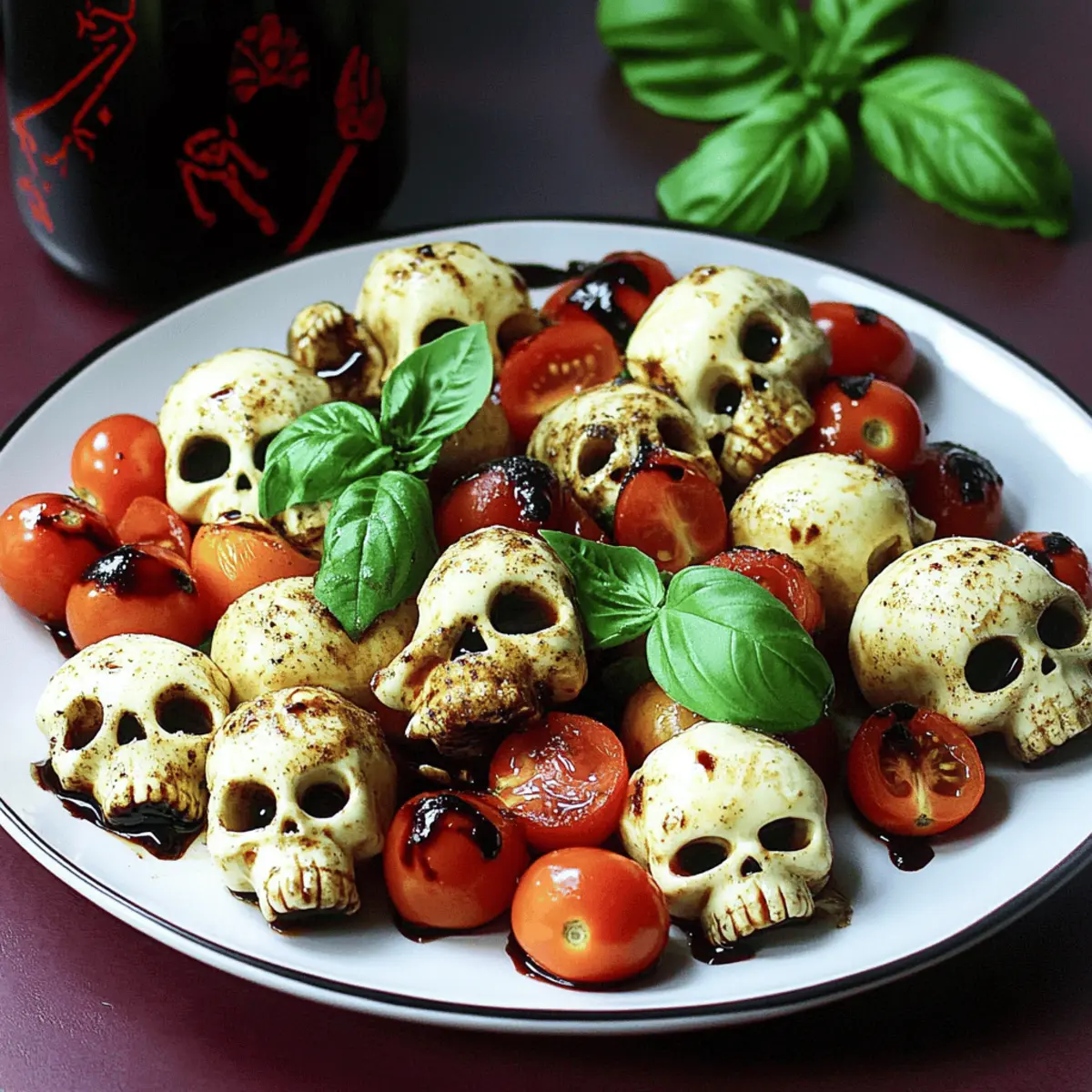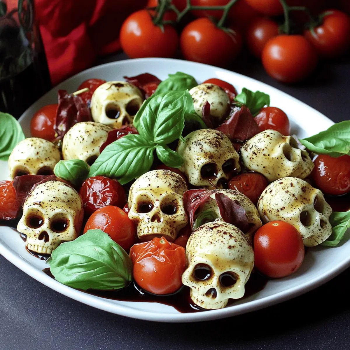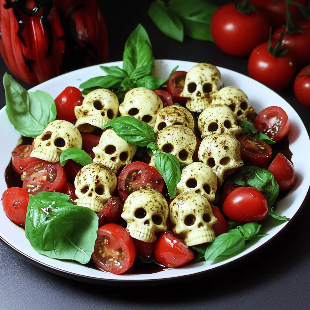 As the autumn chill creeps in, my mind turns to gatherings filled with laughter and delicious treats. This year, I wanted to conjure up something a little different for Halloween festivities—so I developed a Spooky Skull Caprese Salad that’s both creepy and captivating. This playful twist on the classic Italian favorite combines fresh mozzarella, juicy cherry tomatoes, and fragrant basil in a way that’s not just refreshingly delicious but also deeply intriguing. Designed to be a showstopper at any Halloween party, it’s quick to prepare, taking only minutes to assemble. Plus, this vegetarian, low-carb, and gluten-free dish will delight not just your taste buds but also your creative spirit. Ready to elevate your Halloween menu with a frightfully fun appetizer? Let’s dive into the details! Why Will You Love This Salad? Creativity Unleashed: This Skull Caprese Salad presents a unique twist that’ll impress your guests at Halloween gatherings. Quick to Assemble: Enjoy a stress-free preparation as this dish comes together in mere minutes. Health-Conscious Choice: With vegetarian, low-carb, and gluten-free options, it suits a variety of dietary needs, much like our Quinoa Crunch Salad. Vibrant Flavors: The combination of fresh basil, creamy mozzarella, and ripe tomatoes ensures every bite is burst with flavor. Halloween Fun: It’s a great conversation starter that adds a spooky yet sophisticated touch to your spread, perfect alongside a Bang Shrimp Salad. Make-Ahead Friendly: Prepare the mozzarella skulls in advance and assemble them just before serving for ultimate freshness! Skull Caprese Salad Ingredients • Discover the delightful components of this spooky dish! For the Skull Molds Fresh Mozzarella Pearls – These creamy bites are essential for creating your spooky skulls; feel free to substitute with a block of mozzarella if needed. Cherry Tomatoes – Sweet and colorful, they bring balance—darker varieties like black cherry add a haunting twist! For the Dressing Olive Oil – A drizzle enhances richness and moisture, perfect for complementing the flavors. Balsamic Vinegar – It provides acidity with a hint of sweetness; you can use balsamic glaze for an extra touch of flavor. Salt and Black Pepper – Essential for seasoning; adjust to taste for a burst of savory goodness! For the Garnish Fresh Basil Leaves – These aromatic leaves brighten up the dish; consider using purple basil for a more gothic touch! Enjoy crafting this Skull Caprese Salad that’s as delicious as it is delightful! Step‑by‑Step Instructions for Skull Caprese Salad Step 1: Prepare the Mozzarella Skulls Start by placing fresh mozzarella pearls into skull molds, ensuring they are snug but not overly packed. Set your microwave to medium power and heat the mozzarella for 20-30 seconds, just until they soften, avoiding any melting. This step is crucial for achieving that spooky skull shape. Step 2: Firm Up the Skulls Once you’ve softened the mozzarella, carefully press the cheese into the skull molds to create a distinct shape. After molding, place the filled molds in the refrigerator for about 10 minutes. This chilling time allows the mozzarella to firm up, ensuring your Skull Caprese Salad looks perfect when served. Step 3: Combine Tomatoes and Cheese While the mozzarella chills, slice your cherry tomatoes in half for a burst of flavor. In a spacious mixing bowl, combine the chilled mozzarella skulls with the halved tomatoes. The contrasting colors and textures will start to create the lively essence of your Skull Caprese Salad. Step 4: Dress the Salad Drizzle olive oil and balsamic vinegar over the combination of mozzarella and tomatoes in the bowl. Use just enough to coat the ingredients lightly, enhancing their natural flavors without overwhelming them. Gently toss the mixture so that the dressing envelops each piece, ensuring a harmonious blend. Step 5: Plate and Season Transfer your beautifully mixed Skull Caprese Salad onto a decorative serving plate. For an extra touch of flavor, sprinkle with salt and black pepper according to your taste preferences. The seasoning highlights the freshness of the ingredients and adds depth to the spooky presentation. Step 6: Garnish with Basil To finish, top your Skull Caprese Salad with an assortment of fresh basil leaves. You can mix green and purple basil for an even more dramatic and gothic-looking dish. This not only elevates the visual appeal but also infuses the salad with fragrant herbal notes, making it irresistible for your Halloween gathering. Skull Caprese Salad Variations Feel free to customize your Skull Caprese Salad for even more fun and flavor! Black Olive Garnish: Add sliced black olives on top for a striking and savory finishing touch. Their dark color complements the spooky vibe beautifully. Herb Medley: Incorporate additional herbs like tarragon or dill to elevate the freshness; it adds a delightful twist to the familiar flavors. Spicy Kick: Toss in a pinch of red pepper flakes for a bit of heat—it’ll surprise your guests in the best way! Different Cheeses: Swap out mozzarella for a smoky burrata for a rich and creamy experience, or try feta for a tangier taste. Each cheese brings its own charm to the dish. Vinegar Alternatives: Experiment with different vinegars such as apple cider or white wine vinegar; each will offer a unique flavor profile that’s equally delicious. Colorful Tomatoes: Use an array of heirloom tomatoes for a rainbow effect that captures the spirit of Halloween while enhancing the flavors with their natural sweetness. Garlic-infused Olive Oil: Drizzle garlic-infused olive oil over the salad for a bold flavor boost; it’s a lovely way to enhance the overall aroma. Alternative Molds: For a twist, try using different-shaped molds, like pumpkins or bats, to create a variety of spooky shapes. You’ll delight everyone with some unexpected surprises! Ready to enhance your spooky creation? Pair this delightful salad 