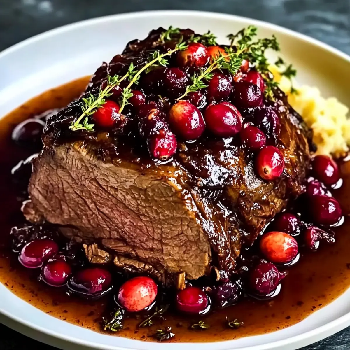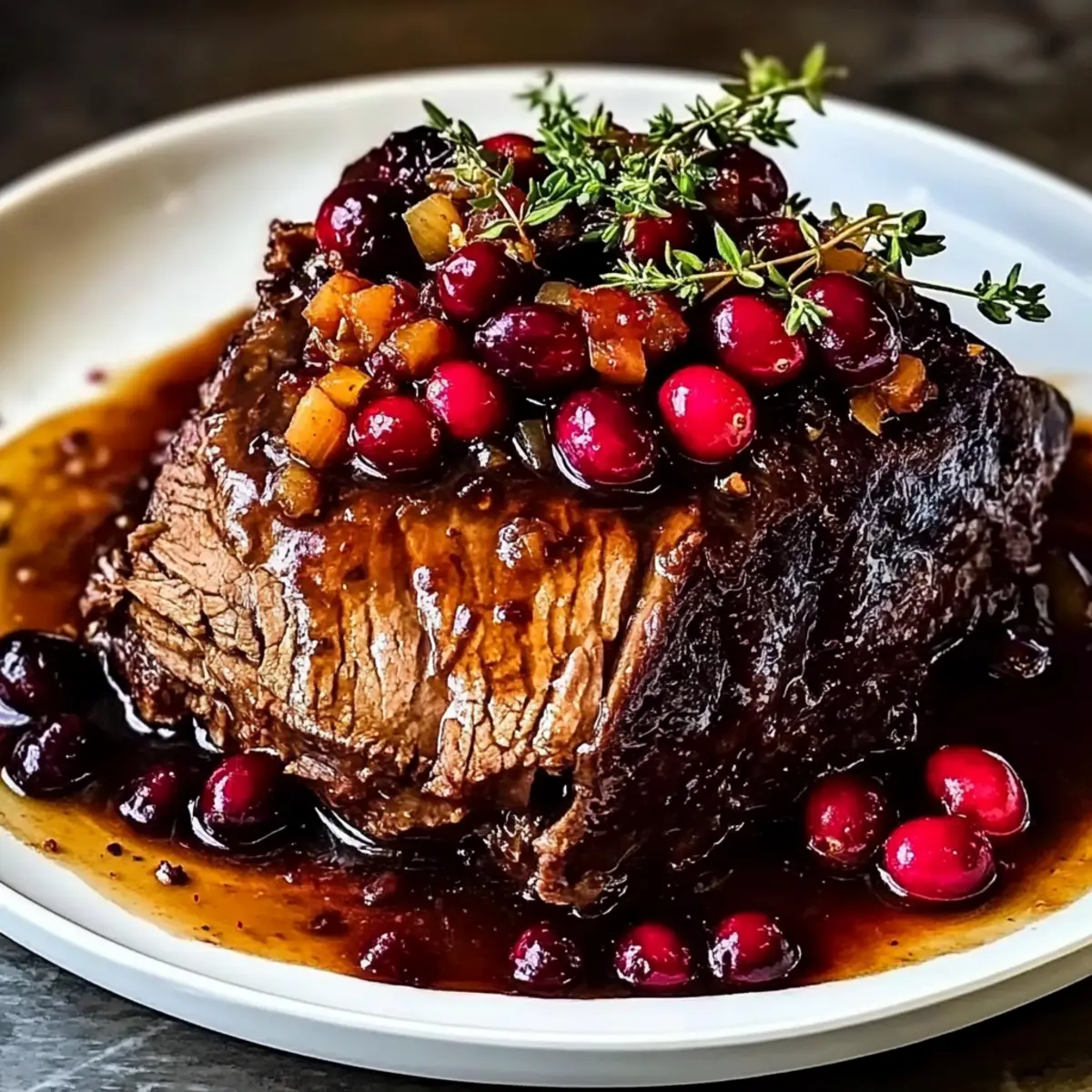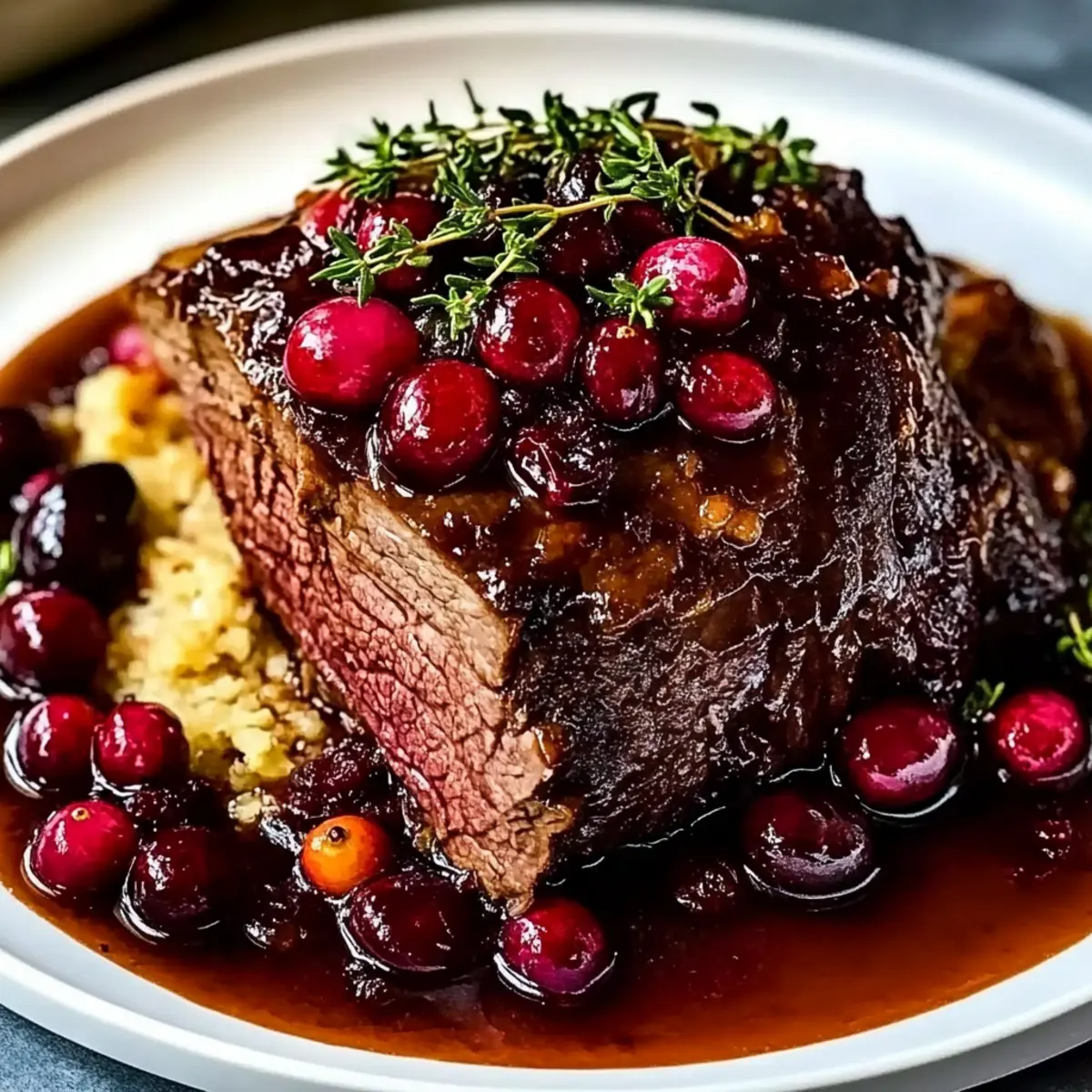 The aroma of slow-cooked beef wafting through the kitchen can be a moment of pure happiness. I always find that cozy nights, especially around the holidays, are best spent gathered around a table with loved ones sharing a hearty meal. This Slow-Braised Beef Roast with Cranberry Balsamic Glaze closely aligns with that sentiment, striking the perfect balance between savory and sweet. Not only is this dish an absolute crowd-pleaser, but it also requires minimal prep time, letting you focus on what really matters—creating lasting memories. Imagine the tender, melt-in-your-mouth beef paired with a tangy glaze that enchants the senses. If you’re eager to bring this comforting recipe into your home, are you ready to get your hands a little messy and savor the warmth of good food? What Makes This Roast So Special? Rich, Comforting Flavor: The Slow-Braised Beef Roast is the quintessence of comfort food; it delivers melt-in-your-mouth tenderness and a glaze that strikes a perfect balance between sweet and savory. Minimal Prep Time: With just a few easy steps, you can set it in the oven and let it work its magic while you enjoy quality time with family or prepare your favorite sides. Versatile Pairing: This dish shines alongside creamy mashed potatoes or sautéed green beans, making it a versatile meal option suitable for any occasion or palate. Crowd-Pleasing Delight: Whether it’s a holiday feast or a cozy family dinner, this roast is sure to impress your guests with its vibrant flavors. Imagine enjoying those precious moments with a plateful of savory goodness that you prepared effortlessly. If you love hearty meals, this one’s a must-try! For more delicious uses of beef, check out Cheesy Ground Beef or indulge in a flavorful spin with Ground Beef Enchiladas. Slow-Braised Beef Roast Ingredients For the Roast • Beef Chuck Roast – A flavorful cut that becomes tender when slow-cooked; you can substitute it with brisket or bottom round roast if needed. • Salt (1½ teaspoons) – Essential for enhancing the beef’s natural flavor; kosher salt works best for texture. • Black Pepper (1 teaspoon) – Adds a warm depth that complements the roast. For the Glaze • Olive Oil (2 tablespoons) – Ideal for searing the roast and creating that delicious crust. • Yellow Onion (1, chopped) – Contributes sweetness and depth to the glaze. • Garlic (4 cloves, minced) – Provides aromatic flavor; never skimp on fresh garlic! • Balsamic Vinegar (½ cup) – Brings tanginess that balances the richness of the beef; perfect for the glaze. • Brown Sugar (3 tablespoons) – Helps to achieve a delightful sweetness that offsets the tart cranberries; maple syrup can be a great substitute. For the Braising Liquid • Beef Broth (2 cups) – This adds moisture and richness during the braising process; low-sodium options are available for better control of saltiness. • Whole Cranberries (1½ cups, fresh or frozen) – These are the star of the glaze, lending a key flavor; dried cranberries can be used but will change the tartness profile. • Fresh Thyme (4-5 sprigs) – Herbaceous notes that enhance the dish; dried thyme (1 teaspoon) works too if fresh isn’t available. • Carrots (optional, peeled and halved) – These add natural sweetness and body to the dish. This Slow-Braised Beef Roast with Cranberry Balsamic Glaze will not only fill your home with warmth but also create a memorable meal for you and your loved ones. Step‑by‑Step Instructions for Slow-Braised Beef Roast with Cranberry Balsamic Glaze Step 1: Preheat the Oven Begin by preheating your oven to 325°F (163°C). This temperature allows the Slow-Braised Beef Roast to cook gently and evenly, ensuring that all the flavors meld beautifully. It’s important to get this step right, as a properly heated oven will greatly contribute to the dish’s overall success. Step 2: Prepare the Roast Pat the beef chuck roast dry using paper towels, ensuring there’s no excess moisture. Generously season the meat on all sides with salt and black pepper, creating a flavorful crust that enhances the overall taste. This simple seasoning will draw out the natural juices and add depth to your slow-braised roast. Step 3: Sear the Beef In a large Dutch oven, heat 2 tablespoons of olive oil over medium-high heat. Once the oil is shimmering, carefully add the seasoned beef roast to the pot. Sear the meat on all sides until it reaches a rich, golden-brown color, about 8-10 minutes total. This step is crucial for developing deep flavors in your final dish. Step 4: Sauté the Aromatics After searing the roast, carefully remove it from the pot and set it aside. In the same pot, add one chopped yellow onion, stirring frequently until softened and translucent, about 3-5 minutes. Then, add 4 minced garlic cloves, cooking for an additional minute until fragrant. These aromatics will build a flavorful base for your sauce. Step 5: Create the Deglaze Pour in ½ cup of balsamic vinegar to deglaze the pot, scraping up any browned bits from the bottom. This adds incredible flavor to the dish. Stir in 2 cups of beef broth and 3 tablespoons of brown sugar, blending everything well. Let this mixture simmer briefly to combine the flavors before returning the roast to the pot. Step 6: Add the Final Ingredients Return the beef chuck roast back into the pot, nestling it among the softened onions and garlic. Now, add 1½ cups of whole cranberries, 4-5 sprigs of fresh thyme, and optional halved carrots for added sweetness. The cranberries will contribute their unique tartness to the glaze, making each bite delightful. Step 7: Braise the Roast Cover the Dutch oven with its lid, ensuring it fits snugly to retain moisture. Place the pot in the preheated oven and let the Slow-Braised Beef Roast cook for 3 to 3.5 hours. You’ll know it’s ready when the meat is fork-tender and easily pulls apart, emitting a heavenly aroma that fills your kitchen. Step 8: Rest and Prepare the G
