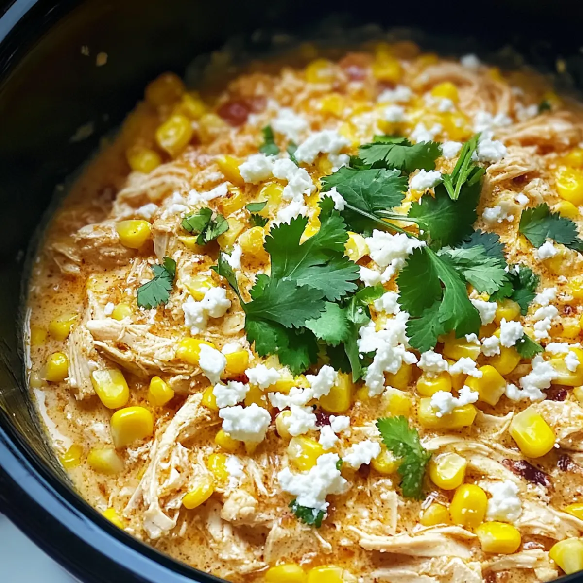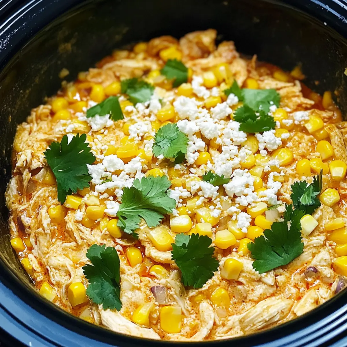 The scent of sizzling spices wafts through my kitchen as I prepare for a cozy night in. My Slow Cooker Street Corn Chicken has become a cherished family favorite, offering a delightful fusion of creamy comfort and zesty Mexican flavors that’s perfect for those busy evenings. This dish not only comes together with minimal effort, but it also brings everyone to the table with its hearty warmth and deliciousness. Imagine tender chicken enveloped in a velvety sauce, reminiscent of your favorite street food, yet effortlessly prepared in a slow cooker. Plus, it’s versatile enough for anyone to customize with their favorite toppings or substitutes! Are you ready to dive into a bowl of comfort that feels like a fiesta? Let’s get cooking! Why is Slow Cooker Street Corn Chicken a Must-Try? Irresistible Comfort: The creamy texture of this dish feels like a warm hug, making it perfect for family dinners. Bold Flavors: The mix of Tajin and chili powder brings a touch of zest that will tantalize your taste buds and make every bite memorable. Effortless Cooking: With the slow cooker doing all the hard work, you can spend more time enjoying with your loved ones. Versatile Delight: Dress it up with your favorite toppings like jalapeños and cotija cheese or serve it as a filling for burritos—versatility at its best! For another family-friendly option, consider trying my Bang Bang Chicken or the comforting Honey Bourbon Chicken. You’ll love how easy and delicious they are! Slow Cooker Street Corn Chicken Ingredients For the Chicken Base • Boneless, Skinless Chicken Thighs – This is the best protein choice for slow cooking, keeping the meat juicy and tender. • Onion – Adds a natural sweetness and depth as it caramelizes in the cooker. • Garlic – Fresh garlic intensifies the aromatic flavor, elevating the dish beautifully. For the Seasoning • Tajin Seasoning – This brings a delightful tang and heat; feel free to adjust based on your spice preference. • Chili Powder – Add to taste for that smoky warmth that enhances the overall flavor profile. • Kosher Salt and Pepper – Essential for proper seasoning; always adjust to your liking. For the Creaminess • Corn Kernels – Sweet corn adds texture; use drained canned corn for convenience. • Rotel Tomatoes with Green Chiles – Offers a zesty kick and moisture; substitute with diced tomatoes and chopped chiles if needed. • Sour Cream – Contributes to the creamy texture; Greek yogurt can be used as a lighter alternative. • Plain Greek Yogurt (or Mayo/Cottage Cheese) – Enhances creaminess; choose according to what you have on hand. For Garnishing • Chopped Cilantro – Fresh and fragrant, add it for that extra burst of flavor. • Cotija Cheese – Adds a salty creaminess; feel free to swap with feta or queso fresco for a different twist. Optional Toppings • Jalapeños – Spice things up with sliced jalapeños as a zesty garnish. • Crushed Fritos or Tortilla Chips – These can provide a delightful crunch when served. • Hot Sauce – Add for an extra kick if you like your meals spicy! Each ingredient in this Slow Cooker Street Corn Chicken recipe contributes to making it a true family favorite. Enjoy the journey of flavors as you whip this dish up! Step‑by‑Step Instructions for Slow Cooker Street Corn Chicken Step 1: Prepare the Base Begin by placing the boneless, skinless chicken thighs into the slow cooker. Add the diced onion and minced garlic on top of the chicken. Season everything generously with Tajin, chili powder, kosher salt, and pepper. This enticing blend will create a flavorful base for your Slow Cooker Street Corn Chicken. Step 2: Cook the Chicken Cover the slow cooker with its lid and set it to cook on low for 6 hours. If you’re short on time, you can also set it on high for 3 to 4 hours. You’ll know it’s ready when the chicken becomes tender and easily shreds with a fork, absorbing all those fabulous spices. Step 3: Add Creamy Ingredients Once the chicken is cooked, it’s time to add more flavor! Carefully stir in the drained corn kernels, Rotel tomatoes, sour cream, and Greek yogurt into the slow cooker. Mix everything well to combine these creamy ingredients with the chicken, and return the lid for an additional 1 to 2 hours on low. This will ensure the flavors meld beautifully. Step 4: Final Touches Before diving in, give the Slow Cooker Street Corn Chicken a final stir to mix all the ingredients thoroughly. Taste and adjust seasoning if needed. If you’re feeling festive, consider garnishing with extra Tajin, chopped cilantro, and crumbled cotija cheese right before serving, adding an explosion of flavor and texture. Step 5: Serve and Enjoy Scoop generous portions of the creamy Slow Cooker Street Corn Chicken into bowls or serve it over fluffy rice or warm tortillas. For an extra kick, go wild with optional toppings like jalapeños, crushed Fritos, or your favorite hot sauce. Gather around the table and enjoy the warmth of this comforting dish with family and friends. Make Ahead Options These Slow Cooker Street Corn Chicken preparations are perfect for busy home cooks looking to save time during hectic weeknights! You can prep the chicken, onion, and garlic mixture up to 24 hours in advance by combining them in the slow cooker along with the spices—just refrigerate until you’re ready to cook. For added convenience, you can also mix the creamy ingredients (corn, Rotel, sour cream, and Greek yogurt) and store them separately for up to 3 days. When it’s time to enjoy your meal, simply combine everything in the slow cooker and cook on low as directed. This ensures your dish remains just as delicious and flavorful, while making your meal planning a breeze! How to Store and Freeze Slow Cooker Street Corn Chicken Fridge: Store leftovers in an airtight container for up to 3-4 days. The creamy sauce holds up beautifully, ensuring tasty meals throughout the week. Freezer: Portion out t
