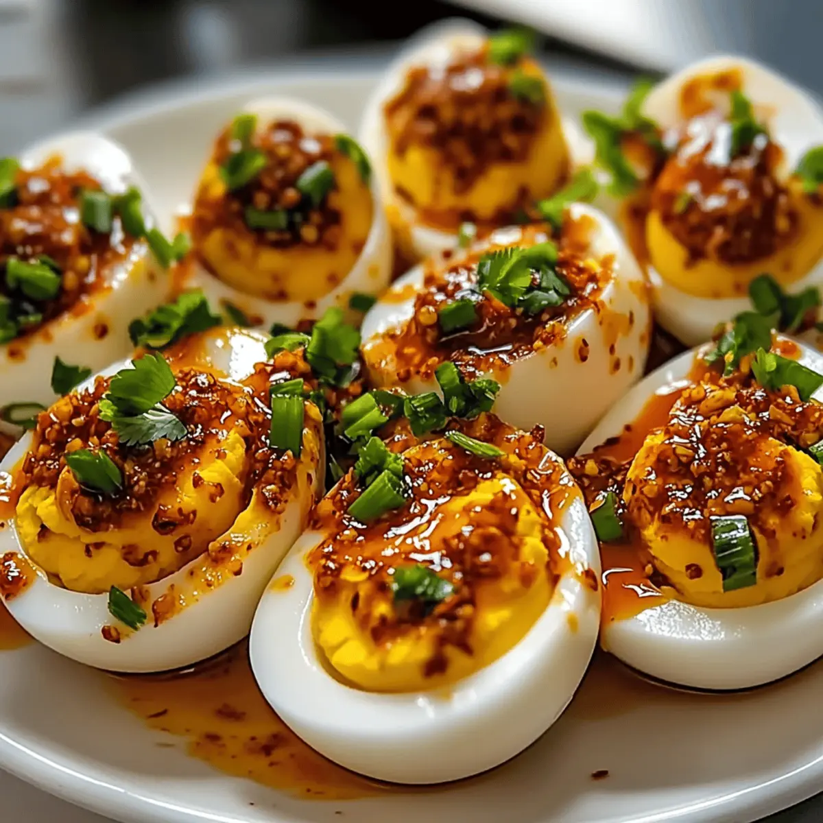Picture this: it’s a sunny Sunday afternoon, and I’m busy prepping for a family gathering. Amid the laughter and chatter, I decide to spice things up with a twist on a classic favorite—Spicy Chili Garlic Deviled Eggs. This recipe is not just about bringing heat to the table; it’s the perfect blend of creamy deliciousness and customizable spice levels that lets each guest experience their ideal flavor. And the best part? In just 25 minutes, you’ll impress your friends and family with a crowd-pleaser that’s gluten-free and packed with protein. Whether you want a mild kick or a fiery explosion, these deviled eggs are the ultimate appetizer for any occasion. So, are you ready to take your appetizer game to a whole new level? Let’s dive into the recipe! Why Are You Going to Love These Deviled Eggs? Bold flavors: Infused with spicy chili garlic sauce, each bite is bursting with taste, perfectly balancing rich creaminess and heat. Customizable spice levels: Whether you like it mild or fiery, this recipe allows you to adjust heat according to your preference. Healthy alternatives: You can swap mayonnaise for creamy avocado or Greek yogurt, making these deviled eggs a nutritious choice. Quick to whip up: In just 25 minutes, you can create an impressive appetizer that will wow your guests! Perfect party snack: These Spicy Chili Garlic Deviled Eggs are ideal for gatherings, bringing joy and excitement to any event, from BBQs to game days! Make-ahead option: Prepare the filling a day in advance for a stress-free entertaining experience, just like your favorite Garlic Butter Steak or Mofongo Garlic Lime for smooth planning. Spicy Chili Garlic Deviled Eggs Ingredients For the Filling Eggs – Use large eggs for the best structure and protein in your spicy chili garlic deviled eggs recipe. Mayonnaise – Adds creaminess; feel free to substitute with avocado for a healthier twist! Dijon Mustard – Enhances flavor depth, providing an extra layer of taste. Chili Garlic Sauce – Delivers the heat; adjust to your preferred spice level for those fiery moments! Rice Vinegar – Adds a delightful acidity to balance the richness of the filling. Salt & Pepper – Essential for seasoning; don’t forget to adjust to your taste. For the Topping Sriracha – Adds an extra kick; simply use as a topping based on your heat preference. Chopped Cilantro/Green Onions – Garnish for a fresh touch, brightening up your flavorful deviled eggs! Step‑by‑Step Instructions for Spicy Chili Garlic Deviled Eggs Recipe Step 1: Boil Eggs Start by placing large eggs in a saucepan and covering them with cold water. Bring the water to a rolling boil over medium-high heat, then reduce the heat to low and cover the pan, allowing the eggs to cook for 12 minutes. This steaming method will yield perfectly cooked yolks for your Spicy Chili Garlic Deviled Eggs. Step 2: Prepare Ice Bath While the eggs are cooking, fill a large bowl with ice and cold water to create an ice bath. This will help cool the eggs quickly and prevent them from overcooking. The contrast of the cold water will also make peeling the eggs much easier once they are done cooking. Step 3: Cool & Peel After the eggs have cooked, carefully transfer them to the ice bath using a slotted spoon. Let them sit in the ice water for about 5 minutes, allowing them to cool down completely. Once cooled, crack the shells gently on a hard surface and peel them under running water for easier shell removal, preparing them for your Spicy Chili Garlic Deviled Eggs. Step 4: Prepare Filling Slice the peeled eggs in half lengthwise and gently scoop the yolks into a mixing bowl. Use a fork to mash the yolks until smooth, then combine them with mayonnaise, Dijon mustard, chili garlic sauce, rice vinegar, salt, and pepper. Blend everything together until creamy and well-integrated, getting ready for the delicious filling of your Spicy Chili Garlic Deviled Eggs. Step 5: Assemble Eggs Spoon or pipe the creamy yolk mixture back into the hollowed-out egg whites. For a professional touch, use a piping bag with a star tip to create beautiful swirls on top. An even filling will make your Spicy Chili Garlic Deviled Eggs not just tasty but visually appealing! Step 6: Garnish and Serve Finish your Spicy Chili Garlic Deviled Eggs by drizzling a bit of sriracha on top for an extra kick, if desired. Sprinkle with freshly chopped cilantro or green onions for a burst of color and flavor. Serve these delightful appetizers immediately for the best taste, or refrigerate them briefly before presenting to your eager crowd. What to Serve with Spicy Chili Garlic Deviled Eggs Creating a menu around these spicy delights is a journey of flavor and excitement that will leave your guests craving more. Crunchy Vegetable Platter: Fresh veggies like cucumbers and bell peppers add a refreshing contrast to the creamy deviled eggs, balancing heat with crispness. Garlic Toast: This buttery, toasted bread pairs beautifully, bringing a crunch that complements the smooth filling. It’s perfect for scooping up those delicious morsels. Refreshing Salad: A light mixed greens salad with a citrus vinaigrette provides brightness to the meal, offering a zesty counterpoint to the rich flavors of the eggs. Cheese Board: Include assorted cheeses like sharp cheddar or creamy goat cheese, adding varied flavors and textures that enhance the spiciness of the deviled eggs. Chilled White Wine: A crisp Sauvignon Blanc or a bubbly Prosecco enhances the meal, cutting through the richness while complementing the egg’s zest. Fruit Skewers: Sweet, juicy fruits like strawberries and pineapple add a wonderful sweetness that balances the heat from the chili garlic sauce. Chocolate Mousse: For dessert, this luxurious treat is light and airy, providing a sweet finish that contrasts nicely with the egg’s spicy heat. Let these pairings set the stage for a memorable gathering filled with laughter and delicious bites! Make Ahead Options Thes