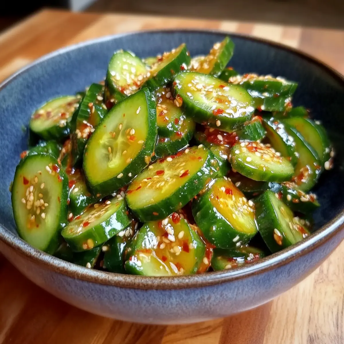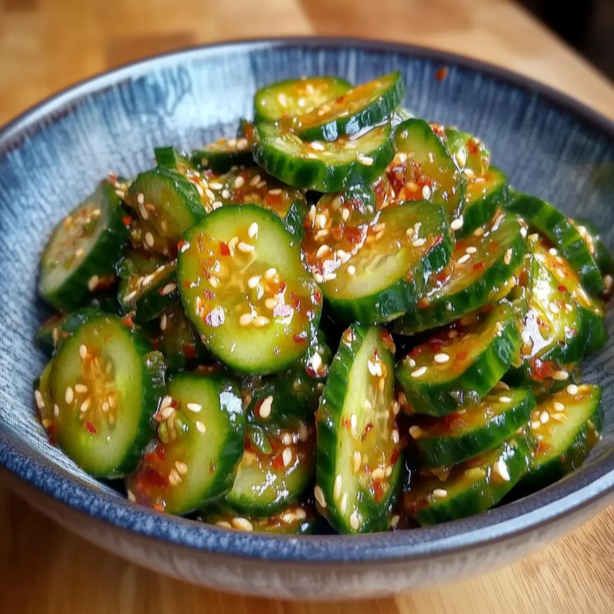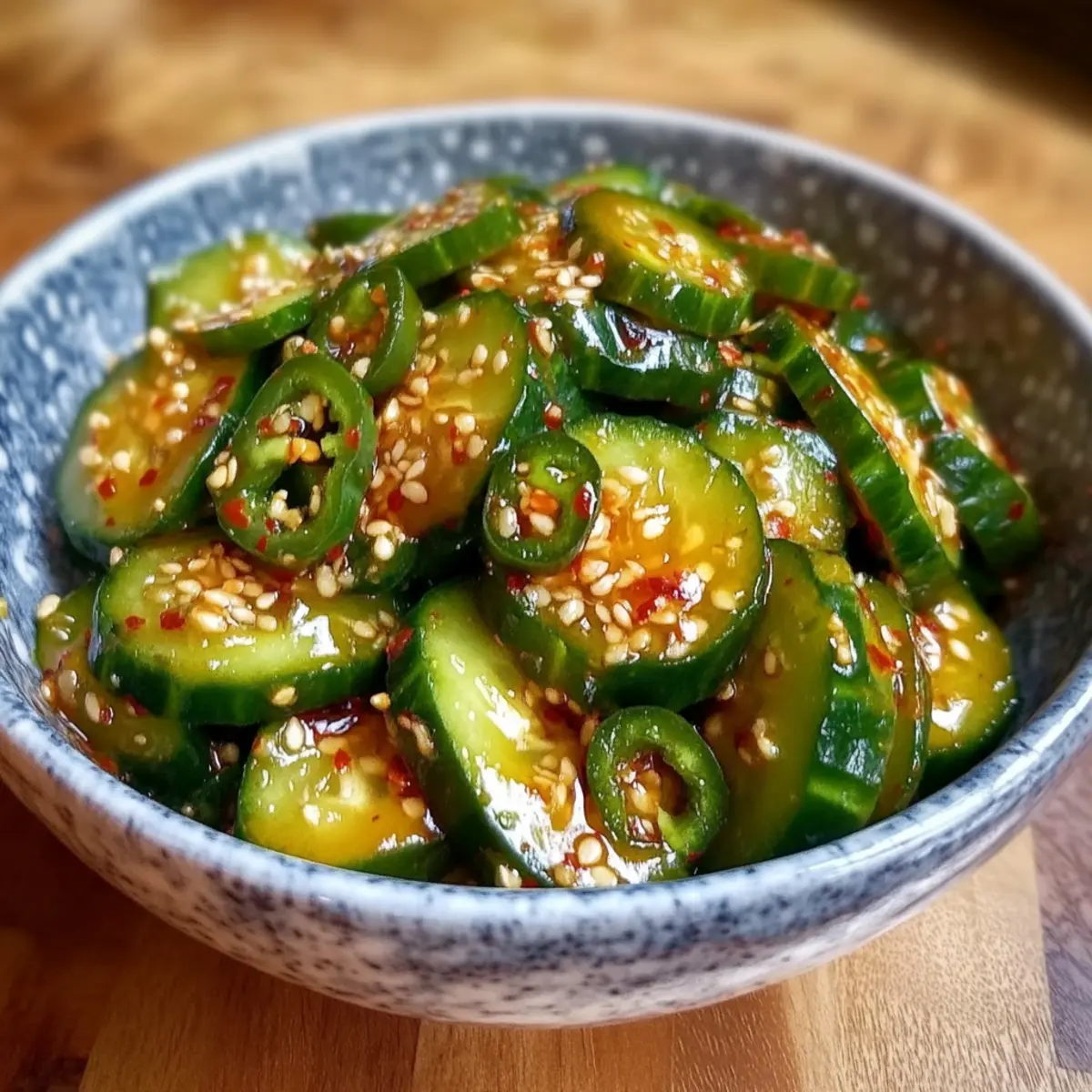 On a sweltering summer afternoon, as I rummaged through my fridge, a vibrant idea struck me: a Spicy Cucumber Salad that would light up my taste buds! This dish is not just a salad—it’s a refreshing vegan delight that captures the essence of summer in each crunchy bite. With only 10 minutes of prep, this quick and easy recipe is perfect for those bustling days when you want something healthy without sacrificing flavor. The combination of cool, crisp cucumbers and zesty jalapeños tossed in a tangy rice vinegar dressing offers a satisfying yet light dish that can brighten up any meal. Are you ready to dive into an explosion of brightness and flavor for your next summer feast? What makes this salad so special? Quick, Fresh Ingredients: This Spicy Cucumber Salad takes just 10 minutes to whip up with ingredients you probably already have at home! Bursting with Flavor: The unique combination of crunchy cucumbers and spicy jalapeños creates a refreshing taste that dances on your palate. Versatile Dish: Whether served as a vibrant side at summer barbecues or a light lunch, it pairs well with dishes like Avocado Egg Salad or even Bang Shrimp Salad. Make Ahead: Perfect for meal prep! Just allow it to marinate, and you’ll enjoy the flavors intensifying with time. Low-Calorie Goodness: With each serving packing approximately 100 calories, it’s a guilt-free option for anyone looking to maintain a healthy lifestyle. Dive into this vibrant salad that’ll keep you refreshed all summer long! Spicy Cucumber Salad Ingredients • Perfect for refreshing summer meals! For the Salad Cucumbers – A hydrating base that adds crisp texture; opt for firm, English cucumbers for the best crunch. Jalapeños – Provides a spicy kick; adjust the quantity or remove seeds to suit your taste. Green Onions – Adds freshness and visual appeal with its mild onion flavor. Sesame Seeds – Sprinkle on top for added crunch and flavor depth. For the Dressing Rice Vinegar – Offers a tangy note that perfectly balances the salad’s heat; essential for the Spicy Cucumber Salad experience. Soy Sauce – Introduces a savory umami flavor; substitute with tamari for a gluten-free option. Sugar – Mellow out the vinegar’s acidity while providing a hint of sweetness. Sesame Oil – Delivers a rich, nutty flavor that ties all the ingredients together. Salt – Elevates the overall taste; adjust according to your preference. Step‑by‑Step Instructions for Spicy Cucumber Salad Step 1: Prepare the Vegetables Start by washing the cucumbers and jalapeños under cool water. Using a sharp knife, thinly slice the cucumbers into rounds and the jalapeños into thin rings, adjusting the number of jalapeños based on your desired spice level. For a milder flavor, remove the seeds from the jalapeños. Set the sliced vegetables aside in a large mixing bowl. Step 2: Combine Vegetables In the bowl with the sliced cucumbers and jalapeños, add the chopped green onions and a sprinkle of sesame seeds for added crunch. Gently toss the ingredients together until they are well mixed, creating a vibrant base for the Spicy Cucumber Salad that will soon shine with flavor. Step 3: Whisk the Dressing In a separate bowl, whisk together the rice vinegar, soy sauce, sugar, sesame oil, and a pinch of salt. Make sure the sugar dissolves completely and the dressing is well blended. This tangy dressing is essential for bringing out the flavors in your salad, so blend it thoroughly until you achieve a smooth consistency. Step 4: Dress the Salad Pour the dressing over the cucumber mixture in your large bowl. Using salad tongs or a spatula, gently toss the vegetables and dressing together until all the ingredients are evenly coated. Look for the cucumbers to glisten with the tangy dressing, ensuring every bite of the Spicy Cucumber Salad is full of flavor. Step 5: Marinate for Flavor Cover the bowl with plastic wrap or a lid and place it in the refrigerator for at least 20 minutes. This marinating step allows the flavors to meld beautifully, creating a refreshing dish that’s even better when chilled. If time allows, marinating longer can enhance the overall taste even more. Step 6: Serve and Enjoy Once chilled, remove the Spicy Cucumber Salad from the fridge and give it a good toss. Taste for seasoning and adjust with more salt or dressing if desired. Serve the salad in a vibrant bowl, garnished with any remaining sesame seeds and perhaps a few extra slices of jalapeño for a pop of color. Enjoy this refreshing summer delight! Variations & Substitutions for Spicy Cucumber Salad Feel free to explore different flavors and textures in this vibrant dish that can be tailored to your palate! Dairy-Free: Replace any topping options with avocado or a drizzle of coconut cream for a creamy twist. Add some richness that complements the crunchy cucumbers beautifully. Extra Heat: Incorporate diced serrano peppers instead of jalapeños for an even spicier kick. This fiery variation is perfect for heat lovers, amplifying the salad’s zesty surprise! Herb-Infused: Toss in fresh cilantro or mint to add aromatic freshness and depth. This herbaceous touch elevates each bite, bringing a taste of summer herb gardens to your plate. Protein Boost: For added satisfaction, mix in grilled tofu or chickpeas for a heartier salad. Introducing protein not only enhances the dish but makes it a complete meal for those busy days! Zesty Citrus: Swap rice vinegar with lime juice for a bright, tangy flavor addition. The citrus note will invigorate your taste buds, adding a refreshing aspect to every forkful. Nutty Flavor: Incorporate crushed peanuts or cashews for extra crunch and a nutty twist. This adds texture and mouthfeel, creating delightful contrasts against the crisp cucumbers. Asian-Inspired: Use sesame dressing instead of rice vinegar and soy sauce for an umami-packed flavor profile. This brings an extra layer of richness that’s sure to impress at any gathering or meal! Roo