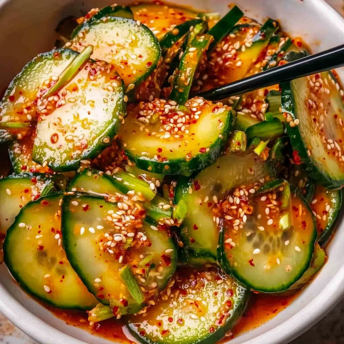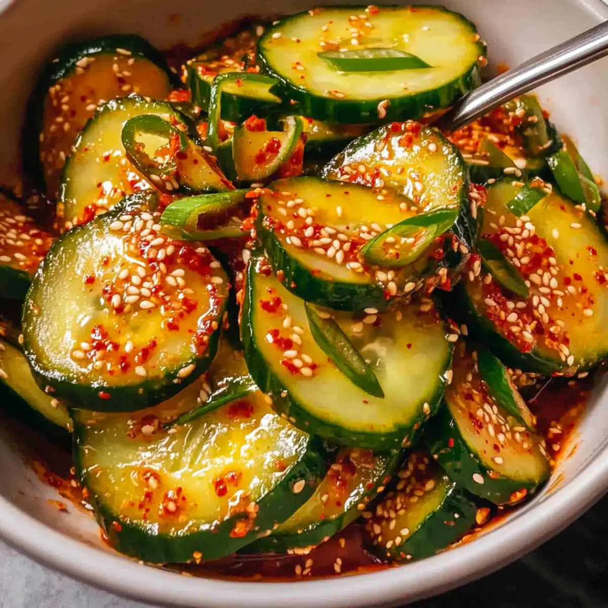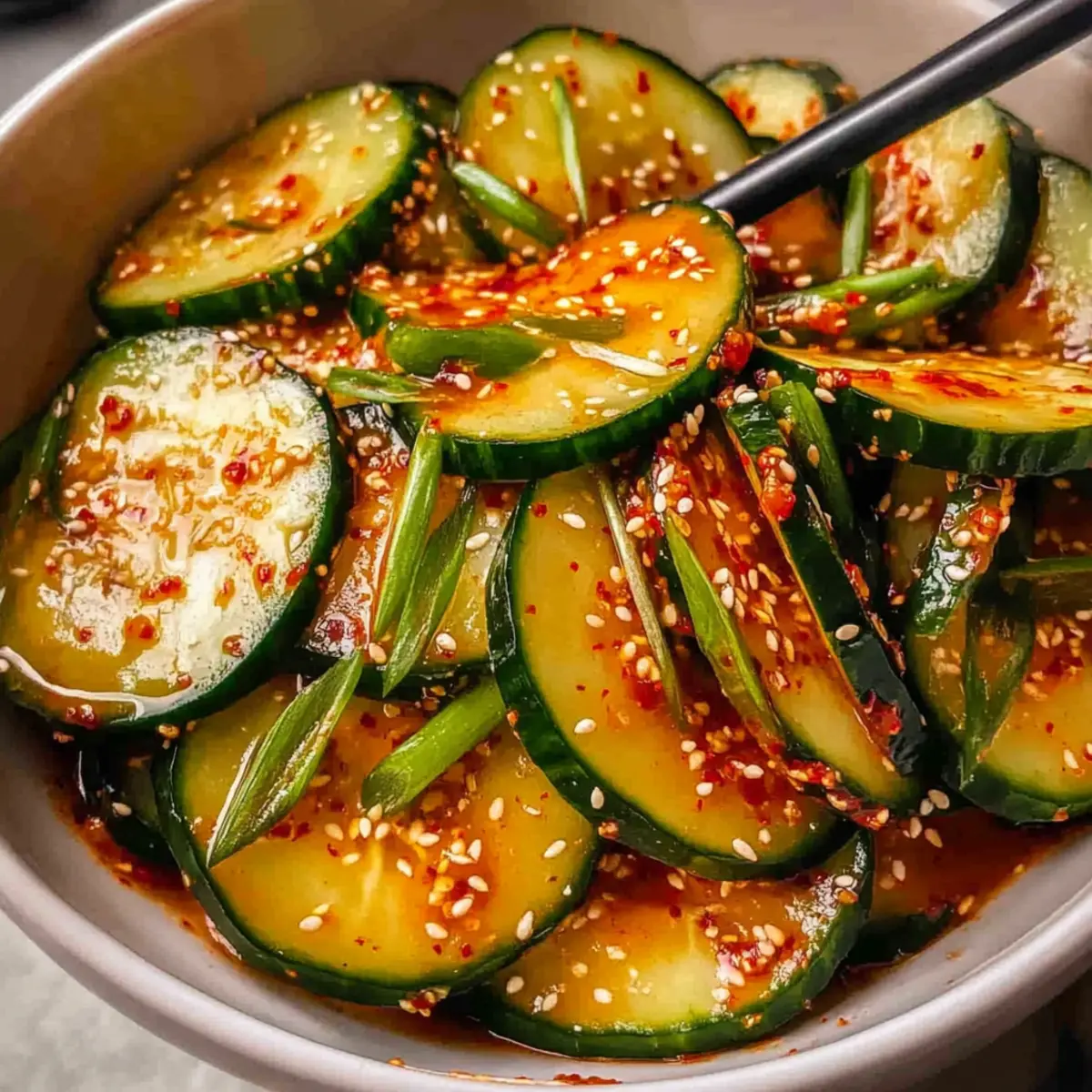 The zing of spices fills the air as I mix together the ingredients for my favorite summer side dish: Spicy Korean Cucumber Salad. This vibrant salad not only delivers a refreshing crunch with every bite but also brings a delightful kick that elevates any meal. With just six simple ingredients, it’s a breeze to whip up, making it the perfect, gluten-free accompaniment to grilled meats like bulgogi or even your favorite tofu dish. I love how the balance of sweet honey and the fiery gochugaru creates a colorful tapestry of flavors that dances on the palate. Whether it’s a casual weeknight dinner or a lively backyard barbecue, this salad is sure to impress and satisfy. Curious about how to make this deliciously simple dish? Let’s dive in! Why is this salad a must-try? Quick and Easy: This Spicy Korean Cucumber Salad comes together in mere minutes! With just six ingredients, it’s ideal for busy weeknights or impromptu gatherings. Flavor Explosion: The combination of sweet honey and spicy gochugaru creates a vibrant taste that livens up any meal. Healthy Choice: Low in calories yet packed with flavor, this gluten-free dish is a guilt-free side that complements grilled chicken or even a refreshing Cucumber Caesar Salad. Versatile Side Dish: Perfectly paired with Korean BBQ, salmon, or tofu, it’s versatile enough to match any protein, making it a crowd-pleaser at picnics or dinner parties. Crispy and Refreshing: Enjoy that satisfying crunch from English cucumbers, making every bite a crisp delight! Spicy Korean Cucumber Salad Ingredients For the Salad • English Cucumber – The main component providing crunch and freshness; if unavailable, Persian cucumbers can substitute, but peel and seed regular cucumbers. • Kosher Salt – Enhances flavor and draws moisture from the cucumbers for a better texture. • Scallion – Adds a mild onion flavor and can be used as an optional garnish. For the Dressing • Rice or Distilled White Vinegar – Introduces acidity and brightens the salad; use whichever vinegar you have on hand. • Honey – Balances the spices with sweetness; you can substitute this with agave syrup or maple syrup if desired. • Toasted Sesame Oil – Offers a nutty flavor that complements the dish; can be swapped with neutral oil, but it may lack distinct flavor. • Gochugaru (Korean chili pepper flakes) – Essential for adding spice; substitute cautiously with cayenne pepper, starting with ½ teaspoon if needed. For Garnish • Toasted Sesame Seeds – Optional topping for added texture and flavor, elevating your Spicy Korean Cucumber Salad beautifully! Step‑by‑Step Instructions for Spicy Korean Cucumber Salad Step 1: Prepare Cucumbers Begin by washing one English cucumber thoroughly, then slice it thinly using a sharp knife or a mandoline for even pieces. Place the cucumber slices into a large mixing bowl and sprinkle with kosher salt, tossing gently to coat. Let the cucumbers sit for 15 minutes, allowing them to release excess moisture, which enhances their crisp texture for your Spicy Korean Cucumber Salad. Step 2: Make Dressing While the cucumbers are resting, in a separate small bowl, whisk together ¼ cup of rice vinegar, 1 tablespoon of honey, 2 teaspoons of toasted sesame oil, and 1 tablespoon of gochugaru. Blend the ingredients until smooth and fully combined. This dressing offers a perfect balance of sweetness, tang, and spice that will elevate your Spicy Korean Cucumber Salad. Step 3: Combine Ingredients After 15 minutes, drain the excess liquid from the cucumbers, pressing gently with a spoon if needed. Add the cucumber slices to the dressing in the small bowl, ensuring to coat each piece thoroughly. Toss gently until the cucumbers are evenly covered with the flavorful dressing, creating that delicious essence of your Spicy Korean Cucumber Salad. Step 4: Serve Once the cucumbers are well-mixed with the dressing, transfer them to a serving platter. For a delightful finishing touch, garnish with sliced scallion and a sprinkle of toasted sesame seeds, if desired. This Spicy Korean Cucumber Salad is best enjoyed fresh, so dive right in and savor the vibrant flavors and crunchy texture! Spicy Korean Cucumber Salad Variations Feel free to play around and customize this salad to your taste, creating new flavor profiles that excite your palate! Garlic Kick: Add minced garlic for a robust flavor boost that complements the spicy notes wonderfully. A hint of garlic will create a savory depth to this refreshing salad. Radish Crunch: Toss in some thinly sliced radishes for an added crunch and color, enhancing both the visual appeal and texture. Their spicy bite offers a delightful contrast against the cool cucumbers. Sweetener Swap: For a different sweetness, substitute honey with agave syrup or maple syrup, adjusting the quantity to desired sweetness. This little twist can create a unique flavor journey with each bite! Heat Level: Want more heat? Increase the gochugaru in the dressing or add a chopped fresh chili pepper for a spicy challenge. Remember, a little can go a long way – start with a small amount and adjust to your taste! Soy Sauce Addition: To deepen the umami flavor, add a splash of low-sodium soy sauce to the dressing. This small addition will infuse richness into your spicy cucumber concoction. Sesame Alternative: Replace toasted sesame oil with a drizzle of chili oil for a smoky, spicy flavor. This switch creates a different flavor profile while keeping that fantastic spicy element. Fresh Herbs: Experiment with fresh herbs like cilantro or mint instead of scallions for an aromatic twist. These herbs will bring a refreshing brightness that beautifully balances the spice. Nutritional Boost: Incorporate some chopped avocado for creaminess and added healthy fats. This addition will create a lovely contrast between the rich avocado and the crunchy cucumbers. Whether you’re serving this alongside grilled chicken, fish, or even a light and refreshing 