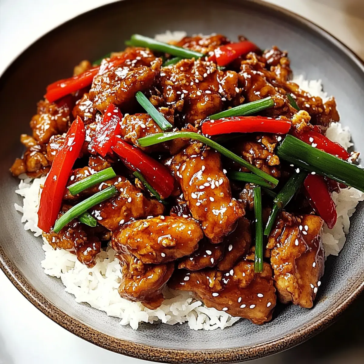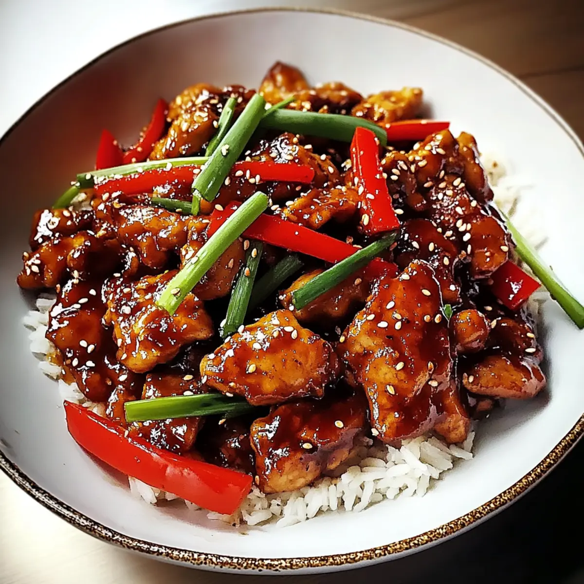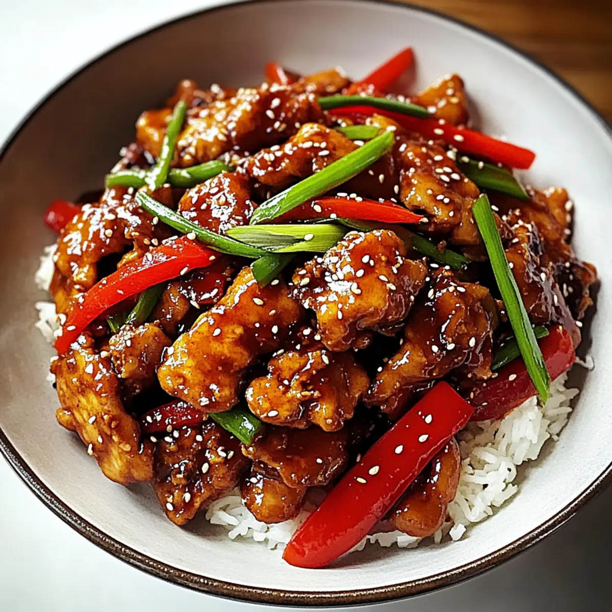 As I flipped through my recipe book, a wave of nostalgia washed over me—growing up, stir-fries were our family’s go-to for quick dinners after busy days. Today, I’m excited to share my take on this classic with my Spicy Stir-Fried Mongolian Chicken. This dish brings a delightful mix of heat and sweetness together in just 30 minutes, making it not only a perfect weeknight solution but also a high-protein delight for the whole family. Whether you’re feeding meat lovers or looking for easy vegetarian adaptations with tofu or mushrooms, this recipe caters to everyone’s cravings. Ready to spice up your dinner routine? Let’s dive in! Why Is This Recipe a Must-Try? Quick and Easy: Perfect for a busy weeknight, this dish comes together in just 30 minutes, ensuring a stress-free cooking experience. Flavor Explosion: Packed with tender chicken, zesty ginger, and a sweet-spicy sauce, it’s a delightful taste journey in every bite. Versatile Options: Easily transform this meal by swapping chicken for tofu or mushrooms, making it a great fit for vegetarians too! Crowd-Pleasing Appeal: Whether it’s a family dinner or a cozy gathering, everyone is sure to appreciate this delicious dish. Healthy Eating: With a high-protein content and balanced flavors, this stir-fry is both nourishing and satisfying. Dive into the delicious world of easy homemade meals and check out my other favorite recipes like Honey Bourbon Chicken or Grilled Chicken Bacon for more tasty inspiration! Spicy Stir-Fried Mongolian Chicken Ingredients • Dive into the delightful components that make this dish shine! For the Chicken • Chicken Breast – Lean protein that soaks up flavors; can substitute with firm tofu or sliced mushrooms for a vegetarian option. • Cornstarch – Coating for chicken that creates a crispy texture when cooked, ensuring every bite is perfectly crunchy. For the Sauce • Soy Sauce – Savory base of the sauce with umami flavor; provides depth and richness. • Brown Sugar – Adds sweetness and a hint of molasses, creating a perfect balance with the spiciness. • Hoisin Sauce – Offers tangy sweetness; can substitute with equal parts soy sauce and peanut butter with a dash of vinegar if needed. • Minced Ginger – Fresh, warm bite that enhances the flavor; a key player in this stir-fry. • Garlic – Adds depth and complexity with its sharp flavor, rounding out the sauce beautifully. • Red Pepper Flakes – Adjustable for spiciness; use to taste or omit for a milder dish. • Water – Dilutes soy sauce to control saltiness and assists in dissolving sugar for a smooth sauce. For the Vegetables • Vegetable Oil – High smoke point oil for stir-frying, ensuring a crisp exterior without burning. • Red Bell Pepper – Provides crunch and color; stir-fry until tender-crisp for the best texture. • Green Onions – Added at the end for freshness and garnish, bringing a pop of brightness. For Garnish (optional) • Sesame Seeds – Sprinkle on top for added texture and flavor; they elevate the dish beautifully. Get ready to enjoy this Spicy Stir-Fried Mongolian Chicken as it transforms your dinner table into a feast of flavors! Step‑by‑Step Instructions for Spicy Stir-Fried Mongolian Chicken Step 1: Prepare the Chicken Begin by slicing the chicken breast into bite-sized pieces, ensuring they are uniform for even cooking. In a bowl, toss the chicken with cornstarch until well-coated, which will give it a delightful crispiness when stir-fried. Set this aside while you heat up your wok or skillet. Step 2: Heat the Oil Place your large wok or a deep skillet over medium-high heat and add 2 tablespoons of vegetable oil. Allow the oil to heat for about 1-2 minutes, until it shimmers, indicating it’s hot enough for stir-frying. This is crucial for achieving that perfect, crispy exterior on your chicken. Step 3: Cook the Chicken Once the oil is hot, carefully add the cornstarch-coated chicken pieces in a single layer. Stir-fry for 5-7 minutes, or until the chicken turns a golden brown and is cooked through, which you can verify by cutting into a piece and ensuring there’s no pink. Remove the chicken from the skillet and keep it warm on a plate while you prepare the sauce. Step 4: Sauté Aromatics In the same skillet, add a little more oil if necessary, then toss in minced ginger, garlic, and red pepper flakes. Stir-fry these ingredients for about 30 seconds, until you notice the fragrant aromas filling the air, signaling that they are ready to enhance the flavor of your dish. Step 5: Create the Sauce In a separate bowl, mix together the soy sauce, water, brown sugar, and hoisin sauce until well combined. Pour this mixture into the skillet over the sautéed aromatics, and let it simmer for approximately 2 minutes or until it slightly thickens, stirring occasionally to prevent sticking and ensure even flavor distribution. Step 6: Combine Chicken and Veggies Return the cooked chicken to the skillet, stirring it into the bubbling sauce. Add the sliced red bell pepper at this point, ensuring everything is well coated. Stir-fry together for another 3-4 minutes, allowing the bell peppers to become tender-crisp and vibrant in color, showcasing the Spicy Stir-Fried Mongolian Chicken beautifully. Step 7: Finish and Serve Just before serving, toss in the chopped green onions for a fresh touch. Serve the vibrant stir-fry hot over fluffy steamed rice, garnishing with sesame seeds for added texture and a nutty flavor, if desired. Enjoy the delightful balance of heat and sweetness in your Spicy Stir-Fried Mongolian Chicken! Make Ahead Options These Spicy Stir-Fried Mongolian Chicken ingredients are perfect for meal prep enthusiasts! You can prepare the chicken by slicing and coating it with cornstarch up to 24 hours in advance, storing it covered in the refrigerator to keep it fresh. Additionally, you can mix the sauce ingredients (soy sauce, water, brown sugar, and hoisin sauce) and refrigerate for up