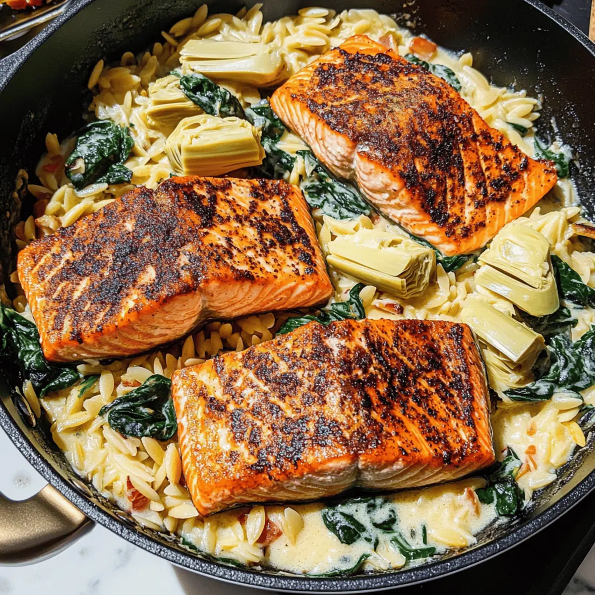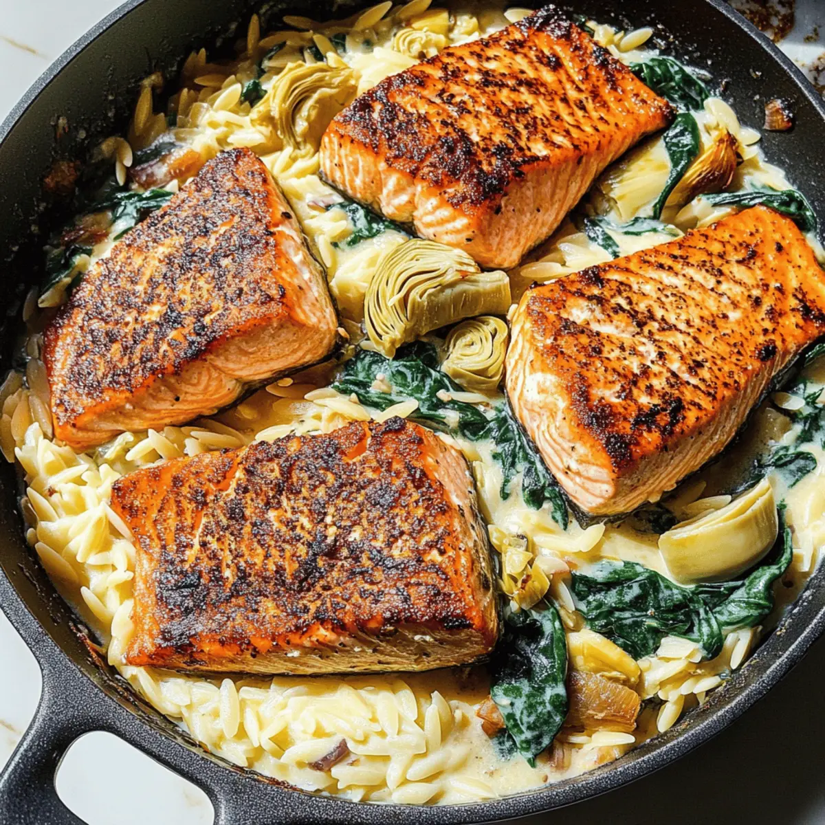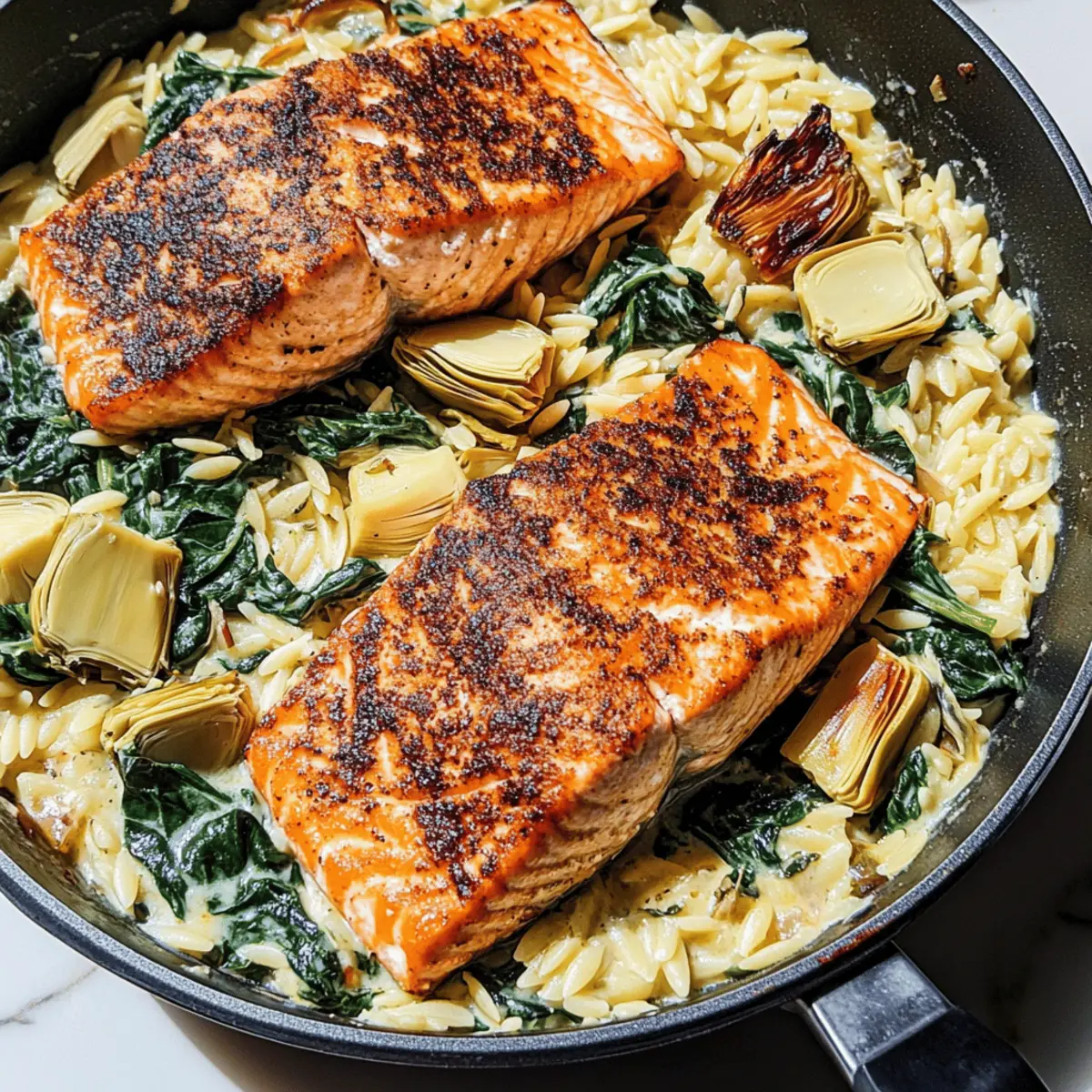 As I stood in my kitchen, the fragrance of garlic and sautéing shallots wafted through the air, instantly transporting me to my favorite coastal restaurant where I first tasted the magic of a Spinach Artichoke Salmon Skillet. This unique recipe blends the creamy goodness of spinach and artichoke dip with perfectly seared salmon, creating a dish that not only satisfies but dazzles the senses. Perfect for a busy weeknight, this meal comes together in one pan, allowing you to spend less time cleaning and more time savoring delicious flavors. Plus, with easily adaptable gluten-free and dairy-free options, it’s a versatile dinner that everyone in the family will love. Curious how to bring this delightful fusion to your table? Let’s dive into the recipe! Why Will You Love This Dish? Simple Preparation: You’ll appreciate how this one-pan meal saves time without sacrificing flavor. It’s perfect for busy weeknights! Flavor Explosion: Enjoy the delightful combination of creamy spinach and artichokes with perfectly spiced salmon—each bite is a taste sensation. Healthy & Nutritious: Packed with protein and essential nutrients, this dish doesn’t compromise on health. Plus, gluten-free and dairy-free options are available! Versatility: Adapt the recipe to your liking by swapping salmon for chicken or shrimp. It fits right into various dietary preferences. Crowd Pleaser: Impress family or guests with this vibrant dish that looks as good as it tastes—your dinner table will never be the same! For more delicious seafood options, check out my Baked Boursin Salmon for a creamy treat or the Cajun Salmon Pasta for a spicy twist! Spinach Artichoke Salmon Skillet Ingredients For the Salmon Salmon Fillets – The star of the dish; substitute with chicken or tofu for a different protein. Extra-Virgin Olive Oil – Adds healthy fats and enhances flavor; can replace with avocado oil or melted coconut oil. Paprika – Infuses smokiness and vibrant color; use smoked paprika for an extra kick. Dried Thyme – Complements salmon beautifully; fresh thyme can be used for a more aromatic touch. Garlic Powder – Elevates the overall taste; fresh minced garlic works well for a bolder flavor. Kosher Salt & Black Pepper – Essential seasonings; feel free to adjust to suit your palate. For the Vegetables and Orzo Shallots – Adds sweetness and depth; substitute with finely chopped onion or leeks if needed. Garlic Cloves – The aromatic base; fresh garlic cloves are recommended for stronger flavor. Crushed Red Pepper Flakes – Introduces heat; omit if you’d prefer a milder dish. Dry Orzo Pasta – Absorbs flavors nicely; can use quinoa or gluten-free pasta as alternatives. Vegetable or Chicken Broth – Provides moisture and enhances flavor; opt for low-sodium versions for a healthier option. For the Creaminess Dijon Mustard – Adds a tangy kick; yellow mustard is a good substitute if needed. Heavy Cream – Provides that luscious creamy texture; use half-and-half or coconut milk for dairy-free versions. For the Final Touches Fresh Baby Spinach – Delivers nutrients and a pop of color; kale can be swapped in if you prefer. Marinated Artichoke Hearts – Key ingredient for texture and flavor; canned artichokes will work in a pinch. Grated Parmesan or Pecorino Romano Cheese – Enhances umami flavors; nutritional yeast serves as a dairy-free alternative. Lemon (Zest and Juice) – Brightens the dish and adds acidity; lime can be used if lemons are out of reach. Each ingredient plays a vital role in crafting this delightful Spinach Artichoke Salmon Skillet that’s sure to be a hit on your dinner table! Step‑by‑Step Instructions for Spinach Artichoke Salmon Skillet Step 1: Prepare the Salmon Start by drizzling the salmon fillets with extra-virgin olive oil, then season generously with paprika, dried thyme, garlic powder, kosher salt, and black pepper. Heat a large skillet over medium heat for a couple of minutes, then place the salmon skin-side down. Cook for about 3 minutes until the skin is crispy, then flip and cook for another 3 minutes, or until the salmon is medium-rare. Transfer the salmon to a plate and set aside. Step 2: Sauté Aromatics In the same skillet, add a touch more olive oil if needed and toss in the chopped shallots and minced garlic. Sauté for 2 minutes, stirring frequently, until fragrant and softened. The shallots should become translucent. Then, stir in the crushed red pepper flakes, allowing them to infuse their heat into the mixture. Enjoy the delightful aroma that wafts through your kitchen! Step 3: Cook the Orzo Introduce the dry orzo pasta to the skillet along with vegetable or chicken broth and Dijon mustard. Stir everything together, bringing the mixture to a gentle boil over medium-high heat. Once boiling, reduce the heat to medium-low, cover, and let the orzo simmer for about 12 minutes, or until the pasta is almost al dente, absorbing all those wonderful flavors while cooking. Step 4: Add Cream and Spinach Remove the lid from the skillet and slightly increase the heat. Stir in the heavy cream and the fresh baby spinach, mixing everything well. Cook for about 1 to 2 minutes until the spinach has wilted and the creamy sauce has thickened a bit. The combination of the creamy sauce with spinach creates a lush base for your Spinach Artichoke Salmon Skillet. Step 5: Finish the Dish Gently fold in the marinated artichoke hearts and grated Parmesan cheese, allowing them to mingle with the creamy mixture. Carefully return the salmon fillets to the pan, simmering for an additional 3 minutes until everything is heated through. Finally, garnish your finished dish with fresh lemon zest and a squeeze of lemon juice to brighten the flavors, making your Spinach Artichoke Salmon Skillet absolutely irresistible! How to Store and Freeze Spinach Artichoke Salmon Skillet Fridge: Store leftovers in an airtight container for up to 2 days. This ensures the flavors stay fresh and the textures 