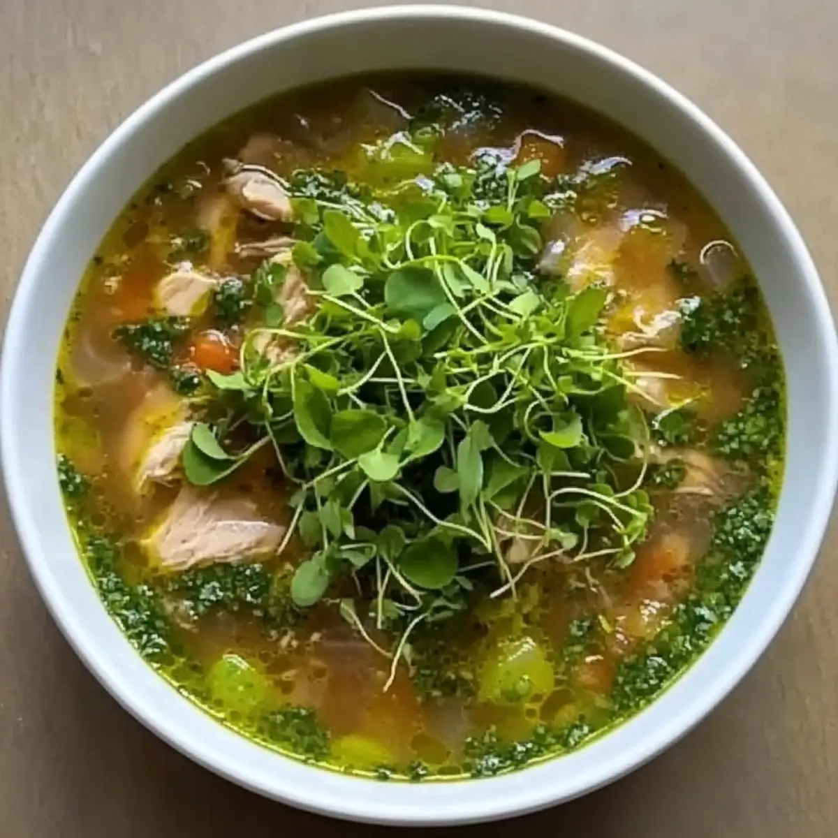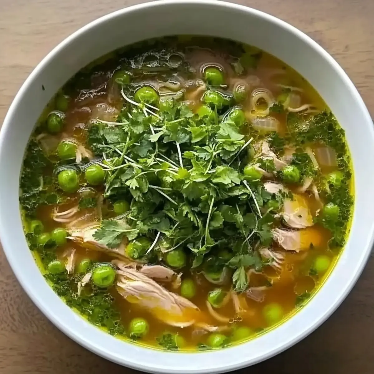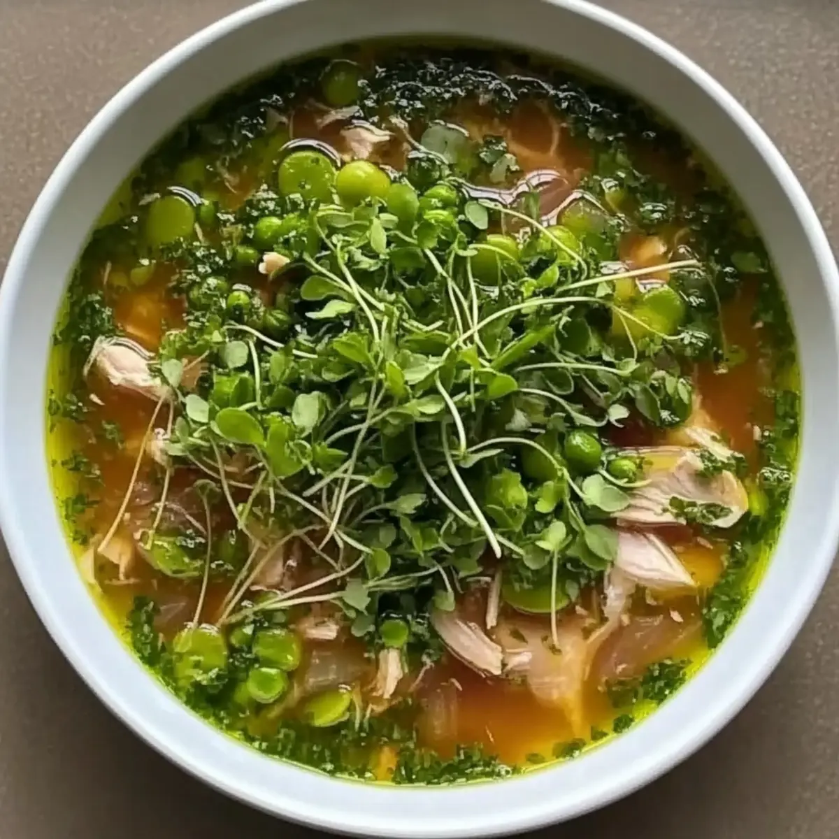 As the first blooms of spring appear, I find myself irresistibly drawn to the kitchen, eager to whip up a warm bowl of Spring Chicken Soup. This comforting recipe not only celebrates the season’s vibrant vegetables but also transforms simple ingredients into a cozy masterpiece. With its tender chicken, sweet peas, and a delightful infusion of fresh herbs, this soup is a windfall for those craving a homemade meal that’s both satisfying and nourishing. It’s quick to prepare, making it a perfect choice for busy weeknights, yet it feels like a warm hug on those cooler evenings. Curiosity piqued? Let’s dive into this delightful recipe that’s sure to become a favorite in your home! Why is Spring Chicken Soup so special? Comforting Warmth: This Spring Chicken Soup is the epitome of comfort food, offering warmth and satisfaction with every spoonful. Seasonal Freshness: Utilizing vibrant, seasonal vegetables makes this dish not only delicious but wholesome and nutritious as well. Simple Preparation: With straightforward steps, even novice cooks can whip this up effortlessly, turning dinner into a stress-free experience. Flavor Explosion: The blend of fresh herbs, citrus, and tender chicken creates a refreshing taste that evokes the essence of spring in every bite. Crowd Pleaser: Perfect for cozy family dinners or gatherings; this soup is sure to impress all your guests, serving wonderfully alongside a crusty bread. Save time and enjoy a homemade meal that feels fancy yet is simple enough for a weeknight. If you enjoy this soup, check out my Grilled Chicken Bacon for another delightful dinner option! Spring Chicken Soup Ingredients Discover the delightful components that make up this cozy dish! For the Soup Base • Bone-in, Skin-on Chicken Thighs – Provide rich flavor and moisture; substitute with skinless chicken for a lighter option. • Kosher Salt and Black Pepper – Essential for seasoning; adjust to taste throughout the cooking process. • Olive Oil – Adds depth of flavor and aids in cooking; can substitute with avocado oil if desired. • Low Sodium Chicken Stock (6 cups) – The heart of the soup; homemade stock offers the best flavor, but vegetable stock works for a vegetarian version. • Bay Leaves (2) – Infuses depth and complexity; remember to remove before serving. For the Vegetables • Leeks – Sweet and mild onion flavor; substitute with onions or shallots if leeks aren’t available—be sure to clean them thoroughly. • Celery (3 stalks) – Adds crunch and savory base notes; fennel can be used as a tasty alternative. • Fennel Bulb – Gives anise flavor, enhancing aroma; can be omitted or replaced with a small amount of fennel seeds. • Garlic (5 cloves) – Provides essential flavor; using fresh garlic yields the best results. • Ginger (1 inch piece) – Adds warmth and a hint of spice; fresh ginger is recommended for its robust flavor. • Kohlrabi (2 medium) – Provides interesting texture; potatoes or turnips are suitable substitutes. • Frozen Peas (2 cups) – Sweetens and enhances color; fresh peas are lovely when in season. For the Pasta & Garnish • Small Pasta (½ lb, cooked to al dente) – Adds substance; any small pasta shape works well like orzo or ditalini. • Watercress (for serving, optional) – Offers a peppery, fresh garnish; can be substituted with arugula or spinach if needed. • Grated Pecorino Romano (for serving) – Adds a depth of salty flavor; parmesan makes a great alternative. For the Fresh Herb Mixture • Fresh Herbs (½ cup parsley, ¼ cup dill, ⅓ cup tarragon) – Brightens flavor and adds freshness; feel free to mix and match herbs to suit your taste. • Lemons (2, zested and juiced) – Adds brightness to the soup; for a pinch, vinegar can work as a substitute for acidity. Gather these ingredients and prepare to create a heartwarming bowl of Spring Chicken Soup that captures the essence of the season! Step‑by‑Step Instructions for Spring Chicken Soup Step 1: Cook Chicken In a large pot, heat 2 tablespoons of olive oil over medium heat. Season 1 pound of bone-in, skin-on chicken thighs with kosher salt and black pepper. Sear the thighs for about 5-7 minutes on each side, until golden brown and crispy. Once cooked, remove the chicken from the pot and set it aside on a plate, allowing the flavorful drippings to remain in the pot. Step 2: Sauté Vegetables Using the same pot, add the cleaned and chopped leeks, diced celery, sliced fennel, minced garlic, and grated ginger. Cook the vegetables for about 5-8 minutes over medium heat, stirring occasionally, until they become soft and fragrant. This step enhances the flavor of your Spring Chicken Soup, creating a savory base for the broth. Step 3: Combine and Simmer Return the golden chicken thighs to the pot, then pour in 6 cups of low sodium chicken stock along with 2 bay leaves and 2 diced kohlrabi. Bring the mixture to a boil over high heat, then reduce to a gentle simmer. Cover and let it simmer for about 30 minutes, or until the chicken is cooked through and reaches an internal temperature of 165°F. Step 4: Add Peas and Pasta Once the chicken is done, carefully remove it from the soup and shred the meat, discarding the skin and bones. Return the shredded chicken to the pot, then stir in 2 cups of frozen peas and ½ pound of cooked small pasta. Simmer for an additional 5 minutes, allowing the peas to heat through and the pasta to meld with the flavors of the Spring Chicken Soup. Step 5: Prepare Herb Topping In a food processor, combine ½ cup of fresh parsley, ¼ cup of fresh dill, ⅓ cup of fresh tarragon, the zest of 2 lemons, the juice of the same lemons, and 2 tablespoons of olive oil. Pulse until the mixture is smooth and vibrant, adjusting seasoning with salt and pepper. This herb mixture will add a fresh burst of flavor atop your Spring Chicken Soup. Step 6: Serve Remove and discard the bay leaves from the soup before serving. Ladle the hearty Spring