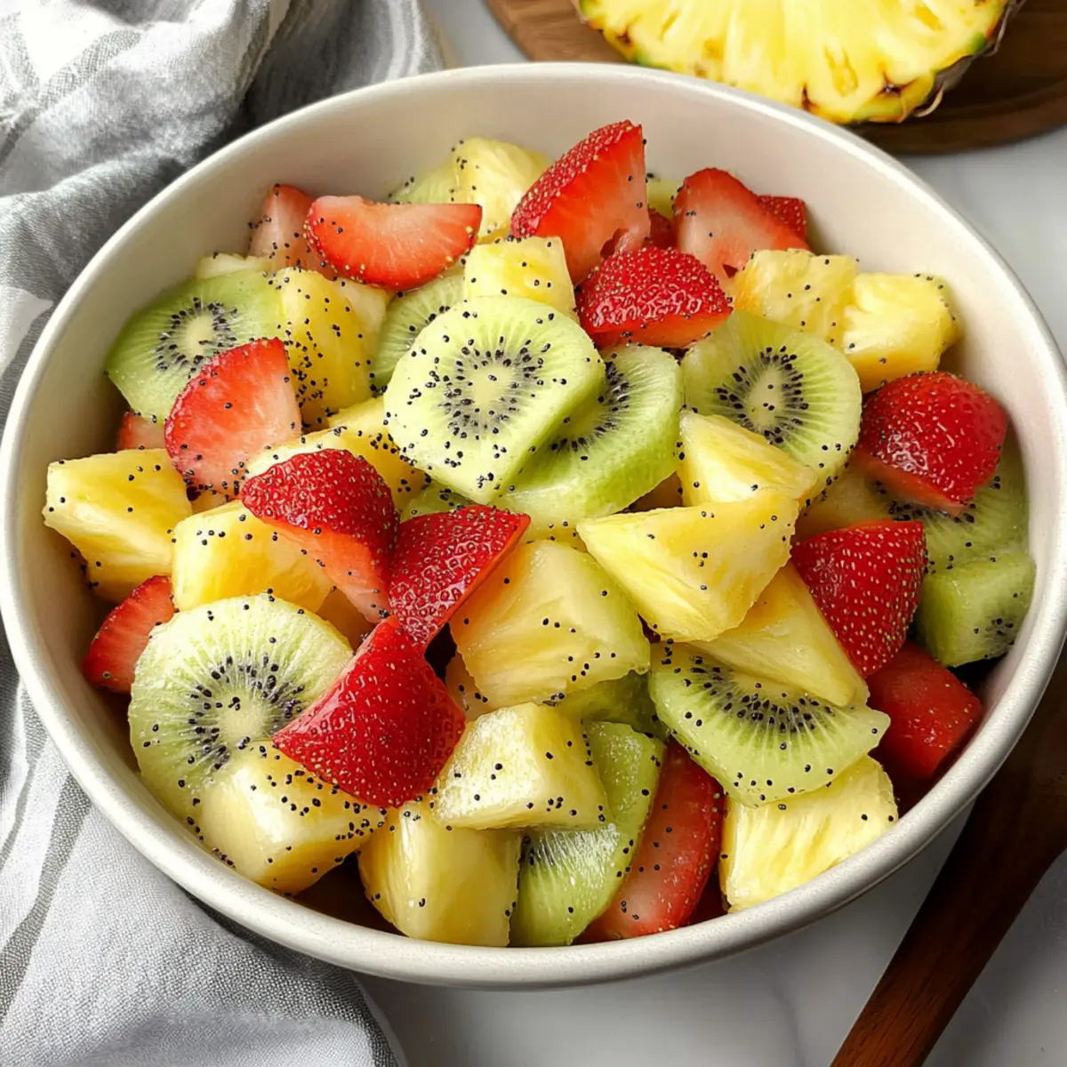 This vibrant Spring Fruit Salad features fresh strawberries, kiwi, and pineapple, perfect for any gathering.