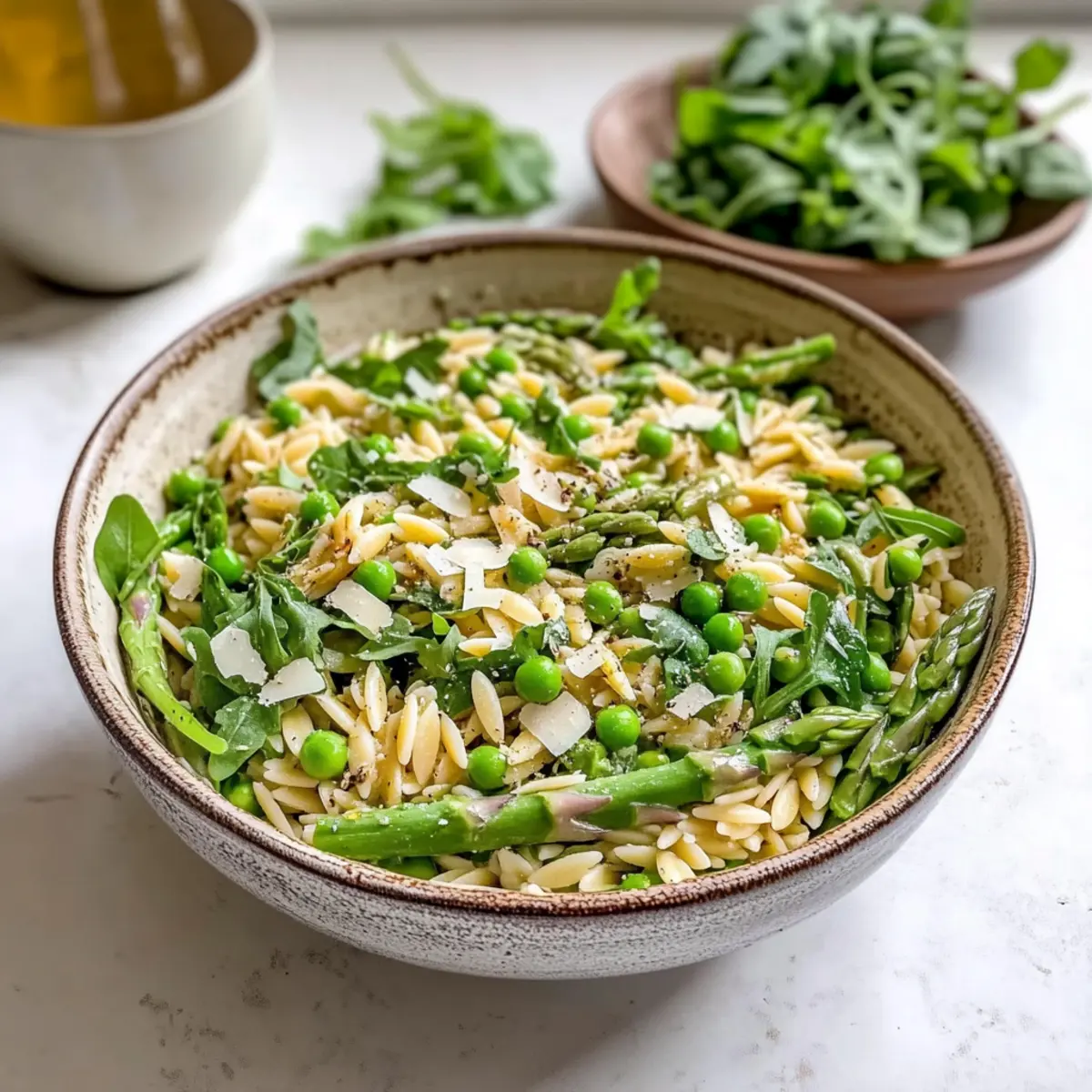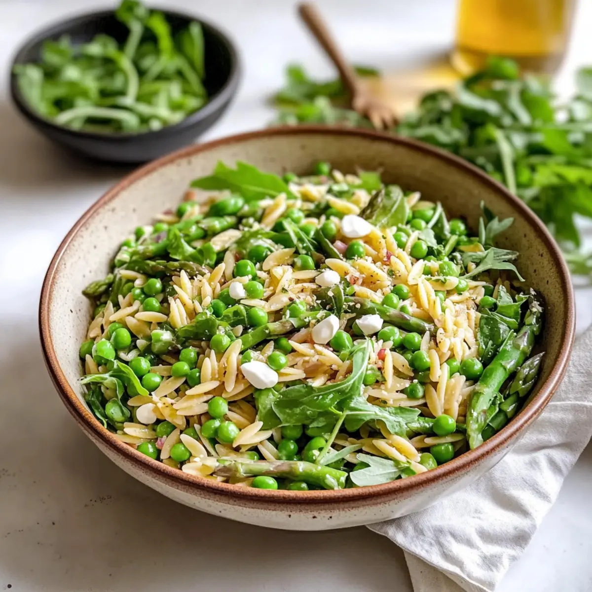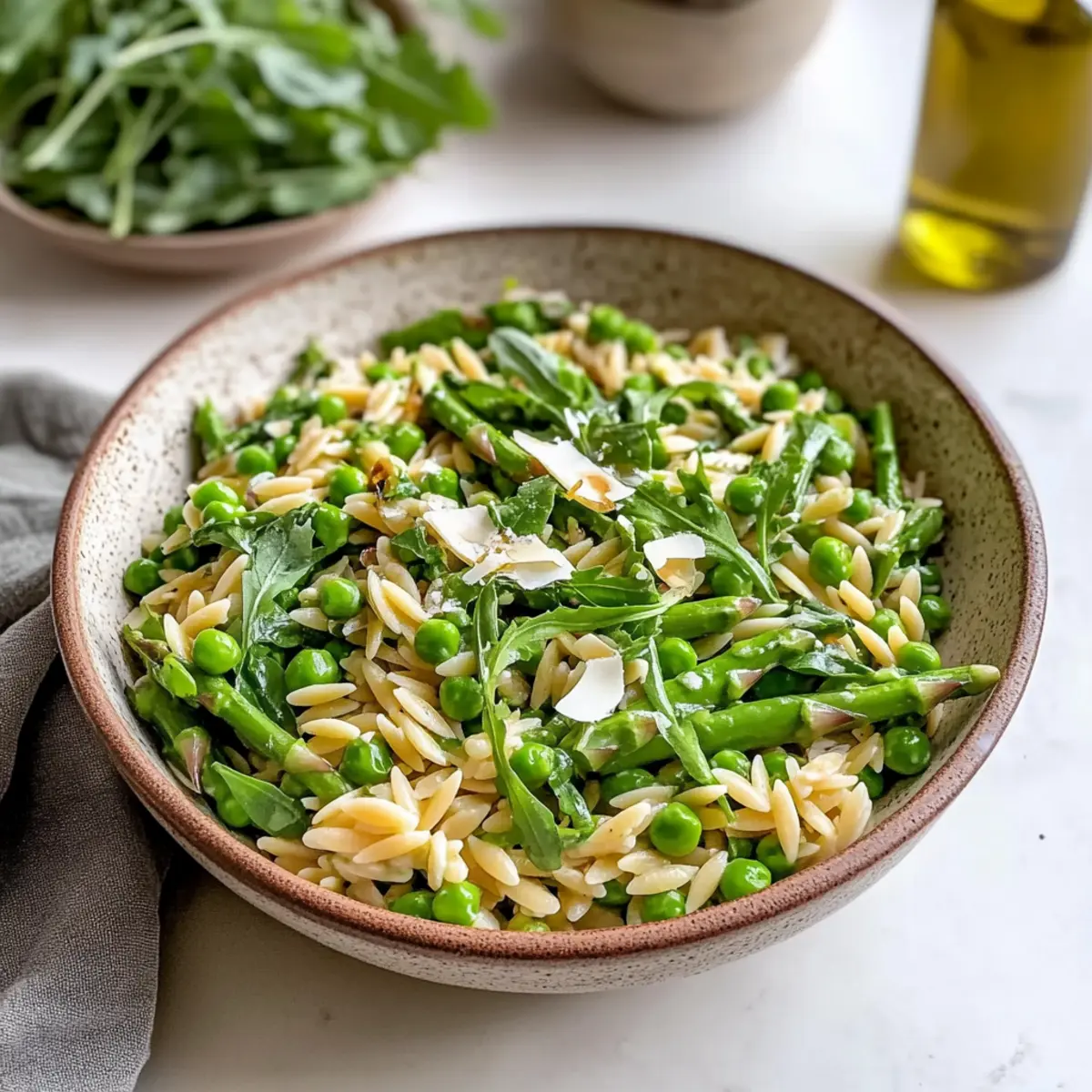 As I tossed the vibrant greens and plump orzo together, a rush of nostalgia washed over me—a warm, sunlit afternoon spent in my grandmother’s garden, surrounded by laughter and the sizzle of the grill. This Fresh Spring Orzo Pasta Salad is a homage to those carefree days, celebrating the essence of spring with a delightful blend of seasonal vegetables. Not only is this dish a feast for the eyes, but it’s incredibly versatile; whether you’re prepping for a potluck or a picnic, it’s easy to prepare and can be made ahead, ensuring you’ll spend less time in the kitchen and more time with loved ones. Ready to add a burst of freshness to your meal? Let’s dive into this delicious recipe that’s destined to become a crowd favorite! Why Is This Salad So Special? Bright, Seasonal Ingredients: This Fresh Spring Orzo Pasta Salad bursts with freshness, showcasing a delightful mix of seasonal vegetables that not only look beautiful but also deliver vibrant flavors. Customizable Options: Use whole wheat or gluten-free orzo for a personalized touch, making it suitable for all dietary preferences. Time-Saving Convenience: Prep the salad in advance; it tastes even better after a day as the flavors meld together beautifully. Perfect for Gatherings: Whether it’s a picnic or potluck, this salad makes a show-stopping side dish that everyone will love! Pair it effortlessly with grilled chicken or seared salmon for a complete meal or serve with a refreshing Quinoa Crunch Salad for delightful variety! Spring Orzo Pasta Salad Ingredients Get ready to create a vibrant dish bursting with flavor! For the Salad • Orzo Pasta – A delightful small pasta shape that creates a perfect base for this salad; consider using whole wheat or gluten-free for added options. • Asparagus – This add a crisp texture and beautiful green color; remember to blanch just until bright green for maximum crunch. • Peas – Sweet and tender bites that complement the asparagus beautifully; blanch them alongside the asparagus to keep them fresh and vibrant. • Arugula – With its peppery notes, it lights up the salad; add just before serving to ensure it stays fresh and doesn’t wilt. For the Vinaigrette • Shallots – Sauté until golden for a mild onion flavor that enhances the vinaigrette beautifully. • Olive Oil – A high-quality oil is the backbone of the vinaigrette, enriching the salad with essential flavors. • Salt & Pepper – Basic but essential for seasoning; adjust to your taste to ensure the flavors pop! This Fresh Spring Orzo Pasta Salad is just what you need to bring some color and joy to your dining table. Enjoy preparing this beautiful dish! Step‑by‑Step Instructions for Spring Orzo Pasta Salad Step 1: Prep Shallot Vinaigrette In a small skillet over medium heat, drizzle 2 tablespoons of high-quality olive oil. Add finely chopped shallots and sauté for 3-4 minutes, stirring frequently, until they turn golden and fragrant. Remove from heat and allow the shallots to cool. Once cooled, whisk them together with 2 tablespoons of vinegar, salt, and pepper in a bowl, creating a luscious shallot vinaigrette to drizzle over your Spring Orzo Pasta Salad. Step 2: Cook Orzo Bring a large pot of salted water to a rolling boil over high heat. Add 1 cup of orzo pasta and cook for 8-10 minutes, stirring occasionally, until al dente. You’ll know it’s ready when the pasta is slightly firm but cooked through. Drain the orzo in a colander and rinse under cold water to stop the cooking process; set aside to cool completely before mixing with the other ingredients. Step 3: Sauté Asparagus In the same skillet used for the shallots, add another drizzle of olive oil and place over medium-high heat. Once hot, add 1 cup of chopped asparagus and sauté for 3-4 minutes until the asparagus is bright green and tender-crisp. Stir occasionally to ensure even cooking. Remove from heat and let them cool slightly before adding to the orzo for your Spring Orzo Pasta Salad. Step 4: Combine Ingredients In a large mixing bowl, combine the cooled orzo, sautéed asparagus, and 1 cup of blanched peas. Gently mix the ingredients together, allowing the freshness of each component to shine. Pour in the shallot vinaigrette, and toss everything together thoroughly, ensuring that each piece is coated beautifully with the dressing, which enhances the flavors of the Spring Orzo Pasta Salad. Step 5: Adjust Seasoning Taste your Spring Orzo Pasta Salad and season with salt and freshly cracked pepper to your liking. If you desire a little more acidity, feel free to add a splash more vinegar. For an earthy finish, you can also add fresh herbs like basil or mint. Serve immediately for a vibrant dish or refrigerate for up to 4 hours to allow flavors to meld, making it even more delicious. Step 6: Add Arugula If you’re preparing ahead, wait to add 2 cups of fresh arugula until just before serving. Fold the arugula into the salad gently to preserve its vibrant texture. This final touch will bring a peppery kick and freshness that elevates your Spring Orzo Pasta Salad, making it a delightful centerpiece for any meal or gathering. Spring Orzo Pasta Salad Variations Feel free to get creative and personalize your Fresh Spring Orzo Pasta Salad with these delightful twists! Gluten-Free: Use gluten-free orzo for a tasty option that caters to dietary needs without compromising on flavor. Whole Wheat: Substitute traditional orzo with whole wheat for a nuttier taste and extra fiber. Extra Veggies: Amp up nutrition by adding colorful bell peppers, crunchy cucumbers, or even sweet cherry tomatoes! Herb Boost: Fresh herbs like dill or parsley can brighten the salad. Toss in just before serving for a fresh burst. Zesty Kick: Incorporate lemon zest or a splash of lemon juice to elevate flavors with a refreshing citrus note. Protein-Packed: Add grilled chicken, shrimp, or chickpeas for a filling meal perfect for lunch or dinner. Cheese Lovers: Sprinkle in 