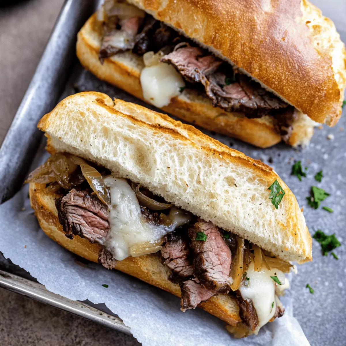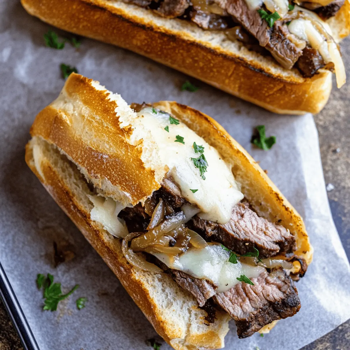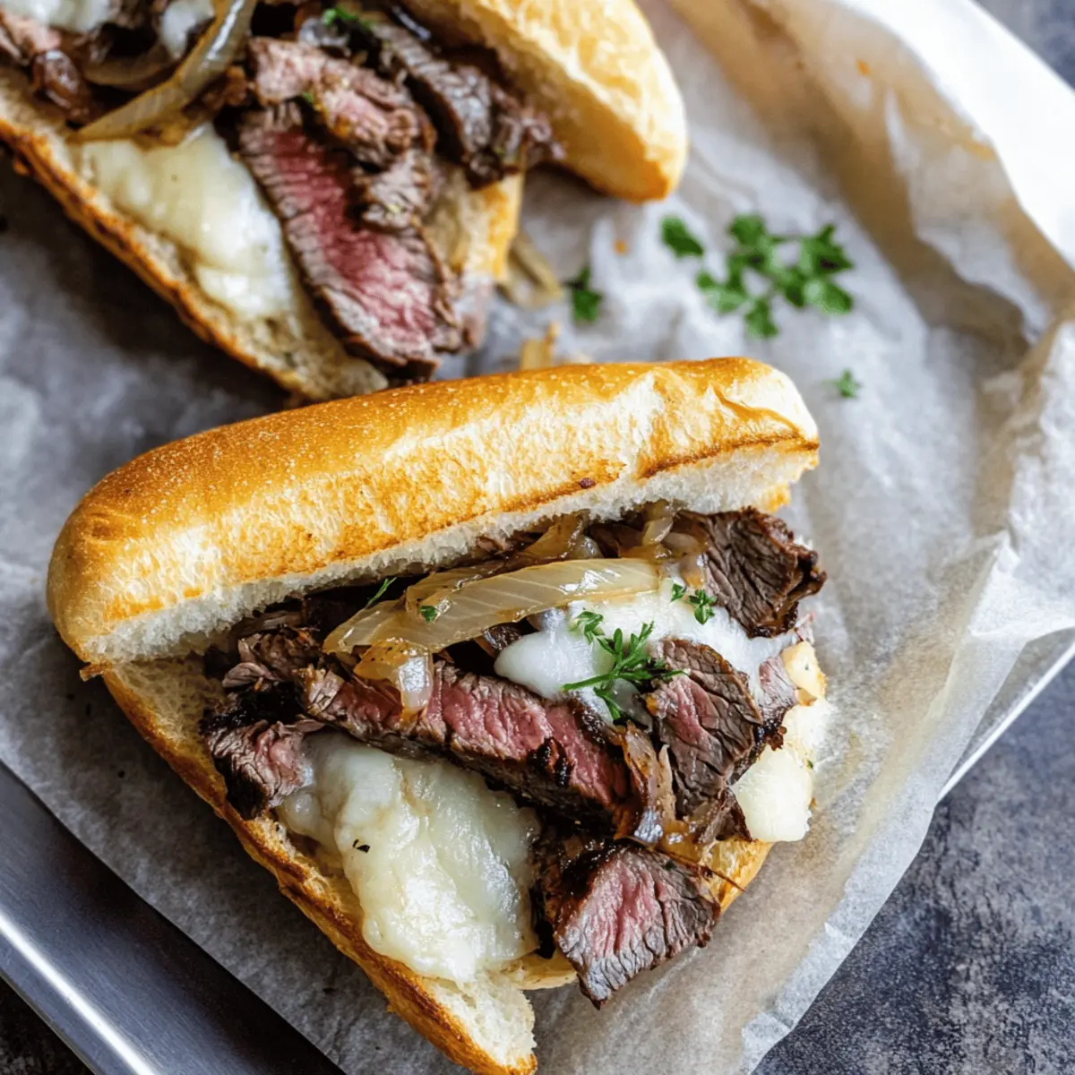 This steak sandwich recipe features tender ribeye, caramelized onions, and creamy havarti cheese, all in a crispy baguette.