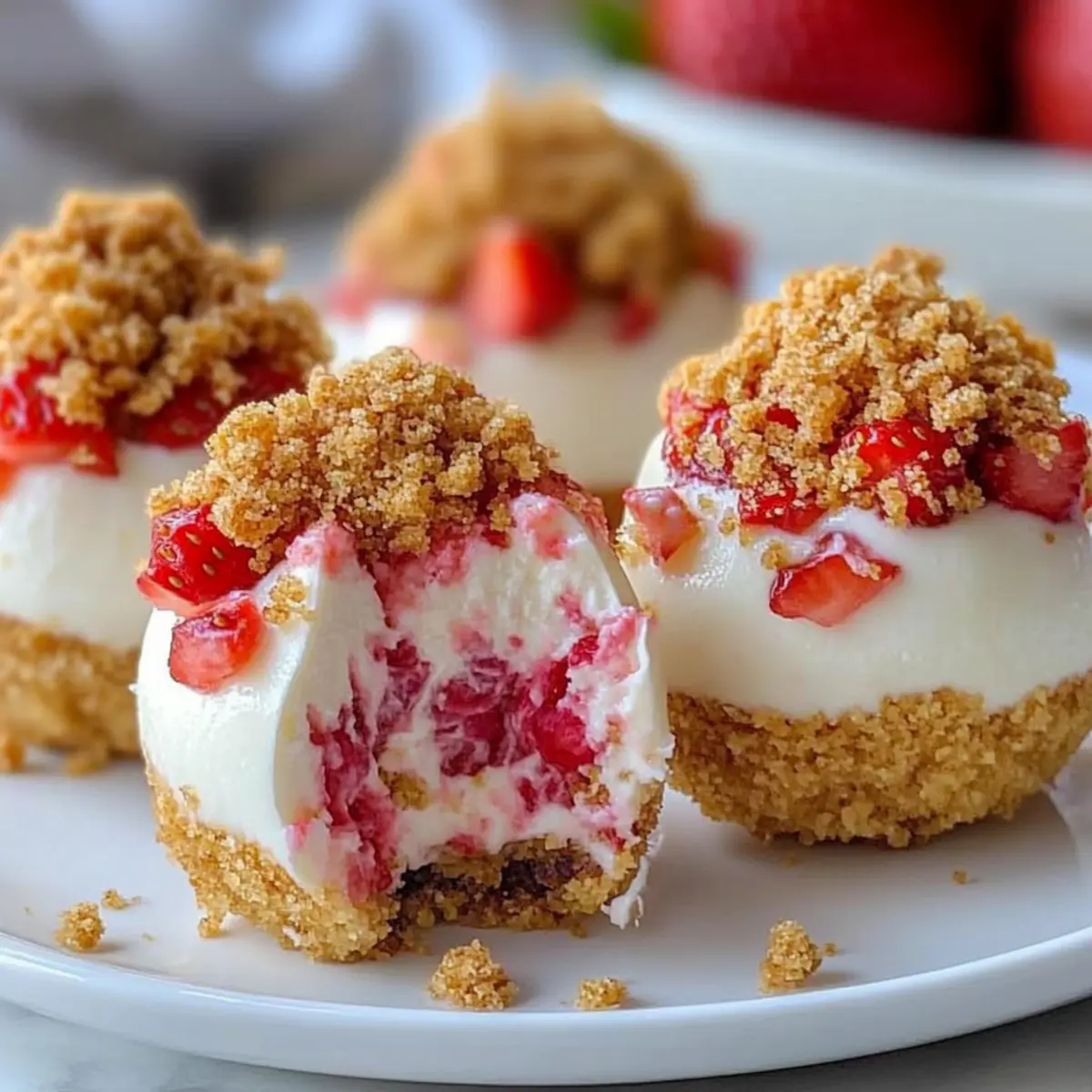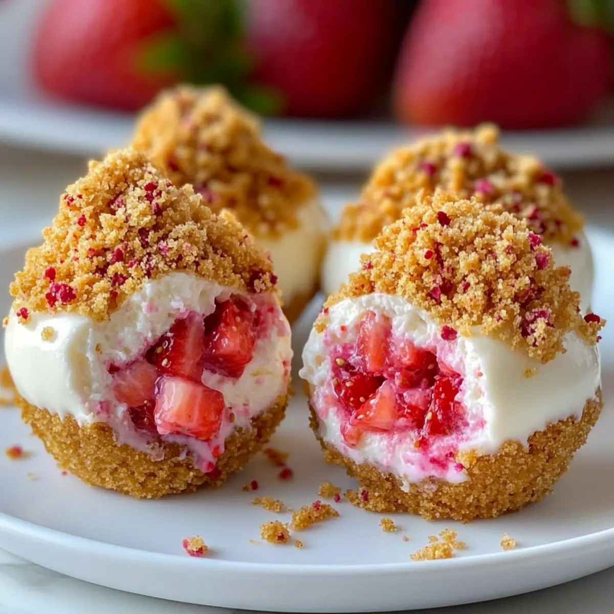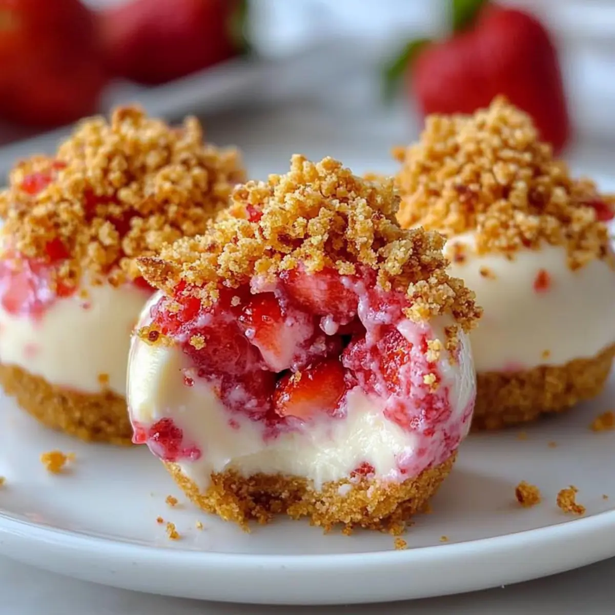 As I rummaged through my pantry looking for a delightful way to celebrate the sunny afternoon, I stumbled upon a secret stash of Golden Oreos. Instantly, inspiration struck! That’s how these Strawberry Crunch Cheesecake Bites were born. Not only are they a creamy make-ahead dessert that satisfies your sweet tooth, but they also offer a no-bake option that makes them incredibly easy to whip up. Perfect for gatherings or as a fun treat for kids, these bites seamlessly blend a buttery crust with a light cheesecake filling, all topped with a nostalgic crunchy layer that’s utterly irresistible. Are you ready to embark on a delicious journey with me and create these delightful petite desserts? Why are Strawberry Crunch Cheesecake Bites perfect? Creamy Delight: Each bite offers a rich, creamy texture that’ll have you savoring every single morsel. No-Bake Convenience: Say goodbye to complicated baking! These bites come together easily without firing up your oven. Kid-Friendly Fun: A fantastic treat for kids—mix and match flavors like blueberry or chocolate for extra excitement! Portable Pleasure: Perfect for gatherings or packed in lunchboxes, these bites take dessert on the go to a whole new level! For more scrumptious ideas, check out my Quinoa Crunch Salad for a perfect side or try the indulgence of Butter Steak Bites alongside these sweet treats! Strawberry Crunch Cheesecake Bites Ingredients For the Crust Crushed Golden Oreo Cookies – Base for the crust that adds sweetness and structure; substitute with regular Oreos for a different flavor profile. Unsalted Butter (5 tbsp) – Binds the crust ingredients together; ensure it is melted before mixing. Granulated Sugar (2 tbsp) – Sweetens the crust; can reduce for a less sweet base. For the Cheesecake Filling Cream Cheese (16 oz) – Main filling ingredient providing creaminess and texture; make sure it’s softened for easy mixing. Granulated Sugar (½ cup) – Sweetens the cheesecake filling; adjust to taste if desired. Sour Cream (½ cup) – Adds a tangy flavor and moisture to the filling; non-dairy yogurt can be used as a substitute. Large Eggs (2) – Provides structure; ensure they are at room temperature. Vanilla Extract (1 tsp) – Enhances flavor; substitute with almond extract for a different twist. Lemon Juice (1 tsp, optional) – Adds brightness; can omit if desired. Diced Fresh Strawberries (1 cup) or Strawberry Puree (¼ cup) – Adds fresh fruit flavor; can swap with other berries or fruit purees. For the Strawberry Crunch Topping Golden Oreos (20) – For the strawberry crunch topping; regular Oreos can be used. Strawberry Gelatin Mix (3 oz) – Provides color and additional strawberry flavor; freeze-dried strawberries can be used as a substitute for a more natural option. Butter (4 tbsp, melted) – Important for the crunch texture. For Garnish Whipped Cream & Fresh Strawberries – Optional for presentation and a touch of elegance. Dive into the bliss of these Strawberry Crunch Cheesecake Bites and let each creamy, crunchy bite transport you to dessert paradise! Step‑by‑Step Instructions for Strawberry Crunch Cheesecake Bites Step 1: Prepare the Crust Preheat your oven to 325°F (160°C). In a mixing bowl, crush the Golden Oreo cookies until they resemble fine crumbs. Combine the crushed cookies with melted butter and granulated sugar, stirring until well coated. Evenly distribute this mixture into mini cupcake liners, pressing down firmly to form a solid crust. Bake for 8-10 minutes until slightly golden, then allow them to cool. Step 2: Make the Cheesecake Filling In a large mixing bowl, beat softened cream cheese with granulated sugar using an electric mixer until smooth and creamy, roughly 2-3 minutes. Gradually add in the sour cream, then mix in the eggs one by one, followed by vanilla extract and lemon juice, if using. Fold in the diced strawberries or strawberry puree gently to keep some texture. Step 3: Bake the Cheesecakes Spoon the cheesecake filling evenly into the cooled crusts, filling them about three-quarters full. Bake in the preheated oven at 325°F (160°C) for 20-25 minutes until the centers are slightly jiggly but not fully set. Once baked, cool the bites to room temperature before chilling in the refrigerator for at least 2 hours, preferably overnight, to set completely. Step 4: Make the Strawberry Crunch Topping While the cheesecake bites chill, prepare the strawberry crunch topping. In a food processor, blend the remaining Golden Oreos with the strawberry gelatin mix and melted butter until the mixture is crumbly. Spread this mixture on a baking sheet and either bake at 350°F (175°C) for 5 minutes or let it air dry for a no-bake alternative, ensuring a deliciously crunchy topping. Step 5: Assemble & Chill Carefully remove the chilled cheesecake bites from the liners and place them on a serving platter. Generously sprinkle the strawberry crunch topping over each cheesecake bite, creating a delightful contrast of textures. Optionally, garnish with whipped cream and fresh strawberries for an elegant touch. Chill for an additional hour to meld the flavors before serving. Storage Tips for Strawberry Crunch Cheesecake Bites Fridge: Store the cheesecake bites in an airtight container for up to 4 days. Keep them chilled to maintain their creamy texture and fresh taste. Freezer: For longer storage, freeze the strawberry crunch cheesecake bites for up to 2 months. Make sure to wrap them individually in plastic wrap before placing them in a freezer-safe container. Thawing: To enjoy frozen bites, transfer them to the refrigerator to thaw overnight. This gradual thawing helps keep their creamy consistency intact. Reheating: While these bites are best served cold, you can let them sit at room temperature for about 15 minutes before serving to bring out their flavor. Enjoy your delicious Strawberry Crunch Cheesecake Bites! Make Ahead Options These Strawberry Crunch Cheesecake Bites are perfect for m