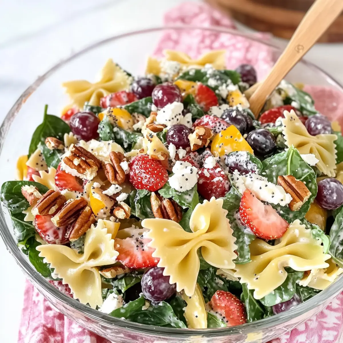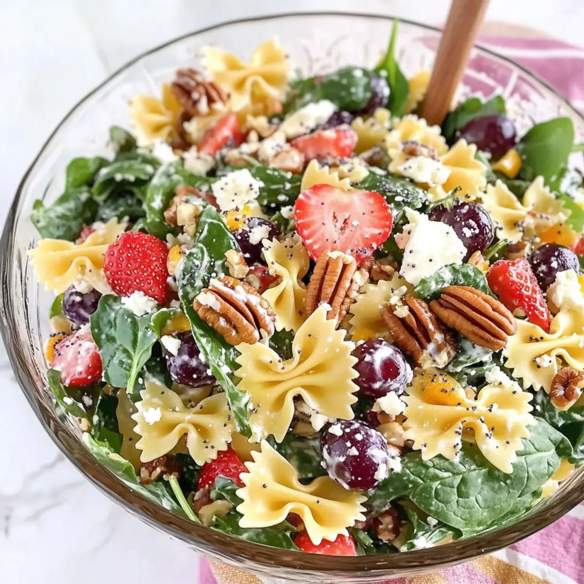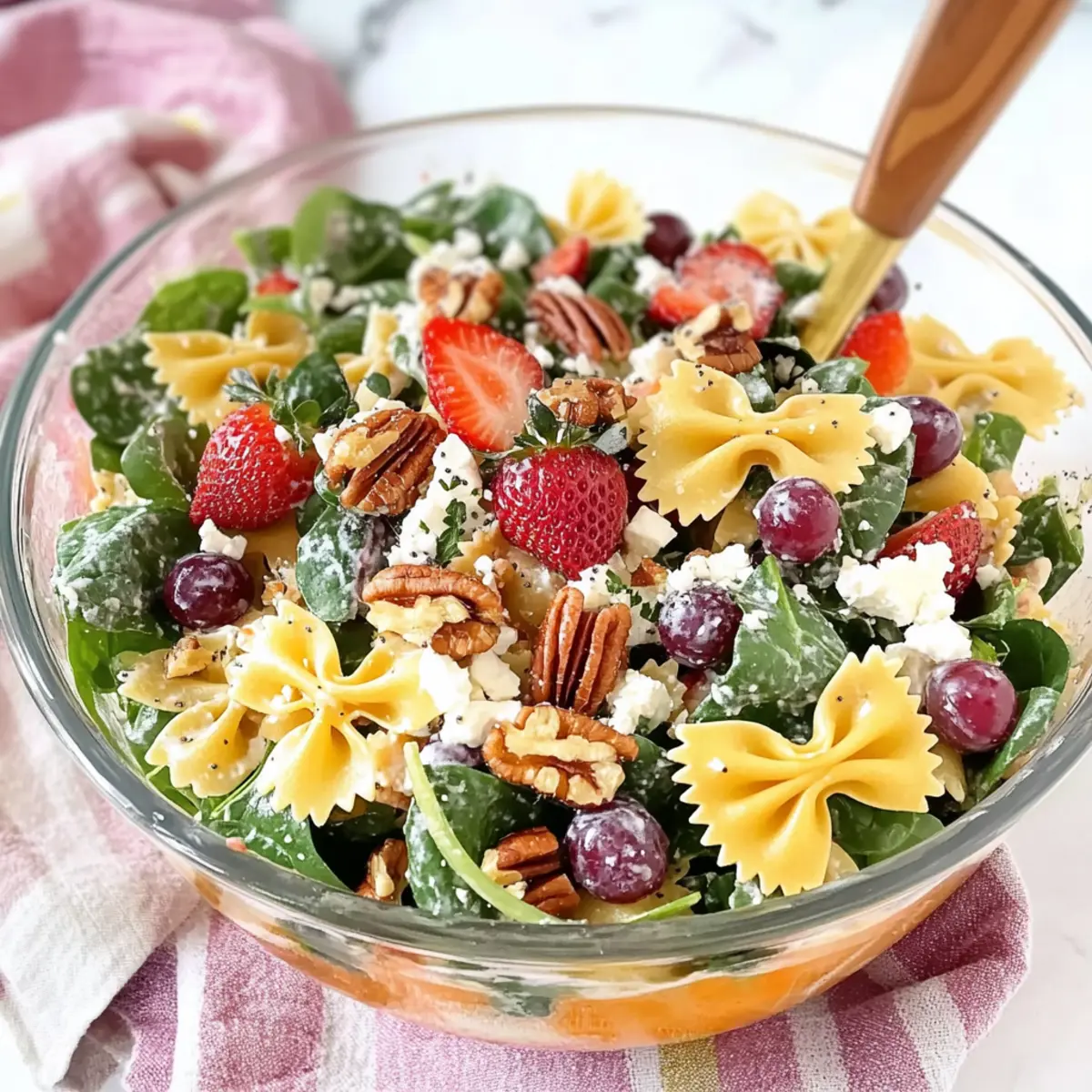As I crunched on the last bite of a summer picnic, something delightful hit my palate—a burst of sweet strawberries intertwined with the salty richness of feta. That unforgettable combination inspired my creation of Strawberry Fields Pasta Salad, a dish that’s not only a feast for the eyes but a soothing balm for those watching their fast-food intake. This vibrant salad comes together swiftly, making it an ideal companion for potlucks and lazy days in the sun. And the best part? It’s super versatile! With just a few simple swaps, you can easily tailor it to your taste. Ready to dive into a world of fresh flavors? Let’s mix up something special! Why You’ll Adore This Pasta Salad? Simplicity at its finest: With just a few steps, this recipe is perfect for busy days or impromptu gatherings! Vibrant flavors shine through with the pairing of sweet strawberries and tangy feta. Versatile and adaptable, you can switch up the ingredients as you please, like using Quinoa Crunch Salad for gluten-free options. Crowd-pleaser status guaranteed: whether at picnics or potlucks, it’s sure to impress everyone! Plus, it requires minimal prep time, allowing you to enjoy your summer without fuss. Strawberry Fields Pasta Salad Ingredients For the Pasta • Bow Tie Pasta – Offers a charming presentation; feel free to swap for rotini or penne. For the Fresh Elements • Strawberries – Bright and sweet; always use fresh, ripe ones for the best flavor. • Baby Spinach – Adds a mild, peppery taste; substitute with arugula for more spice. • Red Grapes – Juicy and sweet; green grapes can also work beautifully. • Mandarin Oranges – Adds a burst of sweetness; canned versions offer convenience. • Red Onion – Provides savory crunch; consider using green onions for a milder flavor. For the Salty Goodness • Feta Cheese – Brings a creamy, salty contrast; try goat cheese for a different twist. • Pecans – Offers a crunchy nutty flavor; walnuts or slivered almonds are great alternatives. For the Dressing • Poppy Seed Dressing – Lends a sweet and tangy touch; look for a comparable dressing if needed. • Salt and Pepper – Essential for enhancing the overall flavor; adjust to your taste. Make your Strawberry Fields Pasta Salad a refreshing addition to your summer meals! Enjoy the delightful blend of flavors and colors that always steals the show! Step‑by‑Step Instructions for Strawberry Fields Pasta Salad Step 1: Cook the Pasta Bring a large pot of salted water to a rolling boil over high heat. Add the bow tie pasta and cook according to package instructions until al dente, about 7-9 minutes. Once cooked, the pasta should be firm yet tender. Drain the pasta in a colander and rinse it under cold water to stop the cooking process and cool it down quickly. Step 2: Prepare the Salad Ingredients While the pasta cools, wash the strawberries, red grapes, and baby spinach thoroughly. Slice the strawberries and grapes in half, and if desired, finely chop the red onion. Combine all these fresh ingredients in a large mixing bowl, ensuring you have vibrant colors and textures that will enhance your Strawberry Fields Pasta Salad. Step 3: Combine Ingredients Once your pasta has cooled, gently add it to the bowl with the fruits and spinach. Include the mandarin oranges and crumbled feta cheese for a delightful contrast of flavors. Use a sturdy wooden spoon or spatula to mix everything together carefully, ensuring that the ingredients are evenly distributed throughout the salad. Step 4: Dress the Salad Drizzle the poppy seed dressing over the pasta salad, and sprinkle salt and pepper to your taste. Toss the mixture gently, being careful not to break the pasta or fruit pieces. The dressing should coat the ingredients nicely, creating a deliciously colorful dish that embodies the refreshing nature of the Strawberry Fields Pasta Salad. Step 5: Chill for Flavor Cover the bowl with plastic wrap or transfer the salad into an airtight container. Refrigerate for at least 30 minutes to allow the flavors to meld together beautifully. During this time, the fresh ingredients will soak up the dressing, intensifying the taste of your vibrant Strawberry Fields Pasta Salad. Step 6: Serve and Enjoy After chilling, your pasta salad is ready to serve! Scoop portions into individual bowls or onto a serving platter. The colorful mix of strawberries, feta, and spinach will be inviting and appetizing. This refreshing Strawberry Fields Pasta Salad is perfect for any summer gathering or picnic and will surely impress your guests! What to Serve with Strawberry Fields Pasta Salad? Imagine a delightful summer gathering, where vibrant flavors and fresh aromas dance through the air, creating a relaxed and inviting atmosphere. Grilled Chicken Skewers: Juicy and tender bites that add a savory protein contrast to the sweetness of the salad. Trust me, these are a match made in heaven! Corn on the Cob: Sweet, juicy, and simple to prepare; the natural sweetness complements the strawberries nicely while offering a satisfying crunch. Caprese Salad: A refreshing blend of tomatoes, mozzarella, and basil that brings a burst of Italian flavors, perfectly balancing the sweet and tangy notes of your pasta salad. Teriyaki Shrimp: The sweet and savory glaze of the shrimp elevates your meal, creating a harmonious taste that will leave everyone wanting more. Sparkling Lemonade: Crisp and refreshing, this drink provides a zesty kick that enhances the lightness of the pasta salad, making it even more delightful. Berry Tart: A sweet finish to your meal, this delightful dessert echoes the fresh berries in the salad, leaving guests with a smile and a satisfied palate. Roasted Vegetables: Earthy and hearty, they provide a pleasant contrast to the sweet elements in the salad, enriching the overall dining experience. Strawberry Fields Pasta Salad Variations Feel free to customize your pasta salad to create your perfect summer blend of flavors! Protei