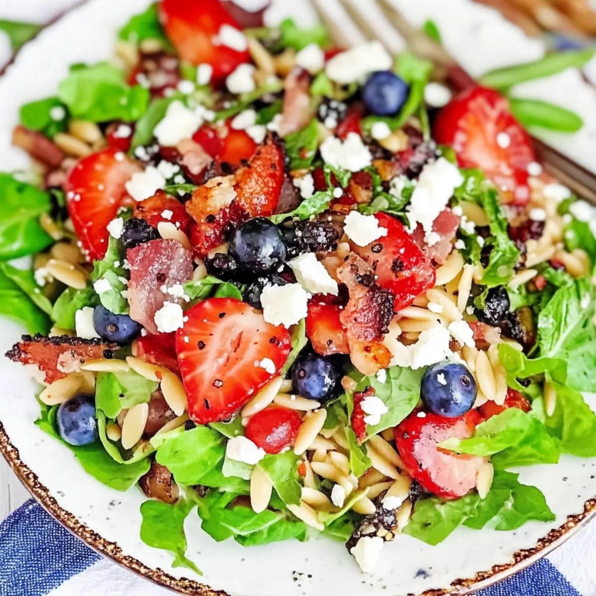 As I watched the sun dip below the horizon, a vibrant potluck sprang to mind—a gathering filled with laughter, sunshine, and, of course, food! That’s when I envisioned the Strawberry Orzo Spring Salad, a dish that’s not just a feast for the eyes but also a quick and versatile answer to the summer cooking dilemma. In around 20 minutes, you can whip up this delightful salad, featuring juicy strawberries, tender orzo, and crispy bacon, making it the perfect centerpiece for brunch or a light summery lunch. Best of all, it’s family-friendly and showcases fresh flavors that will have everyone coming back for seconds. So, are you ready to tantalize your taste buds with this seasonal gem? Why is this salad a must-try? Vibrant Colors: This Strawberry Orzo Spring Salad bursts with beautiful hues that are as inviting as they are nutritious. Fresh Ingredients: Utilizing ripe fruits and crisp greens ensures every bite is a celebration of freshness. Quick Prep: Ready in just 20 minutes, it’s perfect for those busy summer days. Family-Friendly: With flavors appealing to both kids and adults, it’s a crowd-pleaser for any gathering. Versatile Options: Feel free to swap in seasonal ingredients or even try it with quinoa for a hearty twist! Pair it with your favorite grilled meats or a light dessert like no-bake peach cheesecake for the ultimate meal. Strawberry Orzo Spring Salad Ingredients For the Salad • Strawberries – Fresh and sweet; select only ripe strawberries for optimal flavor. • Orzo – A small, rice-shaped pasta that adds substance; cook according to package instructions. • Blueberries – Offer tartness to balance sweetness; can substitute with raspberries for variety. • Baby Spring Mix – Tender greens for a light base; alternative greens like spinach or arugula work well. • Feta Cheese – Creamy and salty; feel free to use other soft cheeses if desired. • Bacon – Adds a crunchy, savory aspect; opt for plant-based bacon or omit for a vegetarian version. • Cherry Tomatoes – Provide sweet flavor bursts; diced bell peppers can be a crunchy alternative. • Shallots – Bring a mild onion taste; soak in cold water to reduce harshness. For the Dressing • Red Wine Vinegar – Adds tang; balancing the sweetness of the fruits in the salad. • Balsamic Vinegar – Gives a rich depth of flavor; can be swapped with apple cider vinegar. • Honey – Sweetens the dressing; use maple syrup for a vegan alternative. • Dijon Mustard – Offers a hint of spice; helps emulsify the dressing beautifully. • Poppy Seeds – For a texture contrast; optional but enhance the dressing’s visual appeal. • Kosher Salt – Enhances flavors; always adjust to taste. • Extra-Virgin Olive Oil – A must for richness; use high-quality oil for the best flavor. Whip up this Strawberry Orzo Spring Salad, and prepare to impress your family and friends with its delightful freshness and vibrant colors! Step‑by‑Step Instructions for Strawberry Orzo Spring Salad Step 1: Make the Dressing In a blender, combine 1 cup of sliced strawberries, red wine vinegar, balsamic vinegar, diced shallot, honey, Dijon mustard, poppy seeds, and a pinch of kosher salt. Blend the ingredients on high for about 30 seconds until smooth. Gradually pour in ½ cup of extra-virgin olive oil while blending on low to create a creamy, emulsified dressing. Set it aside for flavors to develop. Step 2: Prepare the Salad Base In a large mixing bowl, combine 3 cups of baby spring mix with 1 ½ cups of cooked and cooled orzo, crumbled feta cheese, sliced shallots, and halved cherry tomatoes. Next, add in 4 strips of crispy bacon, chopped into bite-sized pieces. Gently toss the ingredients together with your hands, ensuring an even distribution of all the flavors that make up the Strawberry Orzo Spring Salad. Step 3: Add Fruits Carefully fold in the remaining sliced strawberries and 1 cup of blueberries into the salad mixture. Sprinkle a pinch of salt over the fruits to enhance their sweetness and freshness. Use a spatula to gently incorporate the berries without smashing them, ensuring that each delicious fruit is evenly spread throughout for a vibrant presentation in your Strawberry Orzo Spring Salad. Step 4: Dress the Salad Drizzle your freshly made dressing over the salad mixture. Using tongs, toss the salad gently to coat all the ingredients evenly in the dressing, allowing each component to adhere to the others beautifully. Be sure to do this just before serving to keep the greens crisp and fresh in your Strawberry Orzo Spring Salad. Step 5: Garnish and Serve Finish off your Strawberry Orzo Spring Salad by garnishing it with freshly torn basil leaves for an aromatic touch. Serve the salad immediately on individual plates or in a large serving bowl to share. The vibrant colors and enticing aroma will welcome your family and friends to dig in right away, making it a refreshing centerpiece for any summer gathering. What to Serve with Strawberry Orzo Spring Salad? This vibrant salad can turn any meal into a celebration, but pairing it with delightful sides can truly elevate the experience. Grilled Chicken Skewers: Juicy chicken adds a savory touch, perfectly balancing the sweetness of the salad with its light char. Vegetable Quinoa: A nutty, protein-packed quinoa dish mingles well with the fresh flavors, making for a wholesome and satisfying meal. Roasted Asparagus: Tender, roasted asparagus lends a delightful crunch and earthy flavor that complements the fruity notes of the salad. Crispy Garlic Bread: Warm, crusty bread slathered with garlic butter is perfect for savoring every last bit of the delicious dressing. Chilled White Wine: A crisp, refreshing Sauvignon Blanc brings out the salad’s flavors, enhancing the overall freshness and making it feel like summer. Fruit Sorbet: Light and refreshing, a scoop of sorbet serves as the perfect cool down dessert while keeping the meal fruity and festive. Coconut Rice Puddi