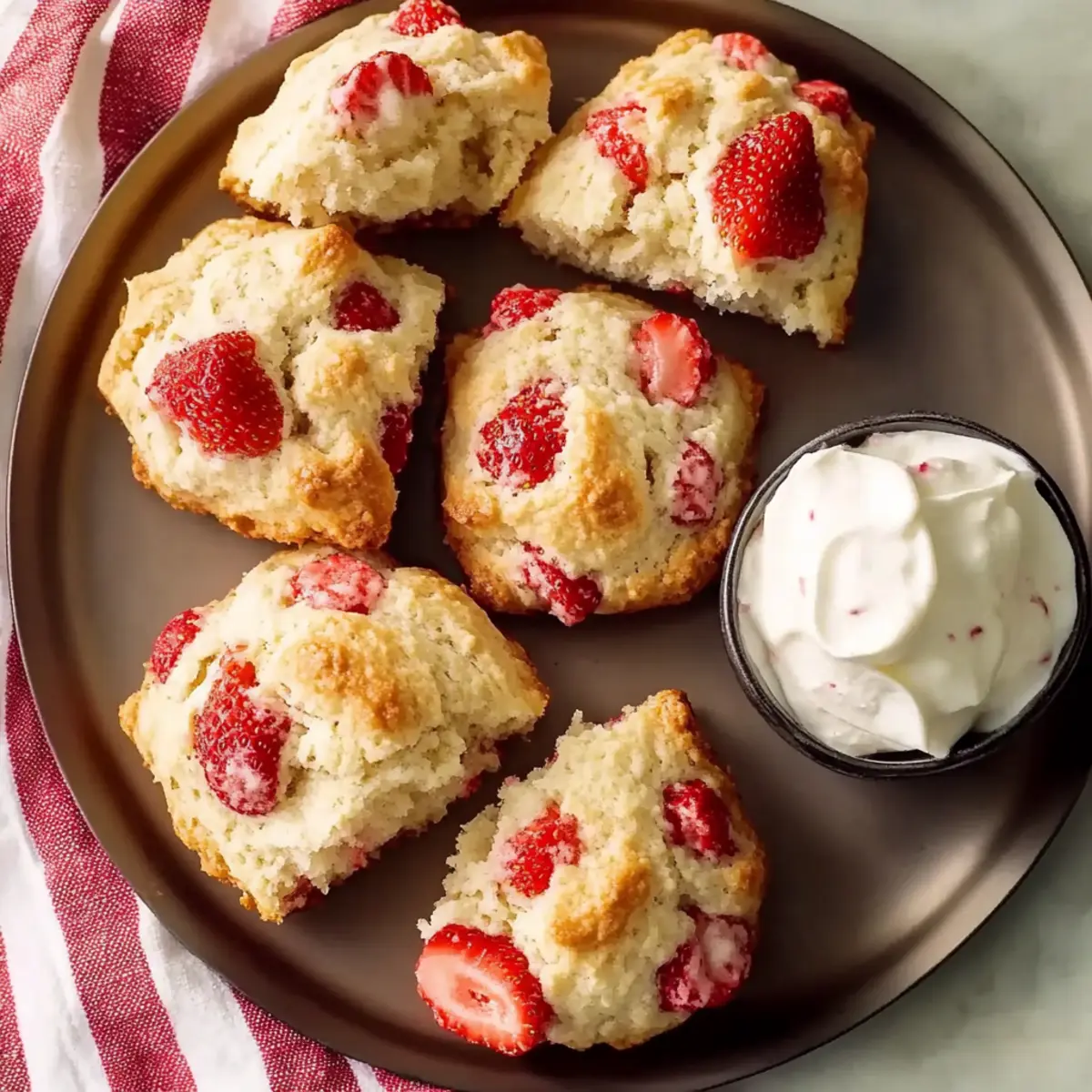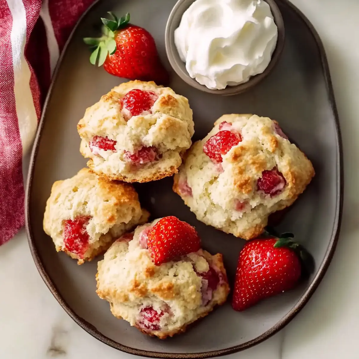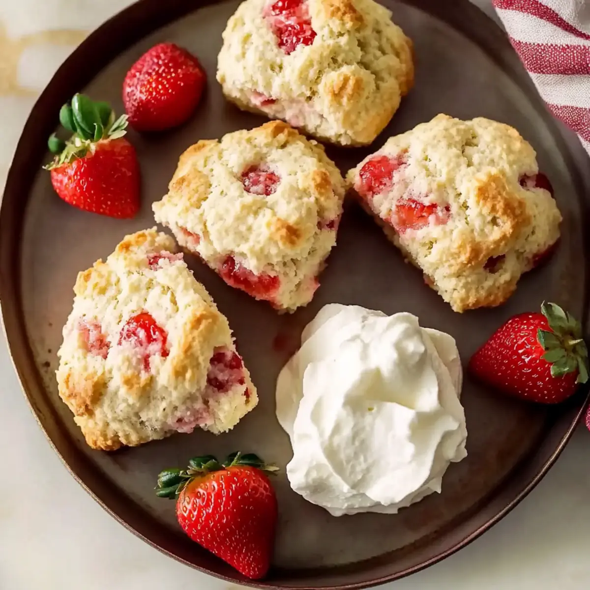 As I sifted through the fresh strawberries on my kitchen counter, the aroma of summer filled the air, sparking a wave of nostalgia. This inspired me to whip up a batch of delectable Strawberry Vanilla Bean Scones. Perfect for a leisurely weekend breakfast or an elegant afternoon tea, these scones come together effortlessly in just 30 minutes. With their flaky texture and bursts of sweetness from ripe strawberries, they’re not only a quick and easy treat but also a delightful way to engage the whole family in baking. Imagine savoring them still warm, perhaps with a dollop of clotted cream or a drizzle of honey. Are you ready to elevate your brunch game and create a centerpiece that’s sure to impress? Why are Strawberry Vanilla Bean Scones a must-try? Quick and Easy: In just 30 minutes, you can whip up a batch of these scrumptious scones, making them perfect for those busy mornings. Bursting with Flavor: The blend of fresh strawberries and aromatic vanilla creates a delightful sensory experience that your taste buds will love. Family Fun: This recipe is an engaging way to get the whole family involved in baking; it’s a fun project that’s easy for kids to join in on! Versatile Treat: Enjoy these scones for breakfast, brunch, or afternoon tea. They pair beautifully with coffee or tea, making them a great crowd-pleaser for gatherings—try serving alongside your favorite tea from the Brew Perfect Tea guide! Irresistible Texture: Each scone promises a flaky exterior and a tender crumb, ensuring a bite that’s satisfying and oh-so-delicious. Enjoy them with whipped cream or a drizzle of honey for an extra touch of luxury! Strawberry Vanilla Bean Scones Ingredients • Here’s everything you need to create these tasty treats! For the Scones Self-Raising Flour – Provides the structure and rise of the scones; you can substitute with all-purpose flour plus 1.5 tsp baking powder per cup if necessary. Salt – Enhances flavor; use either sea salt or table salt interchangeably. Superfine Sugar – Sweetens the dough and helps create a tender texture; regular granulated sugar can work if you blend it finer. Vanilla Powder – Adds rich vanilla flavor; you can swap with 2 tsp of vanilla extract if preferred. Heavy Cream – Ensures a rich and fluffy scone texture; make sure to use cream with at least 36% fat. Fresh Strawberries – Provide natural sweetness and moisture; select firm, ripe berries for the best results. Lemon Zest – Brightens flavor; it can be omitted but enhances the taste beautifully. These delightful Strawberry Vanilla Bean Scones are a sure way to impress at your next brunch or family gathering! Step‑by‑Step Instructions for Strawberry Vanilla Bean Scones Step 1: Preheat the Oven Begin by preheating your oven to 220°C (425°F) to ensure it’s hot enough for baking the scones. While the oven heats, line a baking sheet with parchment paper to prevent sticking and ensure easy cleanup later. This initial step sets the stage for perfectly baked Strawberry Vanilla Bean Scones with a lovely golden crust. Step 2: Prepare the Strawberries Next, chop fresh strawberries into 1/2-inch pieces, being gentle to avoid crushing them. Place the chopped strawberries in a bowl, and set them aside while you prepare the dough. If using other berries, make sure they are firm and ripe for the best sweetness and moisture in your scones. Step 3: Mix Dry Ingredients In a large mixing bowl, whisk together self-raising flour, salt, superfine sugar, vanilla powder, and lemon zest until well combined. This blend brings out the delightful flavors of the Strawberry Vanilla Bean Scones, making sure every bite is bursting with sweetness. The light, fluffy flour mixture is key to achieving the desired scone texture. Step 4: Fold in Strawberries Gently fold the chopped strawberries into the dry mixture. Be careful here—avoid mashing the strawberries to retain their shape and juicy texture. This careful folding will ensure that every scone is packed with sweetness from the strawberries while maintaining the integrity of your scone dough. Step 5: Combine with Cream Pour in the cold heavy cream, stirring with a spatula until a shaggy dough forms, which should take about 30 to 45 seconds. The cold cream is essential to achieve the rich, fluffy texture of your Strawberry Vanilla Bean Scones. The dough will appear rustic, but that’s just what you want for a tender scone! Step 6: Shape the Dough Lightly flour a clean surface and turn the shaggy dough out. Pat it down gently to about 1 cm thickness, being careful not to compress it. This shaping is crucial for achieving those light, flaky layers that make scones so delightful. Keep an eye on the thickness to ensure even baking. Step 7: Cut the Scones Using a biscuit cutter or a sharp knife, cut the dough into rounds or wedges, then place them on the prepared baking sheet. Ensure there’s some space between each piece to allow room for rising. The sight of these pre-baked Strawberry Vanilla Bean Scones will excite you for the delicious treat to come. Step 8: Bake to Perfection Bake the scones in the preheated oven for 8-10 minutes, or until they are puffed up and golden brown on the edges. Keep an eye on them towards the end of baking to achieve that perfect golden hue. Your kitchen will fill with the irresistible aroma of fresh scones—it’s simply delightful! Step 9: Cool and Serve Once baked, let the Strawberry Vanilla Bean Scones cool on a rack for about 5 minutes before serving. This brief cooling period allows them to firm up slightly while keeping that tender crumb. Serve warm with clotted cream, fresh jam, or simply on their own to savor the flavors fully. What to Serve with Strawberry Vanilla Bean Scones Imagine the bliss of a leisurely brunch, where the air is filled with sweet strawberry aromas and laughter lingers over warm pastries. Clotted Cream: A dollop of rich clotted cream perfectly complements the scones’ sweetness, adding an indulg
