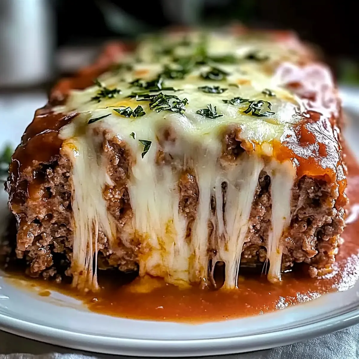 In the hustle of our busy kitchens, there’s a dish that quietly reigns supreme—the classic meatloaf. But don’t settle for ordinary; let me introduce you to my irresistible Stuffed Meatloaf with Mozzarella. This hearty recipe not only promises a gooey, cheesy center but also transforms a simple weeknight dinner into a mouthwatering event. Picture your family gathering around the table, eyes lighting up as they slice into that golden exterior, revealing melty mozzarella that teases with each bite. It’s rich in Italian flavors and takes just 15 minutes of prep time, making it as easy to whip up as it is delightful to devour. Appreciate the comfort it brings while savoring the joy of homemade food without the fast-food fuss. Trust me, once you try it, you’ll see why this stuffed meatloaf could become the star of your dinner rotation. Ready to dive into comfort food paradise? Why Is Stuffed Meatloaf So Irresistible? Comforting and hearty, this Stuffed Meatloaf with Mozzarella is the ultimate family favorite, bringing smiles to the dinner table. Flavor-packed, the gooey mozzarella center harmonizes beautifully with the savory spices—perfecting every bite. Quick prep time of just 15 minutes means less fuss and more family time! Versatile options allow you to swap ground beef for turkey or even make it gluten-free with alternative binders. Ideal for leftovers, this dish tastes phenomenal the next day—just like in our Creamy Shrimp Alfredo with Cream Cheese for an indulgent twist! Trust me, once you serve this crowd-pleaser, it will instantly elevate any ordinary weeknight! Stuffed Meatloaf with Mozzarella Ingredients • Get ready for a comforting, hearty dish! For the Meatloaf • Ground Beef – 2 lbs of 80/20 ground beef provides optimal flavor and juiciness; consider dark meat turkey for a leaner option. • Breadcrumbs – 1/2 cup for structure; Italian seasoned enhances flavor, but you can substitute with crushed crackers or oats. • Eggs – 2 large eggs for binding; essential for holding the meatloaf together. • Milk – 1/2 cup to add moisture; almond milk is a great dairy-free option. • Onion – 1 small, finely chopped for flavor; can be omitted for a simpler dish. • Garlic – 3 cloves, minced for a robust aroma and flavor. • Worcestershire Sauce – 2 tablespoons add umami depth to your Stuffed Meatloaf with Mozzarella. • Tomato Paste – 1 tablespoon for richness; helps balance flavors perfectly. • Salt – 1 teaspoon for seasoning; enhances the dish without overpowering it. • Black Pepper – 1/2 teaspoon adds a subtle kick; adjust to taste if you like it spicier. • Dried Oregano – 1 teaspoon for herby notes that complement the meatloaf perfectly. • Dried Basil – 1 teaspoon to enhance the Italian flair of the dish. • Shredded Mozzarella – 1 1/2 cups or cut fresh mozzarella sticks for that delicious cheesy center. For the Glaze • Ketchup – 1/3 cup for glaze; adds sweetness and a beautiful top layer. • Brown Sugar – 2 tablespoons enhance glaze richness and caramelization. • Balsamic Vinegar – 1 tablespoon adds a tangy depth to the glaze. For Garnish • Chopped Parsley – A handful for a fresh finish; totally optional but adds a lovely touch! Step‑by‑Step Instructions for Stuffed Meatloaf with Mozzarella Step 1: Preheat the Oven Begin by preheating your oven to 375°F (190°C). While it warms up, prepare a baking sheet by lining it with foil or parchment paper, or grease a loaf pan generously to prevent sticking. This step ensures even cooking and easy cleanup for your delicious Stuffed Meatloaf with Mozzarella. Step 2: Mix the Meat Mixture In a large mixing bowl, combine the ground beef, breadcrumbs, eggs, milk, chopped onion, minced garlic, Worcestershire sauce, tomato paste, salt, black pepper, dried oregano, and basil. Use your hands to mix until just combined, being careful not to overwork the meat. This will keep your meatloaf tender and juicy, setting the stage for the gooey mozzarella center. Step 3: Shape the Meatloaf Transfer half of the meat mixture onto a clean surface or into your prepared loaf pan. Shape it into a loaf, about 2 inches high, and create a trench down the center to hold the mozzarella. This trench is crucial for housing that melty cheese, and it allows for even baking while adding a delightful surprise in every slice. Step 4: Add the Mozzarella Fill the trench with shredded mozzarella or fresh mozzarella sticks, ensuring it’s generously packed. Once filled, carefully cover the cheese with the remaining meat mixture, sealing the edges tightly to prevent any cheese from oozing out during baking. This assembly is key for a perfectly stuffed meatloaf! Step 5: Prepare the Glaze In a small bowl, mix together the ketchup, brown sugar, and balsamic vinegar to create a rich glaze. Once combined, brush this mixture generously over the top of your Stuffed Meatloaf with Mozzarella. The glaze will add a fantastic caramelized finish and a hint of sweetness to complement the savory flavors inside. Step 6: Bake the Meatloaf Place your meatloaf in the preheated oven and bake for 50 to 60 minutes. You’ll know it’s done when the internal temperature reaches 160°F (71°C). If the top is browning too much, tent it with foil for the last 15 minutes to allow it to cook through without drying out. Step 7: Let It Rest Once baked, remove the Stuffed Meatloaf with Mozzarella from the oven and let it rest for 10 minutes. This resting period allows the juices to redistribute throughout the meatloaf, ensuring each slice is juicy and flavorful. Resist the urge to slice it right away; that patience is key for optimum taste. Step 8: Slice and Serve After resting, slice your meatloaf into thick portions to reveal the delightful cheesy center. Serve it warm with your favorite sides, and consider garnishing with a sprinkle of chopped parsley for a fresh touch. This meal is sure to impress your family and turn dinner into a coz