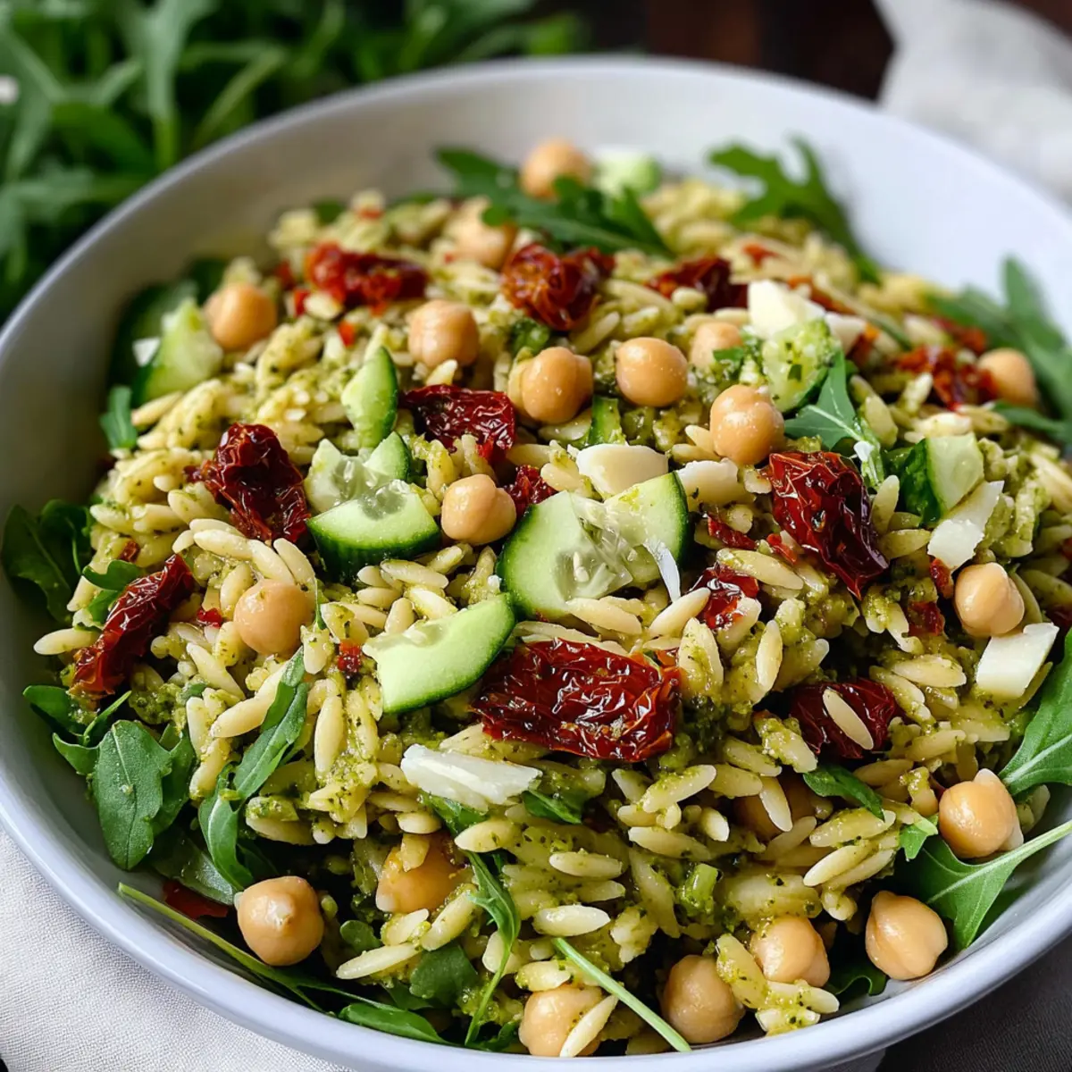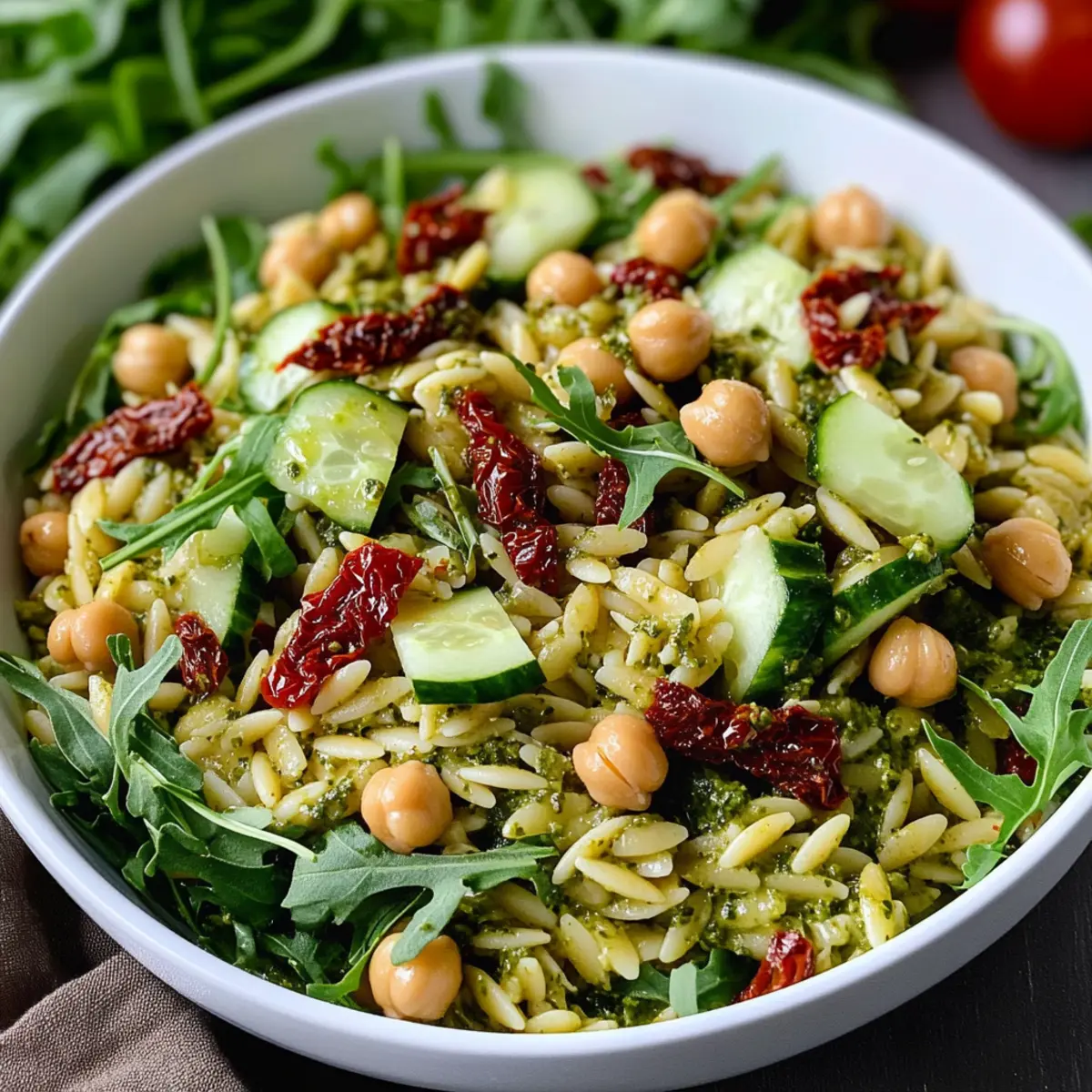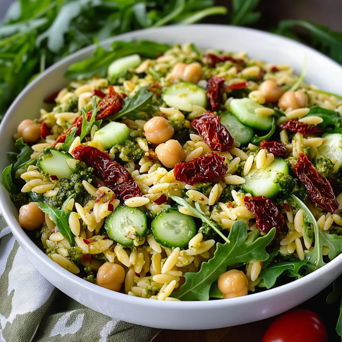 In a large mixing bowl, combine the cooled orzo with a generous amount of pesto and drizzle in some extra virgin olive oil for added richness. Then, toss in the diced cucumber, sliced sun-dried tomatoes (if oil-packed, include some oil), chickpeas, feta (or vegan feta), chopped parsley, peppery arugula, and a squeeze of fresh lemon juice for balance.