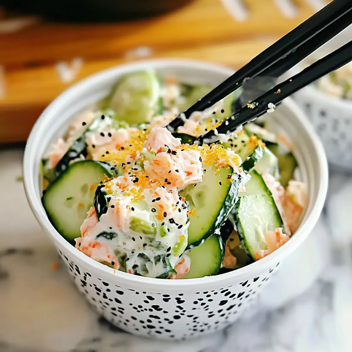 Choose your desired protein mix-ins, such as imitation crab, smoked salmon, canned tuna, or shrimp, and fold them gently into the creamy dressing. If you’re leaning towards a vegetarian option, consider adding chickpeas or cubed tofu as a substitute for added heartiness. Stir until everything is evenly coated with the dressing, ensuring every bite of your Sushi Cucumber Salad is packed with flavor.