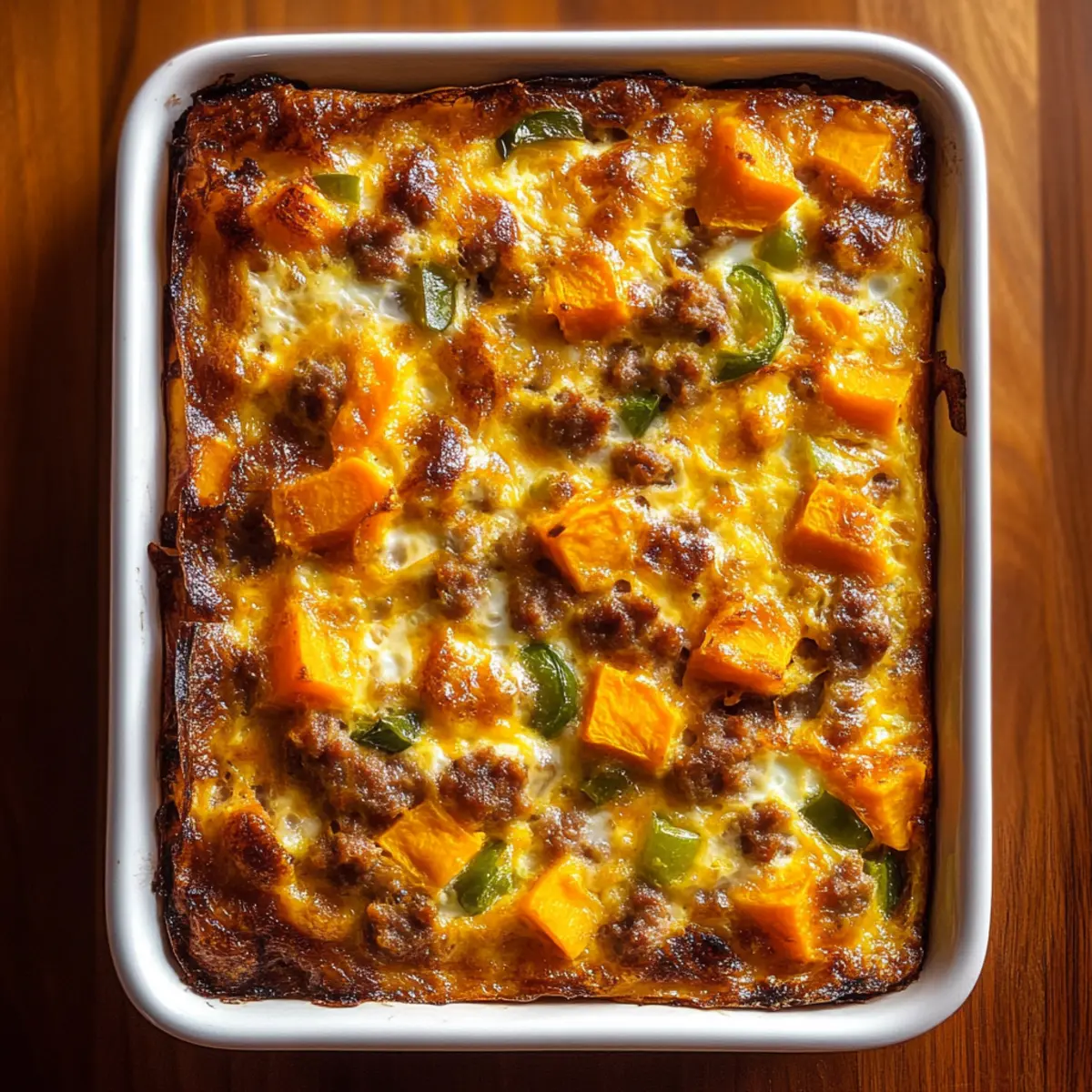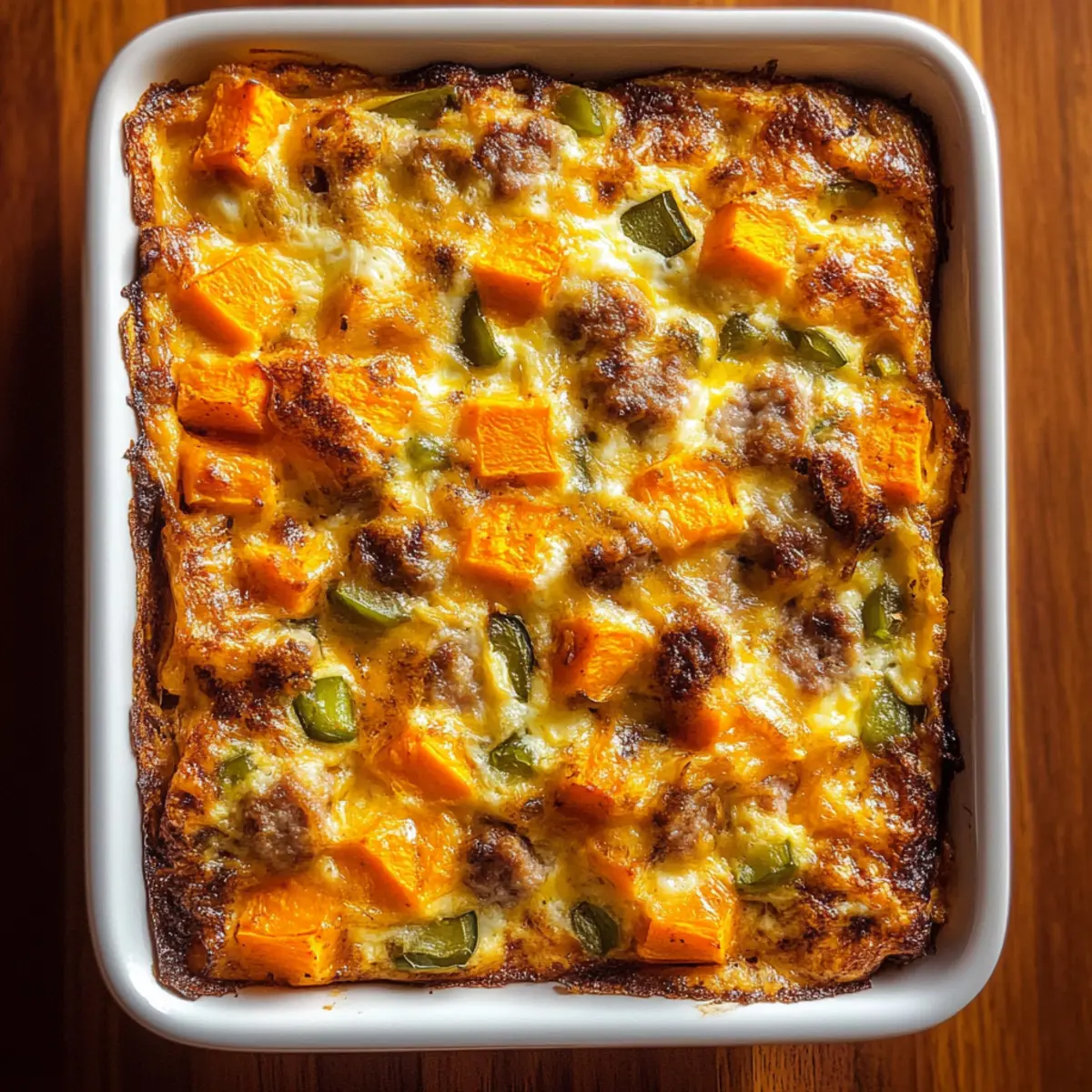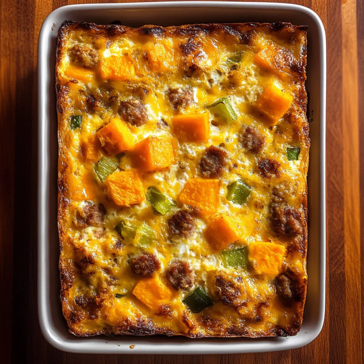 As I stood in my kitchen surrounded by colorful vegetables and the warm aroma of sweet potatoes, I couldn’t help but feel inspired to create something truly comforting. That’s how this Easy Sweet Potato Egg Casserole became a breakfast staple in my home. This dish marries the deliciously sweet flavor of roasted sweet potatoes with protein-packed eggs and savory cheese, making it not only a nourishing start to the day but also a meal prep champ. Perfect for busy mornings, this casserole can be assembled in advance, allowing it to seamlessly transition from fridge to oven with minimal fuss. Whether you’re feeding a family or just looking to savor a wholesome meal, this recipe is your ticket to a cozy morning routine. Curious how this colorful casserole comes together? Let’s dive in! Why is Sweet Potato Egg Casserole Perfect? Nutritious and filling: Packed with protein from eggs and the healthy benefits of sweet potatoes, this casserole ensures you start your day right. Time-saving convenience: Prep your Sweet Potato Egg Casserole the night before, making busy mornings a breeze. Crowd-pleaser appeal: Its colorful and flavorful profile means family and friends will be asking for seconds! Versatile base: Feel free to substitute ingredients, like using kale in place of green peppers or swapping in vegetarian sausage for a meatless version. Comfort food at its finest: The fluffy texture and savory notes create a cozy dish that feels like a warm hug on a plate. If you find yourself enjoying this savory delight, consider pairing it with a refreshing fruit salad or a simple mixed greens salad for a complete meal. Sweet Potato Egg Casserole Ingredients • Get ready to whip up a delightful dish! For the Casserole Sweet Potatoes – provide natural sweetness and a comforting texture; use Garnet or Jewel varieties for best results. Eggs – serve as the binding agent; they’re essential for structure. Cheese – adds creaminess and flavor; shredded cheese is recommended for melting. Onion – contributes savory depth; can easily be substituted with shallots for a milder taste. Green Pepper – adds flavor and color; any bell pepper variety works great here. Turkey Sausage – adds protein and richness; substitute with vegetarian sausage if preferred. Garlic – enhances overall flavor and aroma; don’t skip this for a savory boost. Avocado Oil – used for sautéing vegetables; olive oil is a good substitute if needed. Fresh Thyme – introduces herbal notes; dried thyme can work in a pinch. Milk – adds moisture to the egg mixture; opt for plant-based milk for a dairy-free version. Salt and Pepper – essential seasonings to elevate the flavors of this Sweet Potato Egg Casserole. For Serving Mixed Greens – a fresh side to balance the richness of the casserole; toss with lemon vinaigrette. Fresh Fruit Salad – adds a sweet and refreshing contrast, perfect for those busy mornings. Get your ingredients ready, and let the magic of cooking unfold! Step‑by‑Step Instructions for Sweet Potato Egg Casserole Step 1: Preheat the Oven Preheat your oven to 350°F (175°C) to prepare for baking the Sweet Potato Egg Casserole. Make sure your rack is positioned in the center for even cooking. While the oven warms up, grab your casserole dish and generously grease it with butter or cooking spray to ensure easy release after baking. Step 2: Prepare the Vegetables Chop the sweet potatoes, onion, and green pepper into small, uniform pieces, approximately 1-inch in size. This helps them cook evenly and meld beautifully. Set them aside in a large bowl, visually admiring the vibrant colors as they come together for this comforting dish. Step 3: Sauté the Vegetables In a Dutch oven, heat 2 tablespoons of avocado oil over medium heat. Add the chopped onion and green pepper to the pan, sautéing for 3-4 minutes until they begin to soften. Then, toss in the sweet potatoes and cook for an additional 5-6 minutes, stirring occasionally. Add minced garlic during the last minute of cooking for an aromatic finish. Step 4: Transfer the Vegetables Carefully transfer the sautéed mixture of sweet potatoes, onion, and green pepper to the greased 9×13-inch casserole dish. Use a spatula to spread the mixture evenly while admiring the warm, inviting colors. This forms the hearty base of your Sweet Potato Egg Casserole, ready for the next layers. Step 5: Cook the Sausage In the same Dutch oven, if needed, add a bit more avocado oil and cook the turkey sausage over medium heat. Break it into small pieces with a spatula, cooking for about 5-6 minutes until browned and fully cooked. Once done, drain any excess fat and mix the sausage with the vegetable mixture in the casserole dish. Step 6: Whisk the Egg Mixture In a large mixing bowl, whisk together 6 eggs, 1 cup of milk, 1 teaspoon of fresh thyme, salt, and pepper until thoroughly blended. Add in 1 cup of shredded cheese, mixing until the entire mixture is smooth. This mixture will provide the creamy, luscious texture that binds the Sweet Potato Egg Casserole together. Step 7: Combine and Pour Gently pour the egg mixture over the sausage and vegetable blend in the casserole dish. Use a large spoon or spatula to stir everything together lightly, ensuring that the egg coats all the ingredients evenly, creating a delightful harmony of flavors before baking. Step 8: Bake the Casserole Place the filled casserole dish in the preheated oven and bake for 40-45 minutes. Look for the center to be firm and the top golden brown. If the top is browning too quickly, cover it with foil for the remaining baking time to prevent it from becoming too dark. Step 9: Rest Before Serving Once baked to perfection, remove the casserole from the oven and allow it to rest for 15 minutes. This resting time will ensure that the Sweet Potato Egg Casserole sets properly, making for cleaner slices and a more enjoyable serving experience. Make Ahead Options These Easy Sweet Potato Egg Casseroles are a l