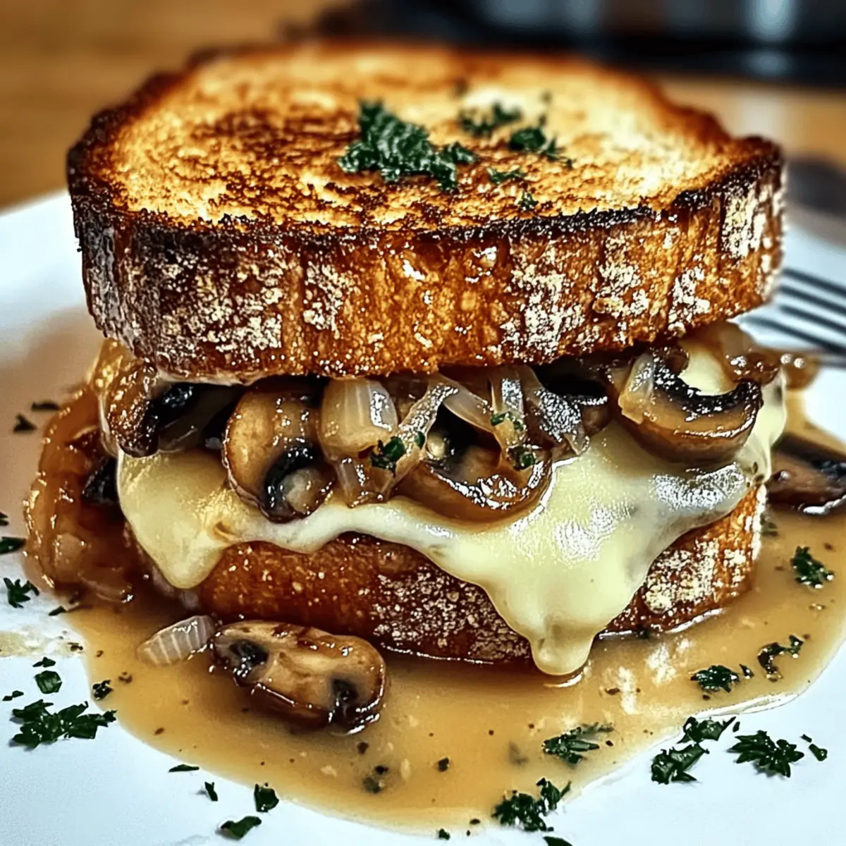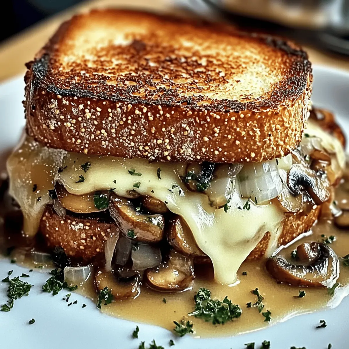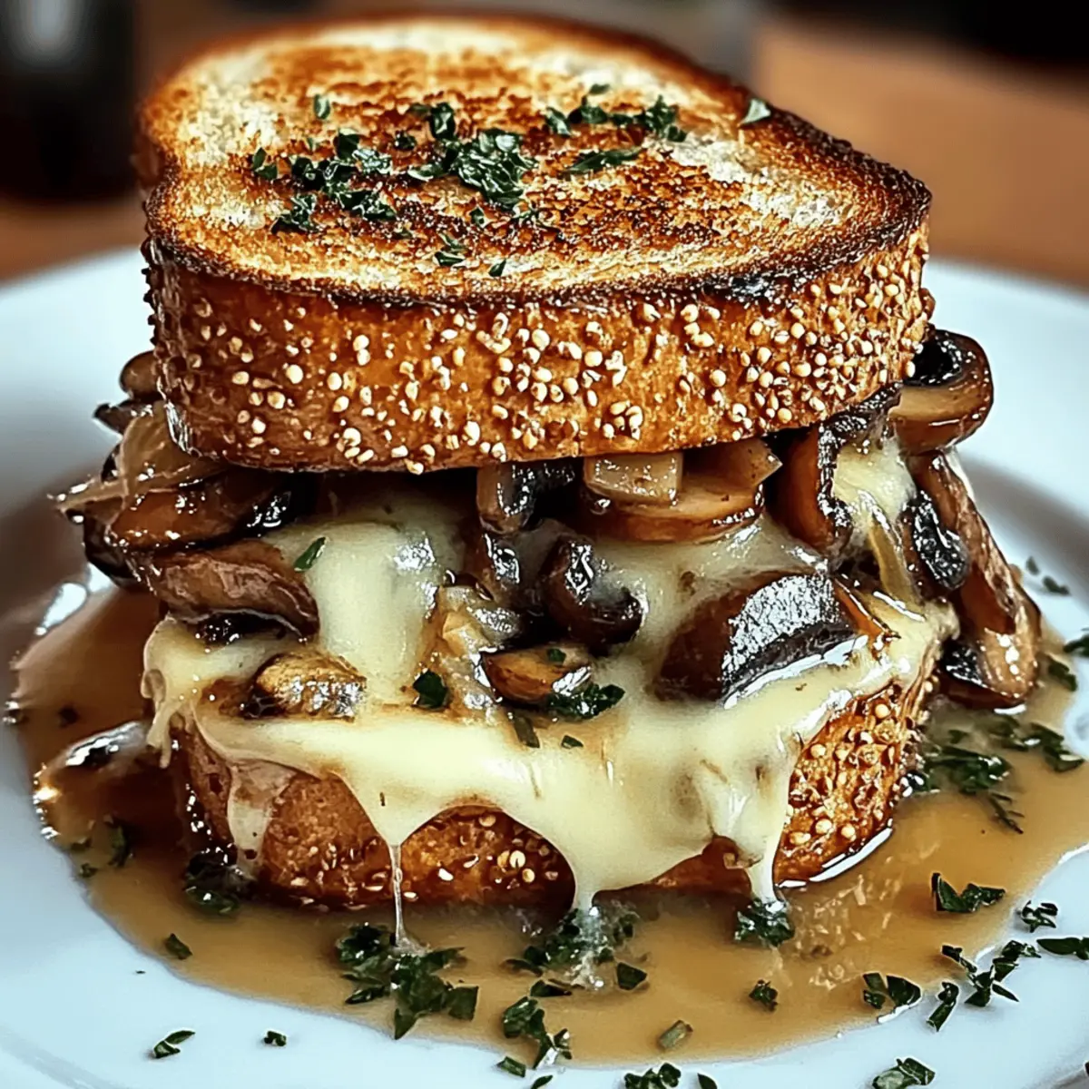 The aroma of sautéed mushrooms and caramelized onions wafting through the kitchen is a sure sign that something delightful is on the way. Today, I’m excited to share my Ultimate Swiss Mushroom Melt Sandwich—a vegetarian dream that’s brimming with flavor and comfort. It brings together the crispy crunch of golden sourdough and the luscious melt of Swiss cheese, making it perfect for a quick lunch or a cozy dinner. Not only is this recipe easy to whip up on a busy day, but it also packs a satisfying punch that’s sure to win over even the pickiest eaters. Are you ready to treat your taste buds to this scrumptious sandwich? Let’s dive in! Why is this sandwich so irresistible? Irresistible, the Ultimate Swiss Mushroom Melt Sandwich brings a blend of comforting flavors that will have you coming back for more. Quick to prepare, this easy recipe is perfect for a busy day without sacrificing taste or satisfaction. Vegetarian-friendly, it caters to all dietary preferences, making it a crowd-pleaser for family and friends. Versatile, you can easily customize it with your favorite ingredients, whether adding a zing of Dijon Mustard or mixing in some grilled halloumi. Pair it effortlessly with a side of creamy tomato soup for a full meal that feels gourmet. You’ll love every bite of this delightful, savory treat! Swiss Mushroom Melt Sandwich Ingredients Craft your own delicious sandwich masterpiece! For the Caramelized Onions Yellow Onions – Adds sweetness and depth through caramelization. Substitution: Use sweet onions for a milder flavor. Olive Oil – For sautéing onions and mushrooms; enhances flavor. Note: Can substitute with vegetable oil. Butter – Adds richness to the caramelized onions and toast. Note: Use vegan butter for a dairy-free option. Brown Sugar – Enhances sweetness of onions during caramelization. Substitution: Honey or maple syrup can be used. Balsamic Vinegar – Adds acidity and deeper flavor to caramelized onions. Substitution: Red wine vinegar works well. For the Mushrooms Cremini Mushrooms – Provides umami flavor and texture. Note: Button mushrooms can be used as a substitute. Garlic – Adds aromatic flavor to sautéed mushrooms. Note: Fresh garlic is preferred for the best taste. White Wine (Optional) – Introduces depth and helps to deglaze the skillet. Substitution: Vegetable broth for a non-alcoholic option. Fresh Thyme Leaves – Adds herbal notes to mushrooms. Substitution: Dried thyme (½ teaspoon) can be used. For the Sandwich Sourdough Bread – Base for the sandwich, offering a crispy texture when toasted. Note: Any hearty bread can work. Swiss Cheese – Melts beautifully, providing a nutty flavor. Substitution: Gruyère cheese for a stronger taste. Butter (Softened) – For spreading on bread before toasting. Note: Can use a non-dairy option. Dijon Mustard (Optional) – Introduces spice and tang. Omitting allows for a milder flavor. Step‑by‑Step Instructions for Swiss Mushroom Melt Sandwich Step 1: Caramelize Onions In a large skillet over low heat, combine 2 tablespoons of olive oil and 1 tablespoon of butter. Add 2 sliced yellow onions and cook gently for 30-45 minutes, stirring occasionally, until they become golden brown and soft. Then, stir in 1 tablespoon of brown sugar and 1 tablespoon of balsamic vinegar, allowing them to meld with the onions for added sweetness and depth. Step 2: Prepare Mushrooms Using the same skillet after removing the onions, add another tablespoon of olive oil and bring to medium heat. Sauté 8 ounces of sliced cremini mushrooms for about 8-10 minutes, or until they are well browned and tender. Add 2 minced garlic cloves and a few sprigs of fresh thyme, followed by a splash of white wine if desired, and cook until evaporated, around 2 minutes. Step 3: Assemble Sandwiches Take two slices of sourdough bread and spread about 1 tablespoon of softened butter on one side of each slice. On the unbuttered side of two slices, spread a thin layer of Dijon mustard if you choose. Begin layering the Swiss Mushroom Melt Sandwich by placing a slice of Swiss cheese, the caramelized onions, and the sautéed mushrooms onto the mustard-coated sides, topping with another slice of cheese. Step 4: Toast Sandwiches Heat the same skillet on medium-low and place the assembled sandwiches inside, unbuttered side down. Cook for 3-5 minutes, pressing lightly with a spatula, until the bread is golden brown and crispy. Carefully flip the sandwiches, reapplying a bit of butter, and cover the skillet with a lid to help the cheese melt completely for another 3-5 minutes. Step 5: Serve Once the cheese is fully melted and the bread is beautifully toasted, remove the sandwiches from the skillet and let them rest for a minute. Carefully cut each Swiss Mushroom Melt Sandwich in half, showcasing the delicious layers inside, and serve them immediately while hot and gooey. Make Ahead Options These Swiss Mushroom Melt Sandwiches are perfect for busy home cooks looking to save time! You can prepare the caramelized onions and sautéed mushrooms up to 3 days in advance. Simply store them in airtight containers in the refrigerator to maintain their freshness. When you’re ready to enjoy your sandwich, all you need to do is assemble the sandwiches with the prepped components, butter the bread, and toast them in a skillet for 3-5 minutes per side until golden and gooey. This way, you’ll have a flavorful, comforting meal with minimal effort, just as delicious as if you made it fresh! How to Store and Freeze Swiss Mushroom Melt Sandwich Fridge: Store leftover sandwiches in an airtight container for up to 3 days; reheat gently in a skillet to maintain crispness. Freezer: Wrap sandwiches tightly in plastic wrap, then aluminum foil; they can be frozen for up to 3 months. Thaw in the fridge before reheating. Reheating: For best results, reheat sandwiches in a skillet or toaster oven until the cheese is melted and the bread is toasted. Avoid microwaving to 