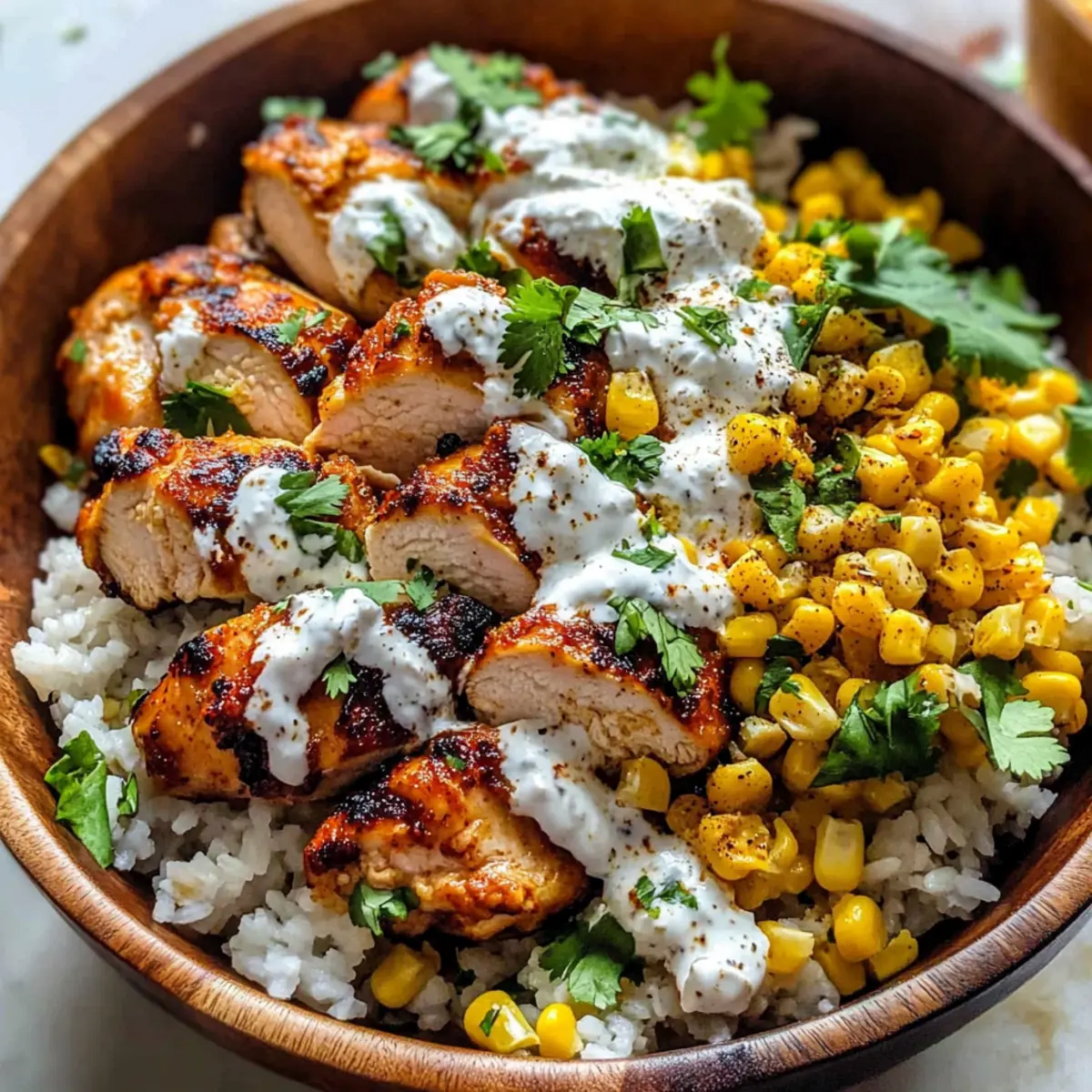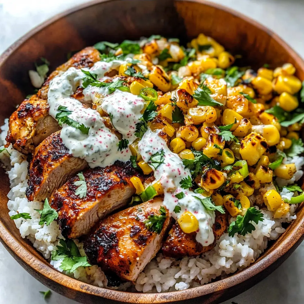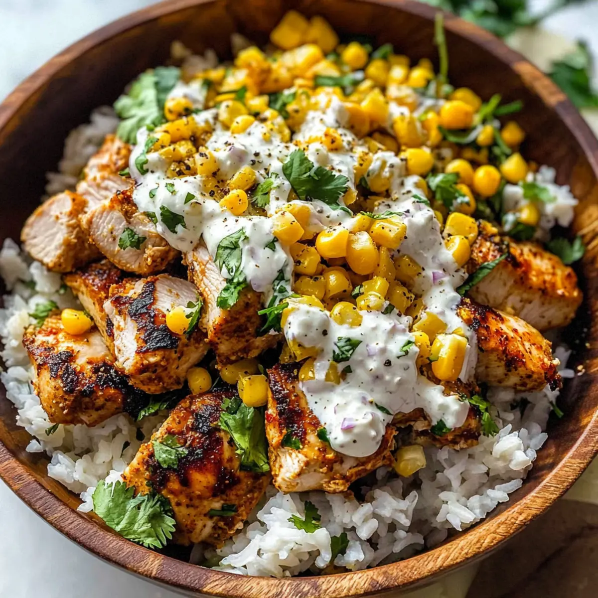 As I stood at the grocery store, the vibrant colors of sweet corn and fresh cilantro called out to me, igniting my desire for a comforting, homemade dinner. That’s when the idea for a Tasty Street Corn Chicken Bowl came to mind—an irresistible fusion of flavors that brings the warmth of Mexican cuisine right to your table. What I love most about this quick dinner is how effortlessly it transforms simple ingredients into a mouthwatering meal in just 30 minutes, making it perfect for those busy weeknights. Plus, its adaptable nature allows you to switch up the ingredients to suit your taste, whether you want a little more heat or a vegetarian twist. Ready to discover how to whip up this delightful bowl? Let’s dive into the recipe! Why is this chicken bowl a must-try? Quick and Easy: In just 30 minutes, you can serve up a restaurant-quality dish that’s perfect for hectic weeknights. Flavor Explosion: The smoky, creamy taste of this bowl captures the essence of traditional Mexican street corn, enhancing your meal experience. Adaptable Ingredients: Feel free to swap chicken for grilled shrimp or tofu based on your preferences, ensuring everyone at the table is satisfied. Texture Harmony: Enjoy the contrast of juicy chicken, creamy corn mix, and fluffy rice bringing each bite to life. Crowd-Pleaser: This dish is sure to impress family and friends, making it a go-to for gatherings or quick dinners. Looking for more delicious ideas? Try out the Honey Bourbon Chicken or enjoy a flavorful Bang Chicken Bowl for variety! Tasty Street Corn Chicken Bowl Ingredients • Get ready to whip up something delicious! For the Chicken Boneless Skinless Chicken Thighs – A juicy choice that delivers tenderness and flavor, perfect for our bowl. Freshly Squeezed Lime Juice – Brightens the dish; if you can’t find fresh, bottled works too. Avocado Oil – Ideal for marinating and searing; swap with olive oil if needed. Chili Powder – Adds the perfect kick; adjust according to your heat preference. Ground Cumin – Essential for authentic flavor; it’s best not to skip this one. Garlic Powder – Adds a savory depth; feel free to use fresh minced garlic instead. For the Street Corn Mix Sweet Corn Kernels – Offers sweetness and flavor; grilled corn is the best option! Sliced Red Onion – Adds crunch; omit if you’re not a fan of its sharpness. Sour Cream & Mayonnaise – Provides creamy goodness; substitute Greek yogurt for a lighter option. Cotija Cheese – Salty and crumbly; feta works well as an alternative. For Serving Prepared Rice – Fuels the bowl; consider brown rice for nutrition or quinoa for added protein. Fresh Cilantro Leaves – Use as a garnish for a burst of freshness; optional based on your taste. Lime Wedges – Serve alongside for that extra punch of citrus. Let’s make this Tasty Street Corn Chicken Bowl a delightful addition to your weeknight dinners! Step‑by‑Step Instructions for Tasty Street Corn Chicken Bowl Step 1: Marinate Chicken In a bowl, whisk together freshly squeezed lime juice, avocado oil, chili powder, ground cumin, garlic powder, salt, and pepper until well combined. Add the boneless skinless chicken thighs, ensuring they are thoroughly coated. Cover the bowl and let the chicken marinate for 15 to 30 minutes at room temperature, which will enhance the flavor and tenderness of the chicken for your Tasty Street Corn Chicken Bowl. Step 2: Cook Chicken Heat a large skillet over medium-high heat. Once hot, add the marinated chicken thighs to the pan, ensuring they don’t overcrowd. Sear for about 8 to 10 minutes per side, until the chicken is browned and reaches an internal temperature of 165°F. Once cooked, transfer the chicken to a cutting board and allow it to rest for 5 to 10 minutes before slicing into bite-sized pieces. Step 3: Prepare Street Corn Mix In a separate mixing bowl, combine sweet corn kernels, sliced red onion, sour cream, mayonnaise, and crumbled Cotija cheese. Season with chili powder, salt, and pepper, and add a squeeze of lime juice for brightness. Stir until all ingredients are evenly mixed. This creamy corn mixture will add a delightful texture and flavor to your Tasty Street Corn Chicken Bowl. Step 4: Warm Rice While the corn mix is coming together, heat your prepared rice in the microwave, adding a splash of water to keep it moist. Microwave for about 1 to 2 minutes or until steaming hot and fluffy. If desired, stir in chopped fresh cilantro to infuse extra flavor into the rice, creating a delicious backdrop for your Tasty Street Corn Chicken Bowl. Step 5: Assemble Bowls To assemble your Tasty Street Corn Chicken Bowl, start by dividing the warmed rice evenly into serving bowls. Layer the sliced chicken on top, followed by generous scoops of the street corn mixture. Finish with an extra sprinkle of Cotija cheese, a handful of fresh cilantro, and serve with lime wedges on the side for that zesty kick, perfect for enriching every bite. Expert Tips for Tasty Street Corn Chicken Bowl Marinate for Flavor: Enhance the chicken’s flavor by marinating for at least 30 minutes. This helps the spices penetrate thoroughly for a delicious outcome in your Tasty Street Corn Chicken Bowl. Don’t Overcrowd the Pan: When searing the chicken, avoid overcrowding to ensure even cooking and a crispy exterior. Cook in batches if necessary! Check Internal Temperature: Use a meat thermometer to confirm that the chicken reaches 165°F; this guarantees juiciness while avoiding dryness. Grill Corn for Authenticity: If using fresh corn, grill it for extra char and flavor. If using frozen, ensure it’s well-thawed and charred for the best taste. Adjust to Your Taste: Feel free to modify the chili powder based on your spice tolerance. Remember, you can always add more heat but not take it away! Serve Immediately: For the best texture, serve the Tasty Street Corn Chicken Bowl right after assembling. This keeps the ingredients fresh and vibrant, preventing soggi