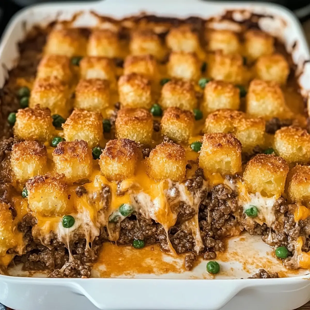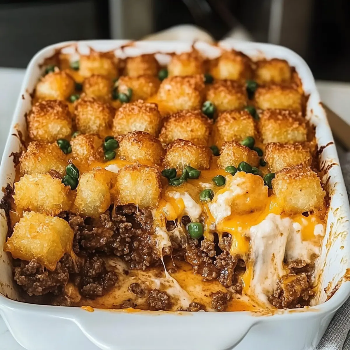As I pulled the steaming Tater Tot Casserole out of the oven, a delicious aroma filled the kitchen, instantly transporting me back to family gatherings where laughter mingled with the scent of comfort food. This hearty dish, featuring savory ground beef enveloped in a creamy mushroom sauce and layered with gooey cheddar cheese, topped with perfectly crispy tater tots, is not just a meal; it’s a tradition. Whether you’re looking for a quick and satisfying dinner on a busy night or a crowd-pleasing favorite for a potluck, this recipe delivers on all fronts. Plus, it’s wonderfully customizable—easily swap in your favorite veggies or even a different protein for a personal touch! Ready to dive into a comforting bowl of nostalgia? Let’s get cooking! Why Is Tater Tot Casserole a Family Favorite? Comfort food at its finest: This Tater Tot Casserole is the embodiment of warmth and satisfaction, perfect for those cozy evenings at home. Quick preparation: With minimal effort, you can whip up this delightful dish, making it ideal for busy weeknights. Customizable delight: Feel free to add your favorite vegetables or experiment with proteins like turkey for a lighter take. Crowd-pleasing appeal: Whether for a dinner party or a family gathering, this dish never fails to impress. It’s not just a meal; it’s a love-filled experience that brings everyone together, much like our beloved Mexican Cornbread Casserole. Tater Tot Casserole Ingredients Get ready to gather your ingredients for this comforting dish! For the Beef Mixture Ground Beef – Provides hearty protein; try using ground turkey for a leaner option. Diced Onions – Adds sweetness and depth; shallots work great if you prefer a milder flavor. Cream of Mushroom Soup – Creates a creamy base; swapping for cream of chicken offers a delicious twist. Sour Cream – Contributes tang and creaminess; Greek yogurt is a great low-fat alternative. For the Topping Shredded Cheddar Cheese – Imparts richness and gooey texture; mixing in Monterey Jack or Pepper Jack can elevate flavors. Frozen Tater Tots – Provides a crispy topping; consider using hash browns for a different crunch. This Tater Tot Casserole is truly a canvas for your creativity in the kitchen! Step‑by‑Step Instructions for Hearty Tater Tot Casserole Step 1: Preheat the Oven Begin by preheating your oven to 375°F (190°C). This temperature ensures your Tater Tot Casserole reaches the perfect doneness for a crispy topping while allowing the flavors of the beef mixture to meld together beautifully. As the oven warms up, gather your cooking tools, including a large skillet and a 9×13-inch casserole dish. Step 2: Cook the Beef In your skillet, add 1 pound of ground beef along with diced onions over medium heat. Stir the mixture frequently for about 8-10 minutes until the beef is browned and the onions are translucent, creating a savory aroma in your kitchen. Once cooked, drain any excess fat, then season the mixture with salt and pepper to taste, enhancing the flavors for your casserole. Step 3: Combine Sauces Now, stir in the creamy goodness by adding the cream of mushroom soup and sour cream to the beef mixture. Cook over low heat for an additional 3-5 minutes, mixing well until everything is fully combined and heated through. This deliciously creamy base will be the heart of your Tater Tot Casserole. Step 4: Layer Ingredients Carefully grease your 9×13-inch casserole dish to prevent sticking. Begin layering by spreading the beef mixture evenly across the bottom of the dish. Follow this with a generous layer of shredded cheddar cheese, allowing the richness to interlace with the grounded beef, creating a delicious foundation for the crispy topping. Step 5: Add Tater Tots Take the frozen tater tots and arrange them evenly over the layer of cheese. Make sure they are closely packed to ensure a uniform and crispy topping across the casserole. The tater tots will bake up beautifully, adding a satisfying crunch that complements the creamy filling beneath. Step 6: Bake the Casserole Place the casserole in your preheated oven and bake for about 25-30 minutes. Keep an eye on the tater tots as they cook; you want them to turn golden brown and crispy. The bubbling edges of the casserole will also signal that the dish is ready, filling your kitchen with a comforting aroma. Step 7: Add Final Cheese Layer After the initial baking time, remove the casserole from the oven and sprinkle an additional cup of shredded cheddar cheese over the top. Return the dish to the oven and bake for an extra 5 minutes, or until the cheese is fully melted and gooey, elevating your Tater Tot Casserole to the next level of deliciousness. Tater Tot Casserole Variations to Try Feel free to put your own spin on this comforting classic, making it even more delightful and tailored to your taste! Ground Turkey: Substitute ground beef with ground turkey for a leaner option, maintaining the same delicious flavors. Vegetable Boost: Add bell peppers, spinach, or zucchini to the beef mixture for extra nutrients and vibrant color. These veggies not only enhance the nutrition but also bring a fresh taste that contrasts beautifully with the creamy base. Creamy Chicken Alternative: Swap the cream of mushroom soup with cream of chicken for a different flavor profile, adding depth and richness to the dish. Cheese Variations: Try using a blend of cheeses like provolone or Gouda for an exciting twist, enriching the casserole with diverse flavors and textures. The melty goodness will surely elevate your dish! Spicy Kick: Add diced jalapeños or a sprinkle of red pepper flakes to spice things up, delivering a delightful heat that balances the creaminess. Hash Brown Top: For a fun texture change, replace tater tots with hash browns, providing a golden crust that’s just as satisfying. They bake up crispy and crunchy, adding an exciting new layer to your casserole. Plant-Based Delight: Use a plant-based ground meat substitu