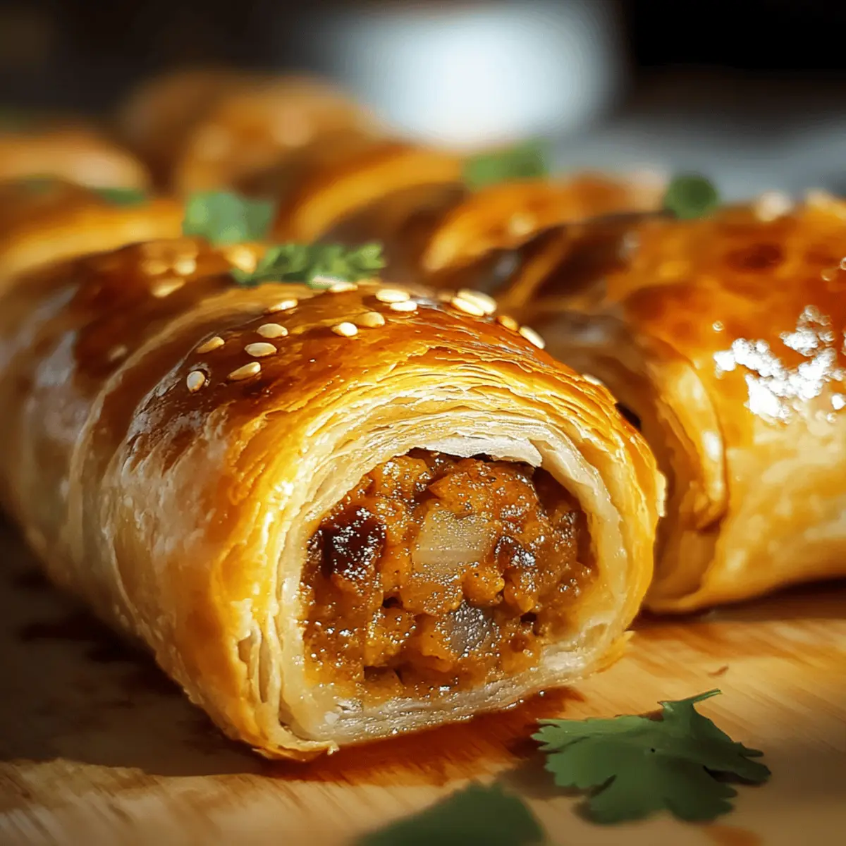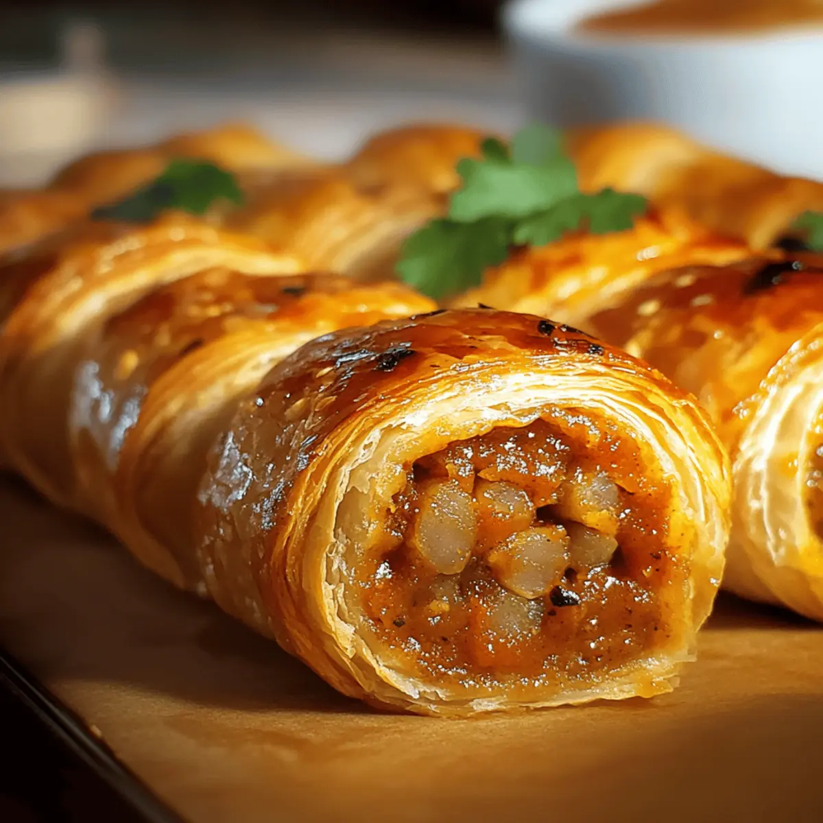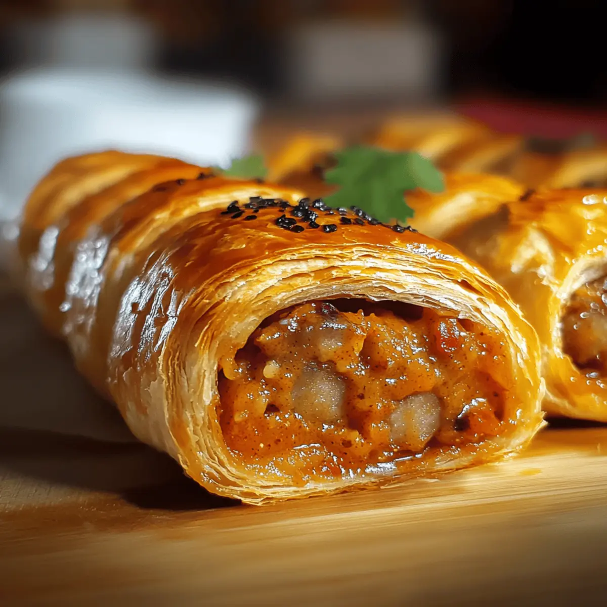 As I unwrapped that flaky pastry, the rich aroma of Thai spices filled my kitchen, making my mouth water in anticipation. These Thai Red Curry Sausage Rolls are more than just incredible appetizers; they bring a vibrant twist to traditional flavors that elevates any gathering. With just a few ingredients and a dash of creativity, you can whip up a dish that’s quick to prepare and irresistibly satisfying. Whether you’re hosting friends or simply treating yourself to a gourmet snack, these rolls promise a delightful taste adventure with every bite. Plus, there’s an option for everyone—vegetarian and gluten-free variations ensure that no one is left out of this flavor explosion! Curious to dive into this delicious fusion of Thai cuisine and comfort food? Let’s get rolling! Why are these rolls a must-try? Irresistible Fusion: Combining traditional Thai flavors with comforting sausage rolls, these treats are a culinary adventure in every bite. Perfect for Everyone: With easy substitutions for vegetarian or gluten-free options, you can cater to every dietary need without sacrificing flavor. Easy to Make: The simple preparation makes this a go-to recipe. Just fill, roll, and bake for an appetizer that’s ready in no time! Crowd-Pleasing Appetizers: Ideal for parties, these savory rolls are sure to impress guests and family alike. Serve them warm with your favorite dipping sauce for an extra zing. Experience Thai Cuisine: Dive deep into Thai culinary traditions as you savor the vibrant spices, sweetness from palm sugar, and umami from fish sauce in each mouthwatering bite. If you love unique recipes, check out Kofta Curry Flavor or explore the delightful Philly Cheesesteak Rolls for your next cooking adventure! Thai Red Curry Sausage Roll Ingredients For the Pastry • Puff Pastry – This flaky, buttery foundation gives the rolls their delightful crunch. Use butter-based for an even richer flavor. For the Filling • Sausage Mince (Pork Shoulder and Belly) – The star of the show; its fat content allows the Thai red curry flavors to really shine. Leaner options like chicken or turkey mince can lighten the dish. • Thai Red Curry Paste – This is your key flavor booster; for a homey touch, opt for homemade or a high-quality store brand. • Palm Sugar – Adds just the right amount of sweetness to balance the spices; brown sugar can step in if palm sugar is hard to find. • Fish Sauce – A touch of umami that enhances flavor; swap it with soy sauce for a vegetarian twist. • Garlic and Onions – Essential for that aromatic base that elevates the filling. • Fresh Coriander and Spring Onions – These herbs bring brightness and freshness to the filling. • Breadcrumbs (Panko) – Helps maintain a light and fluffy texture in your sausage mixture. • Egg (for Egg Wash) – Provides a beautiful golden-brown finish to the pastry. Optional Variations • Vegetarian Option – Substitute with plant-based sausage or mash chickpeas with mushrooms for a hearty filling. • Gluten-Free – Use gluten-free puff pastry and breadcrumbs to keep this delicious treat accessible to everyone. Indulge in these Thai Red Curry Sausage Rolls, where each bite offers a unique blend of flavors that are sure to tantalize your taste buds! Step‑by‑Step Instructions for Thai Red Curry Sausage Roll Step 1: Preheat the Oven Begin by preheating your oven to 190°C (fan-forced), ensuring it’s ready for those delicious Thai Red Curry Sausage Rolls. While the oven heats, prepare a baking tray by lining it with parchment paper to prevent sticking and promote even cooking. Step 2: Cook the Aromatics Heat a drizzle of oil in a large pan over medium heat. Add finely chopped garlic and onions, sautéing them for about 2-3 minutes until they become fragrant and translucent. Stir in the Thai red curry paste, palm sugar, and fish sauce, letting the mixture cook for another 2 minutes until everything is well combined and aromatic. Remove from heat and allow to cool slightly. Step 3: Combine the Filling In a mixing bowl, combine the cooled aromatic mixture with the sausage mince, panko breadcrumbs, fresh coriander, and spring onions. Gently mix until just combined, being careful not to overwork the mixture, as this will help keep your filling tender. Step 4: Assemble the Rolls Roll out your chilled puff pastry on a lightly floured surface. Cut the pastry into rectangles that can comfortably hold a generous spoonful of the sausage mixture. Place the filling in the center of each rectangle, then fold the pastry over and roll it up tightly. Seal the edges by pressing them together, and slice the rolls into smaller pieces if desired. Step 5: Bake the Rolls Transfer your assembled Thai Red Curry Sausage Rolls to the prepared baking tray. Brush the tops with an egg wash for a beautiful golden finish. Optionally, sprinkle some sesame seeds on top to enhance the texture and flavor. Bake in the preheated oven for about 25-30 minutes, or until the pastry is puffed and golden brown, filling your kitchen with irresistible aromas. Expert Tips for Thai Red Curry Sausage Rolls Chill the Pastry: Keeping the puff pastry cold helps ensure maximum flakiness when baked. If it gets warm, pop it back in the fridge briefly after rolling. Avoid Hot Filling: Let your aromatic mixture cool completely before adding it to the pastry to prevent sogginess and a greasy texture in your rolls. Perfect Egg Wash: For a rich, golden finish, use a mix of one whole egg and an egg yolk in your egg wash, giving your Thai Red Curry Sausage Rolls a professional look. Cut Evenly: When cutting the pastry, aim for similar-sized rectangles for even cooking. This way, all rolls bake uniformly and achieve that crispy texture together. Experiment with Spice: Feel free to adjust the amount of red curry paste according to your heat preference—add more for extra spice or mix in some coconut cream to mellow it out. Make Ahead Options These Thai Red Curry Sausage R