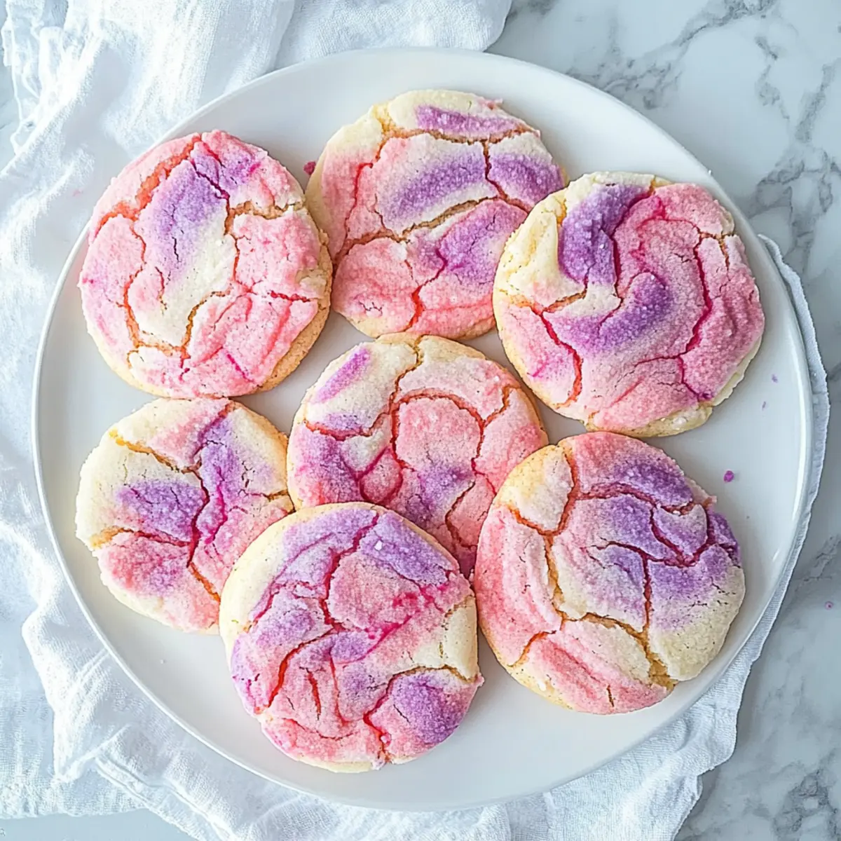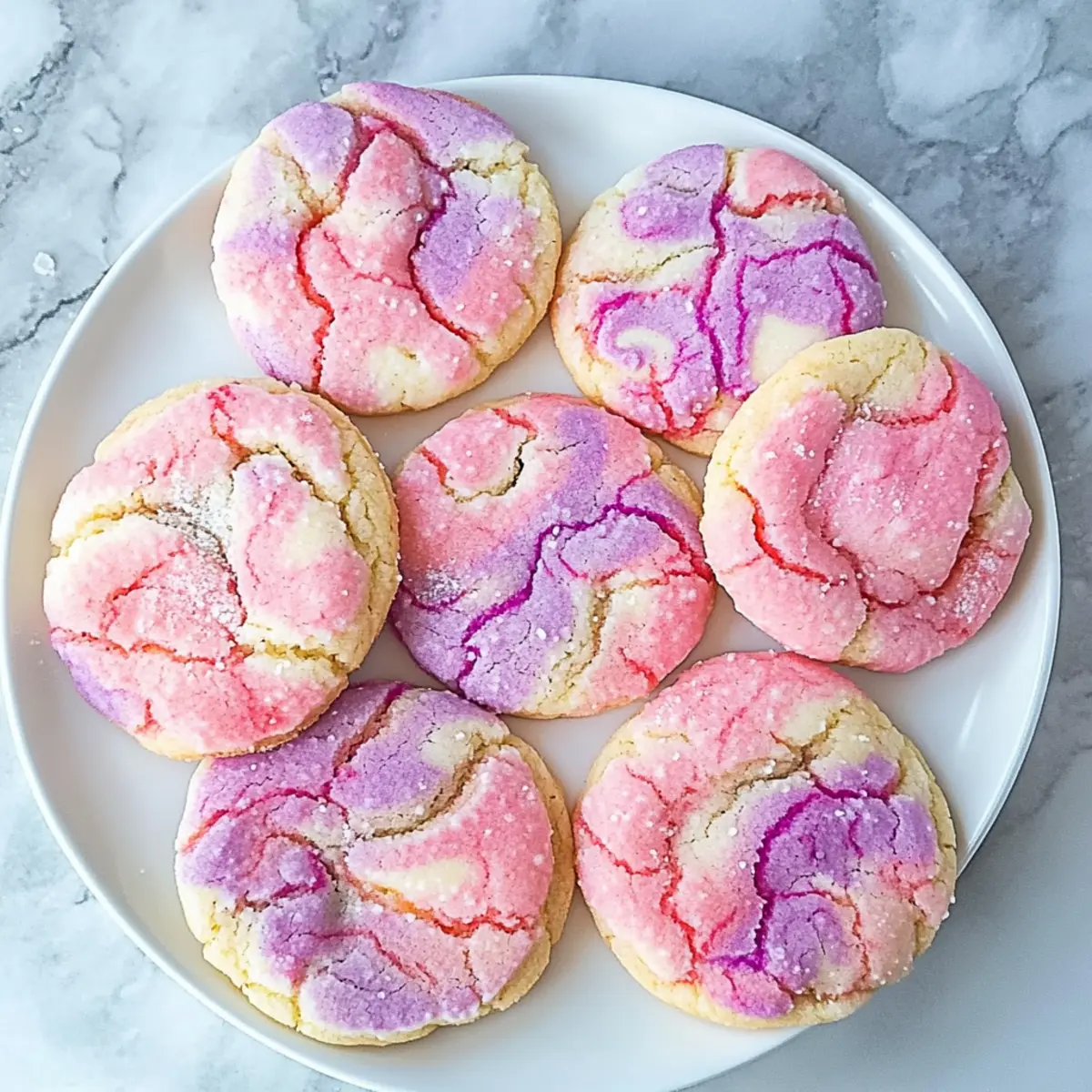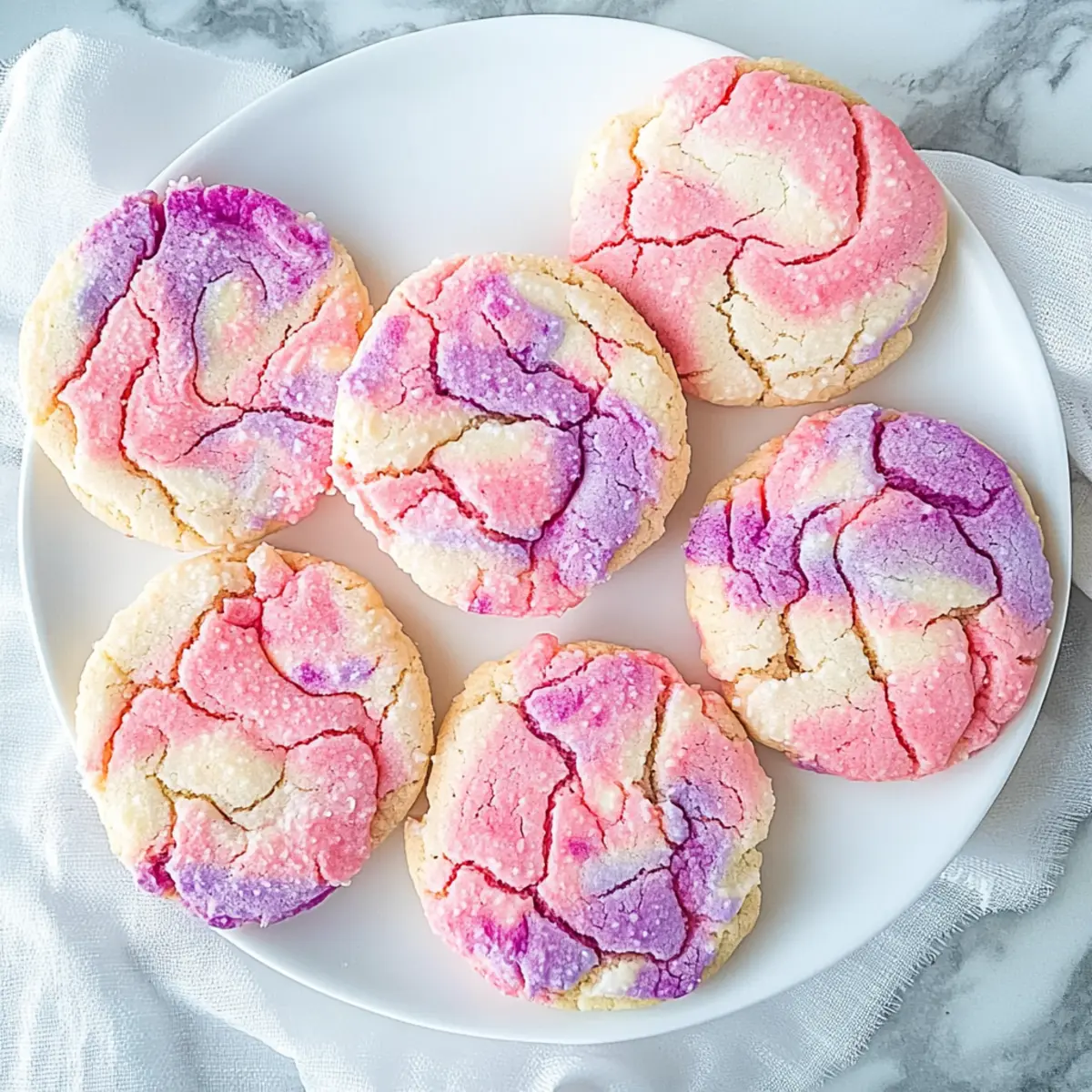 As I pulled a batch of Tie Dye Cookies from the oven, the vibrant swirls of pink and purple instantly brightened my kitchen, filling the air with a warm, buttery scent. These cookies are not just a feast for the eyes; they offer a delightful, chewy texture and a sweet taste that make them perfect for any celebration, especially Valentine’s Day. Crafted simply from a doctored cake mix, they give you a quick and easy way to elevate your homemade treats without the fuss of traditional baking. Whether you’re looking to impress guests at a gathering or indulge in a colorful dessert, these cookies are sure to become a favorite. So, are you ready to create some edible art that’s as fun to make as it is to eat? Why are Tie Dye Cookies so special? Vibrant Colors: The eye-catching pink and purple swirls will wow your guests, making these cookies a visual delight at any gathering. Simple Preparation: These cookies come together effortlessly with a cake mix, ensuring you spend less time in the kitchen and more time enjoying the fun! Chewy Texture: With a perfect balance of soft and tender, they’re unlike any store-bought treat you’ll find. Versatile Flavors: Swap the cake mix flavor for unique twists, or try colorful variations for different occasions. Consider also making Meringue Pie Cookies for another festive dessert! Crowd Pleaser: Perfect for sharing, these cookies are sure to be a hit at parties, particularly around holidays like Valentine’s Day. Tie Dye Cookies Ingredients • Get ready to create colorful magic! For the Dough 1/2 cup salted butter – Provides richness and tenderness; ensure it’s softened for easy creaming. 1/2 cup granulated sugar – Adds sweetness and helps with the cookie’s structure; substitute with brown sugar for added depth of flavor. 3 egg whites – Contributes to the cookie’s moisture and chewy texture; whole eggs can be used for a richer flavor. 1 tsp vanilla (clear preferred) – Enhances flavor without altering cookie color; use regular vanilla for a classic taste. 1 (15.5 oz) box white cake mix – Acts as the base, providing sweetness and texture; can use any cake mix flavor for different tastes. 1/2 cup all-purpose flour – Stabilizes the dough and adds structure; avoid if using cake mixes designed for cookie baking. Food coloring (pink and purple) – Creates vibrant swirls; gel-based coloring is recommended for vivid results. Step‑by‑Step Instructions for Tie Dye Cookies Step 1: Preheat the Oven Begin by preheating your oven to 350°F (180°C). This ensures that your Tie Dye Cookies bake evenly and achieve that perfect soft texture. While the oven heats up, gather your mixing bowl and electric mixer, as well as your ingredients to streamline the process. Step 2: Cream the Butter and Sugar In a mixing bowl, combine 1/2 cup of softened salted butter and 1/2 cup of granulated sugar. Using an electric mixer, cream them together on medium speed for about 1 minute until the mixture is light and fluffy. You should see the sugar crystals start to dissolve, creating a smooth base for your cookie dough. Step 3: Add Egg Whites and Vanilla Next, add 3 egg whites and 1 teaspoon of clear vanilla extract to the creamed mixture. Mix on low speed until everything is well combined, which should take about 30 seconds. Your batter should begin to appear slightly glossy, indicating that the wet ingredients are fully integrated. Step 4: Incorporate Cake Mix and Flour Gradually add the 15.5 oz box of white cake mix along with 1/2 cup of all-purpose flour to the bowl. Mix on low speed until a soft dough forms, which will take about 1-2 minutes. The dough should be thick and sticky but cohesive, ready for the magical tie-dye transformation. Step 5: Divide and Color the Dough Divide the dough evenly into three separate bowls. Dye one portion pink and another portion purple using the food coloring, leaving one bowl white. Use a spatula or your hands to gently fold the colors in, ensuring they don’t blend fully, which will preserve the vibrant hues for your Tie Dye Cookies. Step 6: Create the Tie-Dye Effect Take the colored dough portions and place them side by side on a clean surface. Lightly press the dough together, then cut it in half. Gently push the two halves back together and repeat this folding and cutting process until you achieve a delightful tie-dyed pattern, taking care not to overmix. Step 7: Shape the Cookies Using a cookie scoop, portion out the dough into balls, ensuring they are of equal size for uniform baking. Lightly flatten each ball before placing them on a lined baking sheet, leaving space between them to allow for spreading as they bake. Your colorful cookie dough is now ready for the oven! Step 8: Bake the Cookies Slide the baking sheet into the preheated oven and bake for 8-10 minutes if you’ve made small cookies, or 10-12 minutes for medium-sized ones. Watch closely for the cookies to puff up and lose their glossy sheen. They should not brown significantly; instead, they should look soft and set. Step 9: Cool Before Enjoying Once baked, remove the Tie Dye Cookies from the oven and allow them to cool on the baking sheet for a few minutes. This helps them firm up slightly before transferring to a wire rack. Let them cool completely before serving or storing, ensuring they maintain their delightful texture and vivid appearance. Make Ahead Options These Tie Dye Cookies are a fantastic choice for meal prep, making your life easier on busy days! You can prepare the cookie dough up to 24 hours in advance by mixing all ingredients and dividing it into the colored portions. Simply refrigerate the dough in an airtight container to keep it fresh and prevent drying out. When you’re ready to bake, just follow the shaping and baking instructions as usual; they will turn out just as delicious and colorful! For even longer storage, you can freeze the formed cookie balls for up to 3 months. Just allow them to thaw in the refrigerator overnight 
