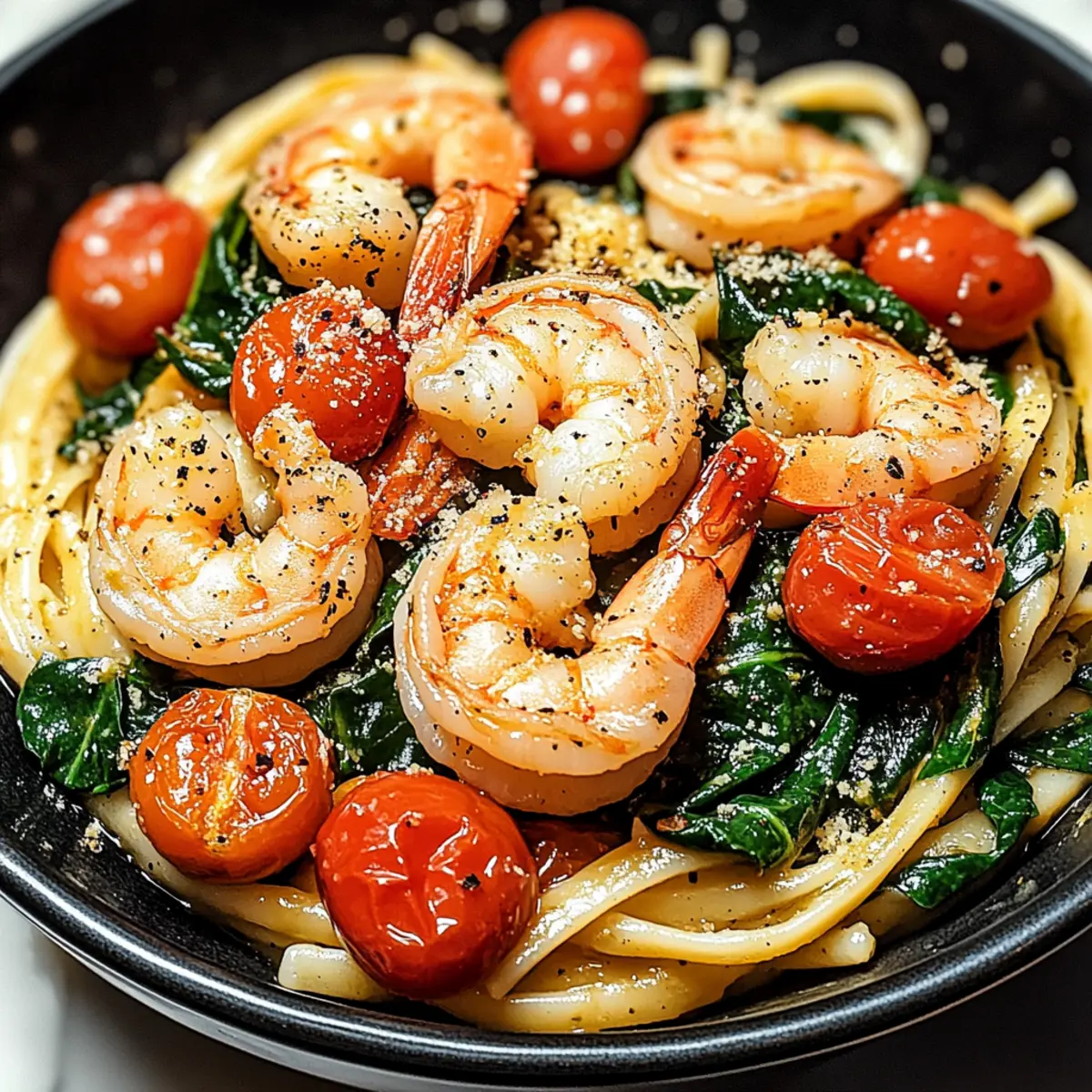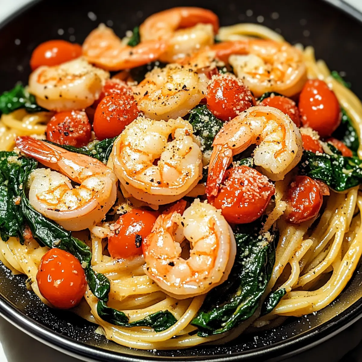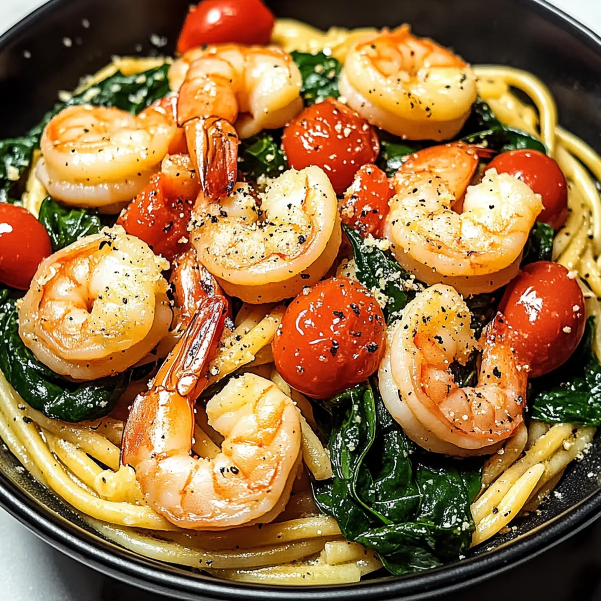 “Last night, after a long day, I found myself staring blankly at my pantry, wishing for something vibrant and satisfying without the hassle. That’s when my Mediterranean Tomato Spinach Shrimp Pasta came to the rescue! This dish captures the essence of fresh ingredients with succulent shrimp, crisp spinach, and juicy cherry tomatoes, all tossed in a quick, savory garlic and olive oil sauce. Not only is it a healthy, nutritious option that brings a taste of the Mediterranean to your table, but it also comes together in a flash—perfect for busy weeknights or impressing guests. Are you ready to elevate your dinner game with this delightful pasta recipe? Let’s dive in!” Why is this dish so delightful? Simplicity, this Tomato Spinach Shrimp Pasta is quick and easy to whip up, making it a go-to for busy nights. Flavor-packed, the combination of garlic, olive oil, and fresh ingredients creates a robust Mediterranean taste that will leave you craving more. Nutrient-rich, with shrimp and spinach providing protein and vitamins, it’s as healthy as it is delicious. Versatile, feel free to experiment with different veggies or gluten-free pasta options. Impressive, serve it at dinner parties for a gourmet touch without the complicated effort—your guests will be asking for seconds! Elevate your meals further by pairing it with a fresh salad or a crusty bread, just like in our Seafood Lasagna Shrimp or Baked Stuffed Shrimp. Tomato Spinach Shrimp Pasta Ingredients For the Pasta Pasta – Use your favorite type; gluten-free options are great for dietary needs. For the Sauce Olive Oil – Extra virgin olive oil enhances the flavor of this Tomato Spinach Shrimp Pasta. Garlic – Fresh garlic adds aromatic depth; garlic powder can work in a pinch. For the Main Ingredients Shrimp – Provides a delicious source of protein; use fresh or frozen, just remember to thaw if frozen. Spinach – Fresh spinach boosts nutrients; frozen can be a convenient substitute. Cherry Tomatoes – Their sweetness and color brighten the dish; grape tomatoes or canned diced tomatoes can be used as alternatives. For the Finish Parmesan Cheese – Adds a nutty flavor that complements the dish; nutritional yeast is a good dairy-free substitute. Salt and Pepper – Essential for seasoning; adjust to your taste. Feel free to gather these ingredients and get ready to create a pasta dish that’s sure to delight! Step‑by‑Step Instructions for Tomato Spinach Shrimp Pasta Step 1: Cook the Pasta Begin by bringing a large pot of salted water to a boil over high heat. Once boiling, add your choice of pasta and cook according to package instructions until al dente, usually around 8-10 minutes. Stir occasionally to prevent sticking. Once cooked, drain the pasta but reserve about a cup of the pasta water for later use. Step 2: Sauté Garlic and Shrimp In a large skillet, heat 2 tablespoons of extra virgin olive oil over medium heat until shimmering. Add 2-3 cloves of minced garlic, cooking for about 30 seconds until fragrant. Then, carefully add the cleaned shrimp to the skillet, sautéing until they turn pink, which takes approximately 2-3 minutes. This step is crucial for developing flavor in your Tomato Spinach Shrimp Pasta. Step 3: Add Spinach and Tomatoes Once the shrimp are beautifully pink, stir in 2 cups of fresh spinach and 1 cup of halved cherry tomatoes. Cook for another 2-3 minutes, stirring occasionally, until the spinach wilts and the tomatoes soften. You’ll see vibrant colors emerging, creating an enticing mixture that forms the base of your Tomato Spinach Shrimp Pasta. Step 4: Combine With the sauce ready, add the drained pasta directly into the skillet, tossing it with the shrimp, spinach, and tomatoes for even distribution. Pour in a splash of the reserved pasta water, and gently mix everything together until the pasta absorbs the flavors and becomes creamy. This step ensures your dish is perfectly moist and cohesive. Step 5: Serve Transfer your delicious Tomato Spinach Shrimp Pasta to serving plates. For a finishing touch, generously sprinkle with grated Parmesan cheese, and season with salt and pepper to taste. The final presentation should be vibrant and inviting, perfect for both weeknight dinners and special occasions. Expert Tips Perfectly Cooked Shrimp: Avoid overcooking by removing the shrimp from heat as soon as they turn pink. This will keep them tender and juicy in your Tomato Spinach Shrimp Pasta. Fresh is Best: For maximum flavor, opt for fresh spinach and cherry tomatoes. If you have frozen ingredients, they can work, but fresh ones make all the difference! Creamy Consistency: Reserve some pasta water and add it while tossing the mixture. It helps achieve a beautifully creamy texture without using heavy sauces. Add Zing: For an extra burst of flavor, squeeze fresh lemon juice over the dish just before serving. This brightens the taste of your Tomato Spinach Shrimp Pasta beautifully. Don’t Skip Seasoning: Always remember to season your pasta well with salt and pepper, adjusting to ensure every bite is delicious. A little can go a long way! Experiment with Varieties: Feel free to add in favorite vegetables, such as bell peppers or mushrooms, to customize your Tomato Spinach Shrimp Pasta to your taste. How to Store and Freeze Tomato Spinach Shrimp Pasta Fridge: Store leftovers in an airtight container in the refrigerator for up to 2 days. Make sure the pasta cools down before sealing to maintain freshness. Freezer: For long-term storage, freeze the pasta in a freezer-safe container for up to 3 months. Thaw in the fridge overnight before reheating. Reheating: To reheat, warm the pasta gently on the stovetop over low heat. Add a splash of olive oil or reserved pasta water to help restore moisture and creaminess. Avoid Overcooking: When reheating, take care to heat just until warmed through, especially for the shrimp, to maintain tenderness in your Tomato Spinach Shrimp Pasta. Tomato Spinach Shrimp P
