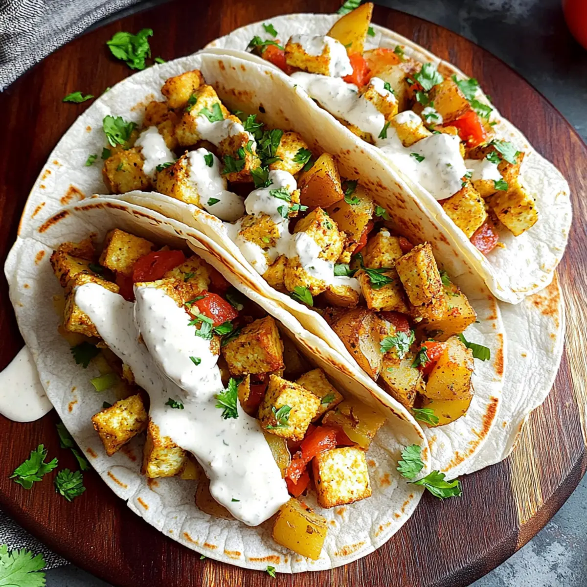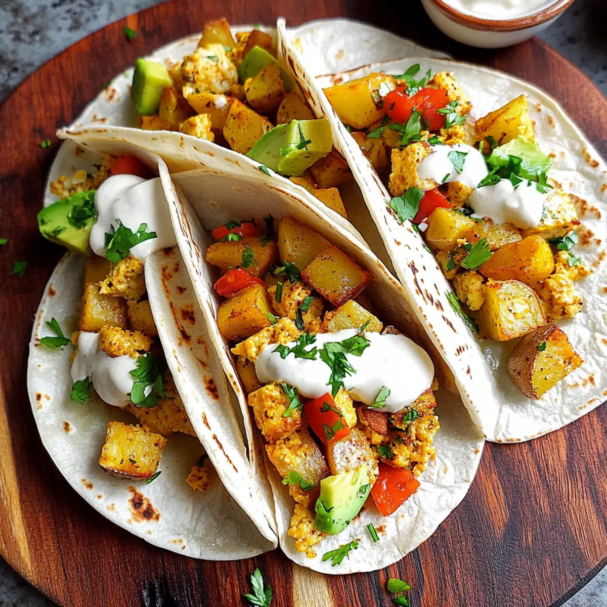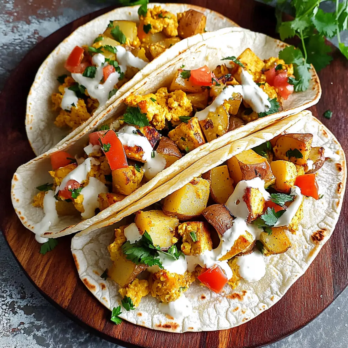 “Have you ever stared at your pantry and wished for a breakfast miracle? Well, you’re in for a treat with these Easy Vegan Breakfast Tacos that bring together a scrumptious tofu scramble and crispy roasted potatoes. Perfect for a fulfilling morning meal, these tacos are not only quick to whip up but also customizable with your favorite toppings, making them a versatile crowd-pleaser. Whether you’re looking for a plant-based option to elevate your breakfast routine or simply want to impress your family with something special, this recipe is your answer. With a delightful crunch from the potatoes and the heartiness of tofu, it’s hard not to wonder: what delicious combinations will you create with these tacos?” Why are Vegan Breakfast Tacos a must-try? Flavor-packed and delightful, these Easy Vegan Breakfast Tacos burst with a vibrant mix of spices and textures. Customizable to suit your palate, they can be filled with everything from chickpeas to fresh veggies. Quick and easy, this recipe fits perfectly into busy mornings without sacrificing taste. Plus, nutritious ingredients like protein-rich tofu and wholesome potatoes make for a satisfying start to your day. Pair them with some fresh salsa for an extra kick, and you’ll never look back at fast food again! Elevate your morning routine today! Vegan Breakfast Tacos Ingredients For the Tacos • Medium Red Potatoes – Provides heartiness; sweet potatoes can be a delightful substitution for a sweeter taste. • Garlic Powder – Adds savory depth; fresh garlic can also be used for a stronger kick. • Thyme – Offers a refreshing, herbal note; you can swap it with Italian seasoning if needed. • Sage – Enhances warmth; you can omit if unavailable, but it’s worth it for the flavor. • Paprika – Brings color and mild spice; smoked paprika adds a deeper flavor. • Cayenne Pepper – Adds heat; adjust according to your spice preference or omit for milder tacos. • Salt – To taste, elevating all the flavors beautifully. • Tofu Scramble – Acts as the protein superstar; consider using chickpeas for a soy-free alternative. Optional Add-ins • Tempeh Sausage Crumbles – For a meaty texture and added flavor. • Tomatoes – Freshness and juiciness; use cherry tomatoes for a sweeter touch. • Vegan Sour Cream – Adds creaminess; perfect for balancing spices. • Vegan Nacho Cheese – A delightful cheesy element; try it for a comforting version. • Salsa – Brings an extra kick and freshness; opt for homemade for the best flavor. Enjoy crafting your Vegan Breakfast Tacos with these delightful ingredients! Step‑by‑Step Instructions for Easy Vegan Breakfast Tacos Step 1: Preheat the Oven Begin by preheating your oven to 450°F (232°C). This high temperature will ensure your potatoes roast to golden perfection, bringing out their flavor and texture. While the oven warms up, gather your baking sheet and line it with parchment paper to prevent sticking later. Step 2: Season the Potatoes Next, take your medium red potatoes and cube them into bite-sized pieces. In a large mixing bowl, toss the cubes with garlic powder, thyme, sage, paprika, cayenne, and salt until they are evenly coated. The vibrant spices will infuse the potatoes with a delightful aroma and flavor, getting them ready for roasting. Step 3: Roast the Potatoes Spread the seasoned potato cubes onto your prepared baking sheet in a single layer. Roast them in your preheated oven for about 30 minutes, flipping the potatoes halfway through. Look for a golden-brown color and a crispy texture on the edges so that these roasted potatoes become a delicious filling for your vegan breakfast tacos. Step 4: Prepare the Tofu Scramble While the potatoes are roasting, prepare your tofu scramble. Crumble the tofu into a skillet over medium heat, using a fork or your hands. Add your choice of spices and cook for about 8-10 minutes, stirring frequently. Aim for a lightly browned and fluffy texture that complements the crispiness of the roasted potatoes in your Easy Vegan Breakfast Tacos. Step 5: Assemble Your Tacos Once your potatoes are done roasting and your tofu is cooked, it’s time to assemble your Easy Vegan Breakfast Tacos. Place a generous scoop of the tofu scramble on a tortilla followed by some roasted potatoes. Feel free to add any extra toppings such as fresh tomatoes, vegan sour cream, or salsa, making each taco uniquely yours with vibrant flavors. Step 6: Serve and Enjoy Heat your tortillas in a dry pan for a minute if you’d like them warm and crispy. This step enhances your taco-eating experience. Serve your delightful tacos with a side of fresh salsa or salad for a complete breakfast, savoring each bite of your homemade creation that’s a delicious alternative to fast food. Make Ahead Options These Easy Vegan Breakfast Tacos are fantastic for meal prep, saving you precious time on busy mornings! You can prepare the roasted potatoes and tofu scramble up to 3 days in advance. Simply cook the potatoes and tofu as instructed, then let them cool completely before storing them in separate airtight containers in the refrigerator. To maintain their quality, make sure the potatoes are completely cooled to prevent sogginess. When you’re ready to enjoy your tacos, just reheat the components in a skillet until warmed through, assemble with tortillas and your favorite toppings, and you’ll have a delicious breakfast ready in minutes! Enjoy the convenience of a homemade meal without the morning rush. What to Serve with Easy Vegan Breakfast Tacos These delightful breakfast tacos offer a wonderful starting point for a vibrant morning feast that’ll please the whole family. Fresh Salsa: A bright salsa bursts with flavor, adding a refreshing kick that complements the savory tacos beautifully. Avocado Slices: Creamy avocado provides richness and balances the spice, creating a delightful texture contrast with the crispy potatoes. Light Salad: A side of mixed greens dr