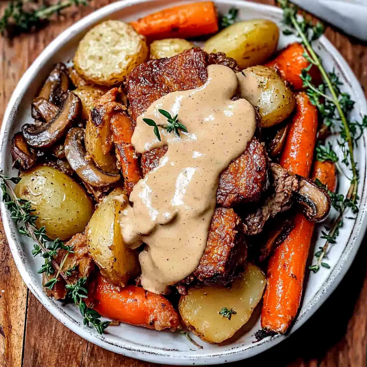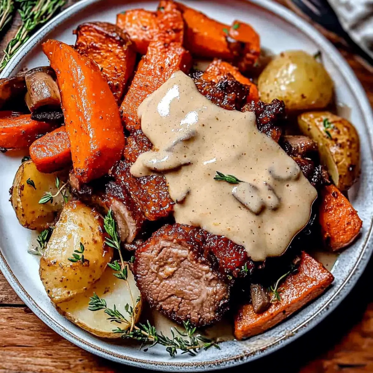 Gather around the table—there’s something truly special about a cozy Sunday dinner that brings families together. This Epic Vegan Sunday Roast Dinner with Gravy takes the beloved tradition of a comforting roast and gives it a delicious plant-based twist. With savory seitan roast beef surrounded by tender root vegetables and a creamy mushroom gravy, this dish is not only a showstopper but also a healthy upgrade for anyone looking to enjoy a hearty meal without the guilt. Perfect for festive occasions or an intimate gathering, this recipe is quick to prepare and sure to please both vegan and omnivore palates alike. Are you ready to create a new family favorite that’s packed with flavor and love? Why is this Vegan Roast a Must-Try? Gather ‘Round: This recipe brings people together, making every Sunday feel like a special occasion. Savory Comfort: The plant-based seitan roast pairs perfectly with a creamy mushroom gravy, ensuring every bite is packed with flavor. Easy Preparation: Just a few simple steps transform fresh ingredients into a comforting masterpiece, perfect for even novice chefs. Healthier Choice: Enjoy all the indulgence of a traditional roast with none of the guilt—plant-based never tasted so good! Versatile & Fun: Mix up the root vegetables based on the season, or explore additional spices for unique flavors each time you make this dish. Crowd Pleaser: Whether vegan or not, everyone at your table will love this hearty roast, making it a fantastic addition to any gathering. Consider serving it alongside Garlic Lime Shrimp or a fresh green salad for a balanced meal. Vegan Sunday Roast Dinner with Gravy Ingredient Breakdown Marinade / Basting Liquid: Vegan Worcestershire Sauce – Enhances depth of flavor; Substitution: Use tamari for a gluten-free option. Soy Sauce – Adds saltiness and umami; Substitution: Coconut aminos for a soy-free variant. Melted Vegan Butter (or Olive Oil) – Provides richness; Substitution: Any plant-based fat. Dry Red Wine – Contributes complexity and richness; Substitution: Replace with veggie stock for a non-alcoholic version. Brown Sugar – Balances flavors with sweetness. Dried Thyme – Adds earthy notes. Fresh Rosemary – Introduces fragrant herbal aromas; Substitution: Use half the amount of dried rosemary. Vegetables: Yellow or Red Onion – Provides sweetness and aroma. Carrots – Adds sweetness and color. Celery Stalks – Adds freshness and crunch. Yukon Gold Potatoes – Offers creaminess and structure in the roast. Seitan Roast (Dry): Vital Wheat Gluten – Main component for a chewy texture and protein source; Essential for making seitan. Nutritional Yeast – Adds a cheesy flavor. Garlic Powder – Provides savory depth. Smoked Paprika – Offers a smoky taste. Ground Mustard – Enhances flavor profile with tanginess. Seitan Roast (Wet): Canned Chickpeas – Imparts moisture and texture. Yellow Onion (Minced) – Adds flavor. Soy Sauce – Provides supporting flavor in the wet mix. Vegan Worcestershire Sauce – Adds additional depth. Extra Virgin Olive Oil – Adds fat for richness. Tomato Paste – Complements flavors with richness. Veggie Stock – Adds moisture and flavor. Step‑by‑Step Instructions for Vegan Sunday Roast Dinner with Gravy Step 1: Prep Marinade & Vegetables In a medium bowl, combine the vegan Worcestershire sauce, soy sauce, melted vegan butter, dry red wine, brown sugar, dried thyme, and fresh rosemary. Whisk until well blended. Meanwhile, chop your root vegetables—onion, carrots, celery, and potatoes—and scatter them across a greased 9×13” baking dish to ensure even roasting. Step 2: Prepare Seitan In a large mixing bowl, whisk together the vital wheat gluten, nutritional yeast, garlic powder, smoked paprika, and ground mustard. In a food processor, pulse the canned chickpeas and minced onion until smooth. Transfer this mixture into the dry ingredients, adding soy sauce, vegan Worcestershire sauce, extra virgin olive oil, tomato paste, and veggie stock. Mix thoroughly, then knead for about 1 minute to form a moist, cohesive seitan loaf. Step 3: Roasting Preheat your oven to 375°F (190°C). Once your seitan is shaped into a log, place it alongside the chopped vegetables in the baking dish. Drizzle ¾ of the prepared marinade over everything, ensuring even coverage. Cover the dish with aluminum foil and bake for 45 minutes, allowing the flavors to meld while the vegetables begin to soften. Step 4: Add a Caramelized Finish After the initial baking time, remove the foil and baste the seitan and vegetables with the remaining marinade, stirring the veggies gently. Return the uncovered dish to the oven and bake for an additional 20-25 minutes. Watch for the seitan to develop a beautiful golden-brown crust and for the vegetables to become caramelized and tender, signaling they are ready to join your Vegan Sunday Roast Dinner with Gravy. Step 5: Slice and Serve Once finished, take the dish out of the oven and let it cool for 5-10 minutes. This resting time allows the flavors to settle. Carefully slice the seitan log into thick pieces, ensuring each slice showcases the savory texture. Serve warm with the caramelized vegetables and generous spoonfuls of creamy mushroom gravy for an unforgettable Sunday meal that delights and comforts. Expert Tips for Vegan Sunday Roast Kneading Time: Avoid over-kneading: Just one minute ensures your seitan remains tender rather than tough, achieving the perfect chewy texture. Marinade Magic: Allow time to absorb: Slice the seitan log before marinating to let the flavors permeate deeply, making every bite delicious in your Vegan Sunday Roast Dinner with Gravy. Veggie Choices: Seasonal Swap: Feel free to replace root vegetables based on what’s fresh and available, adding a personal touch to your roast. Basting Brilliance: Keep it moist: Baste your seitan and veggies during the second half of baking to enhance caramelization and keep them juicy. Resting Period: Be 