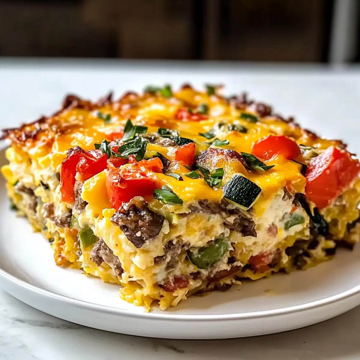 Preheat your oven to 375°F (190°C). Grease a 9×13-inch baking dish with butter or cooking spray. Begin layering the casserole by spreading thawed hash browns evenly across the bottom, followed by spooning your sautéed vegetables and optional sausage on top. Finish by sprinkling a generous layer of shredded cheddar cheese for a deliciously melty topping.