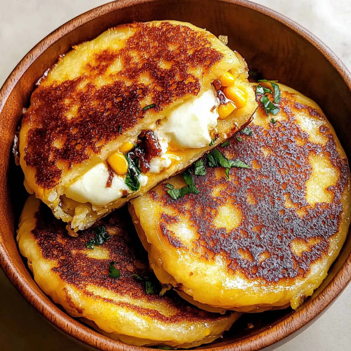 As I flipped the golden pancakes on my skillet, the sweet aroma of corn filled my kitchen, transporting me straight to the vibrant streets of Venezuela. Today, I’m excited to share my recipe for Venezuelan Sweet Corn Cachapas with Melty Mozzarella, a dish that’s as comforting as it is delicious. These delightful corn pancakes offer a unique sweetness combined with a tender texture, perfect for a quick snack or an impressive breakfast. What’s more, these cachapas can easily be adapted to fit dietary needs—whether you’re vegetarian or looking for gluten-free options, I’ve got you covered. With just a few ingredients, you can create a crave-worthy treat that will impress family and friends. Are you ready to bring a taste of Venezuela into your home? Let’s dive in! Why are Cachapas a Must-Try? Comforting, cachapas bring the delightful tastes of Venezuelan street food right to your kitchen. Quick to make, you’ll spend just a few minutes preparing these golden pancakes, even on a busy weekday. Customizable, cater to your dietary needs by swapping in gluten-free flour or dairy-free cheese. Flavorsome, the sweet corn perfectly complements the melty mozzarella, creating a mouthwatering treat. Pair them with crispy bacon or drizzle honey for an extra treat! Don’t forget to check out my other favorites like Mexican Cornbread Casserole or Lemon Pistachio Cookies for more delicious ideas! Venezuelan Sweet Corn Cachapas Ingredients • Get ready to create a delicious treat! For the Batter Sweet Corn – Provides the signature sweetness and soft texture of cachapas; use fresh or thawed frozen corn. Large Egg – Adds richness and helps bind the ingredients together snugly. All-Purpose Flour – Provides structure to the pancakes; feel free to substitute with gluten-free flour for a gluten-free version. Salt – Enhances the overall flavor profile and balances the sweetness. Granulated Sugar – Adds a touch of sweetness; honey is a great floral alternative for extra flavor. For Cooking Vegetable Oil – Used for cooking the cachapas to achieve a golden, crispy exterior; olive oil can be used as a healthy alternative. For the Filling Buffalo Mozzarella Cheese – Offers a classic creamy filling that melts beautifully; can be replaced with soft cheeses like queso de mano or a dairy-free cheese. Optional Topping Unsalted Butter – A pat of butter adds richness when cachapas are served warm, elevating their flavor. These Venezuelan Sweet Corn Cachapas are a must-try and come together with these simple ingredients! Step‑by‑Step Instructions for Venezuelan Sweet Corn Cachapas Step 1: Blend the Batter In a blender, combine sweet corn, egg, flour, salt, and sugar. Blend until the mixture is mostly smooth, ensuring some corn texture remains to enhance the cachapas. This will take about 30–45 seconds. The batter should look creamy yet still contain small bits of corn. Step 2: Prepare the Pan Heat a large skillet or griddle over medium heat for about 3 minutes. Once hot, add a tablespoon of vegetable oil and swirl it around to coat the surface. The oil should shimmer slightly, indicating it’s ready for cooking. Step 3: Cook the Cachapas Spoon about 60 ml of the batter onto the hot skillet for each cachapa, gently spreading it into a circle with a spatula. Cook for 3–4 minutes, or until the edges start to set and the bottom is golden brown. Flip carefully and cook the other side for another 3–4 minutes until crisp and golden. Step 4: Add the Cheese Once cooked, place slices of buffalo mozzarella in the center of each cachapa. Fold them in half to allow the cheese to melt gently inside. Cook for an additional 1–2 minutes, watching for the cheese to become gooey and irresistible. Step 5: Serve Warm Top each cachapa with a pat of unsalted butter while still warm, allowing it to melt over the surface. Serve immediately for the best experience, either plain or with your favorite dipping sauce to enhance the flavors of these delightful Venezuelan Sweet Corn Cachapas. Expert Tips for Venezuelan Sweet Corn Cachapas Fresh Ingredients: Use the freshest corn possible for the sweetest flavor and best texture. Frozen corn works in a pinch, but fresh is key! Texture Matters: Blend the corn mixture until just mostly smooth. Overblending will turn the batter too creamy and lose that delightful corn texture. Cooking Oil: Make sure your oil is hot enough before adding the batter. A shimmering surface indicates it’s ready; this helps create that crispy exterior. Cheese Choices: Choose high-quality buffalo mozzarella for the best melting experience. For a dairy-free version, try cashew or almond-based cheeses. Storage Solution: Unfilled cachapas can be stored in an airtight container for up to three days. Reheat in a dry skillet to keep them crispy for ultimate enjoyment! Make Ahead Options These Venezuelan Sweet Corn Cachapas are perfect for meal prep enthusiasts! You can prepare the batter up to 24 hours in advance. Simply blend the sweet corn, egg, flour, salt, and sugar as directed, then store the batter in an airtight container in the refrigerator. This will save you time on busy mornings. You can also cook the cachapas without the cheese filling and refrigerate for up to 3 days; just remember to separate them with parchment paper to prevent sticking. When ready to serve, heat a skillet, add the cheese filling, and briefly warm the cachapas, allowing the cheese to melt for just as delicious results. Enjoy the convenience of homemade goodness anytime! How to Store and Freeze Venezuelan Sweet Corn Cachapas Fridge: Place unfilled cachapas in an airtight container, layered with parchment paper, and store for up to three days. Reheat in a dry skillet to retain crispiness. Freezer: Stack unfilled cachapas with parchment between them and freeze for up to one month. To enjoy, reheat directly from frozen on a skillet, then fill with cheese as needed. Reheating: For best results, reheat cachapas on the s