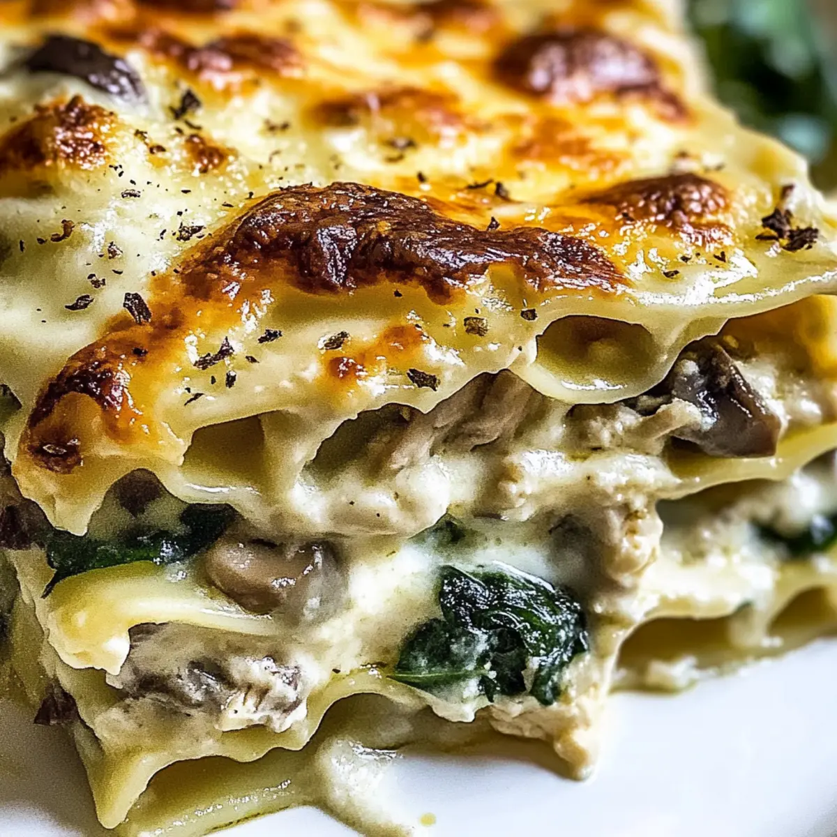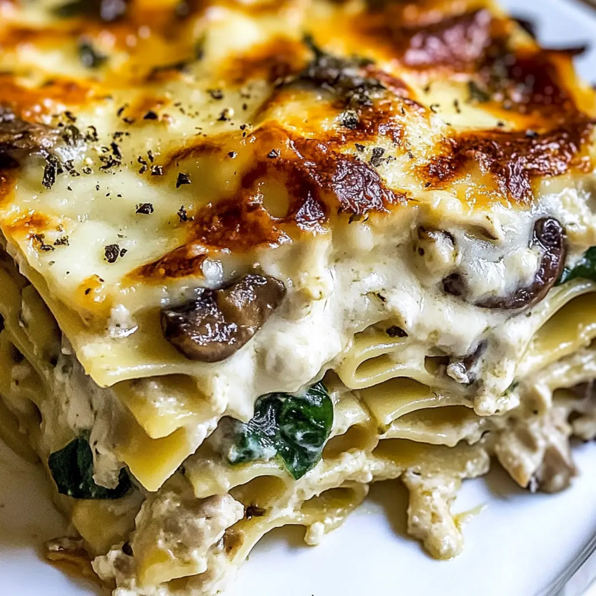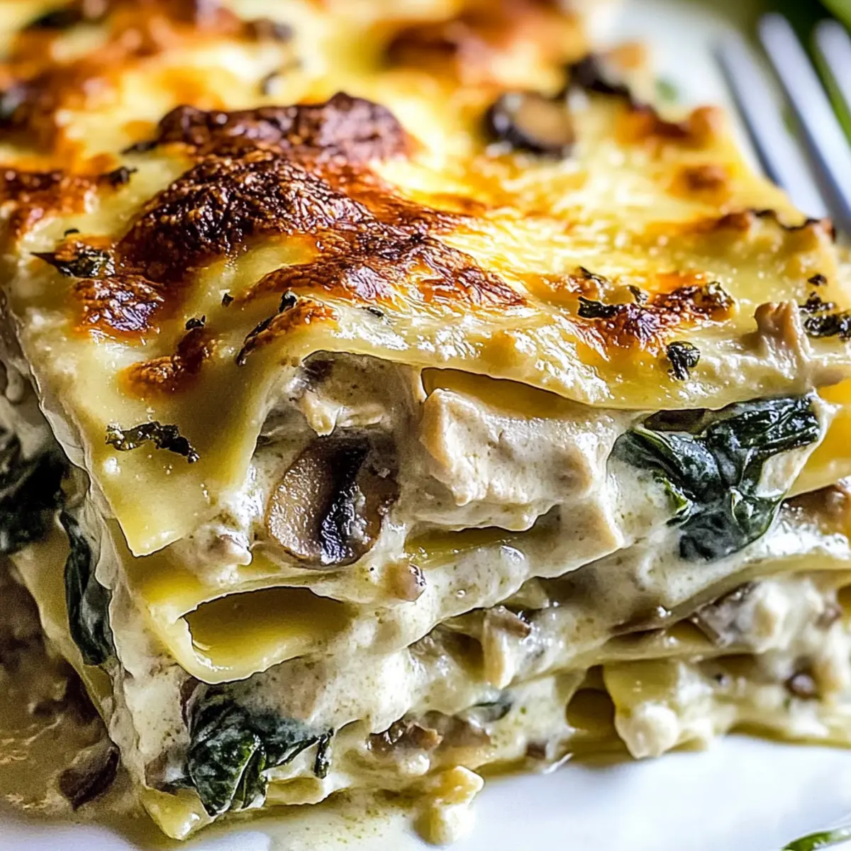 Creamy, Comforting Layers: This White Chicken Lasagna is built on layers of tender chicken, earthy mushrooms, and fresh spinach, making every bite a comforting experience.